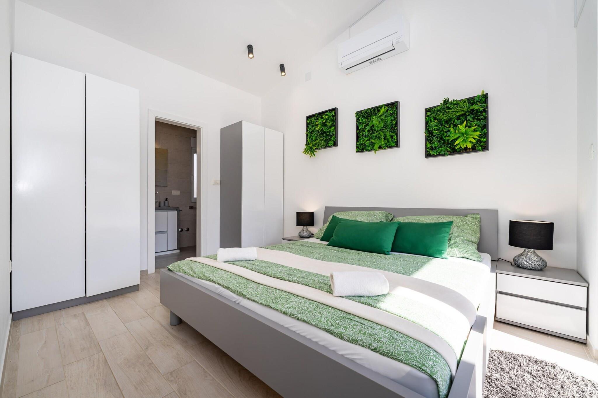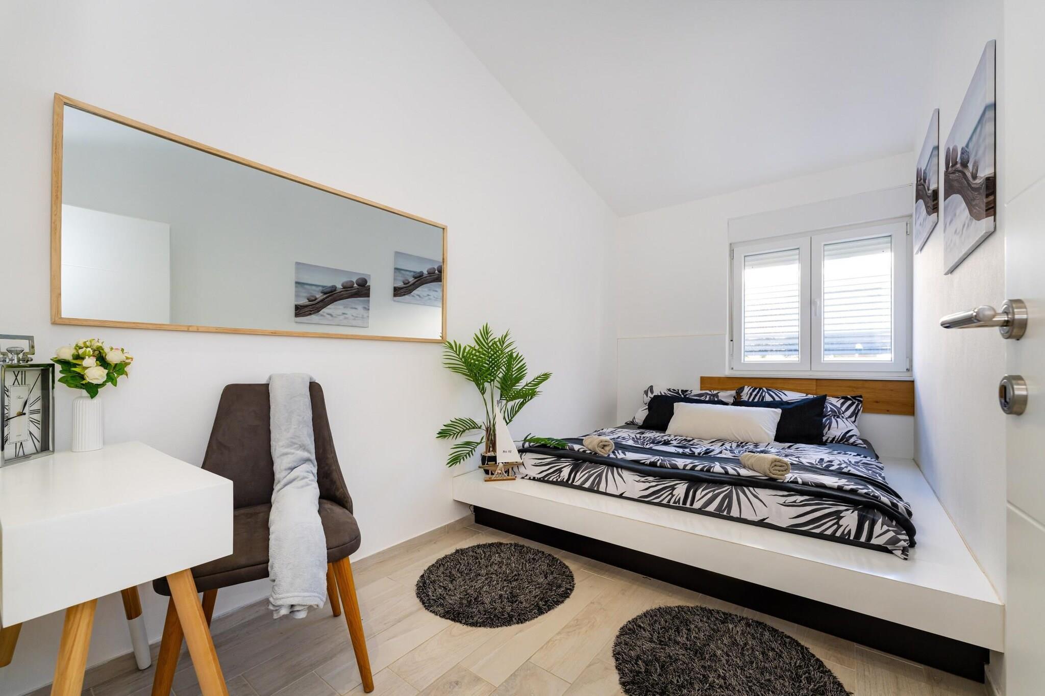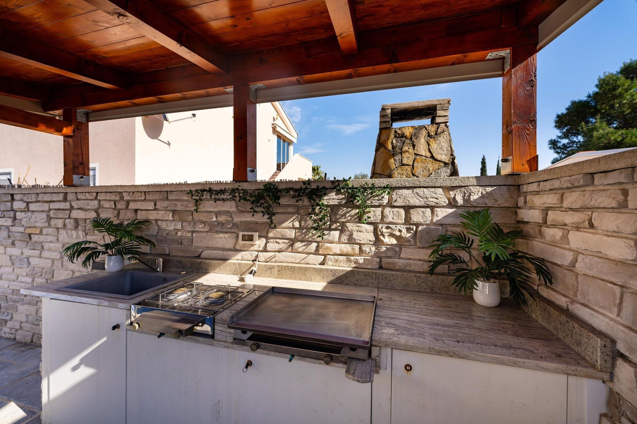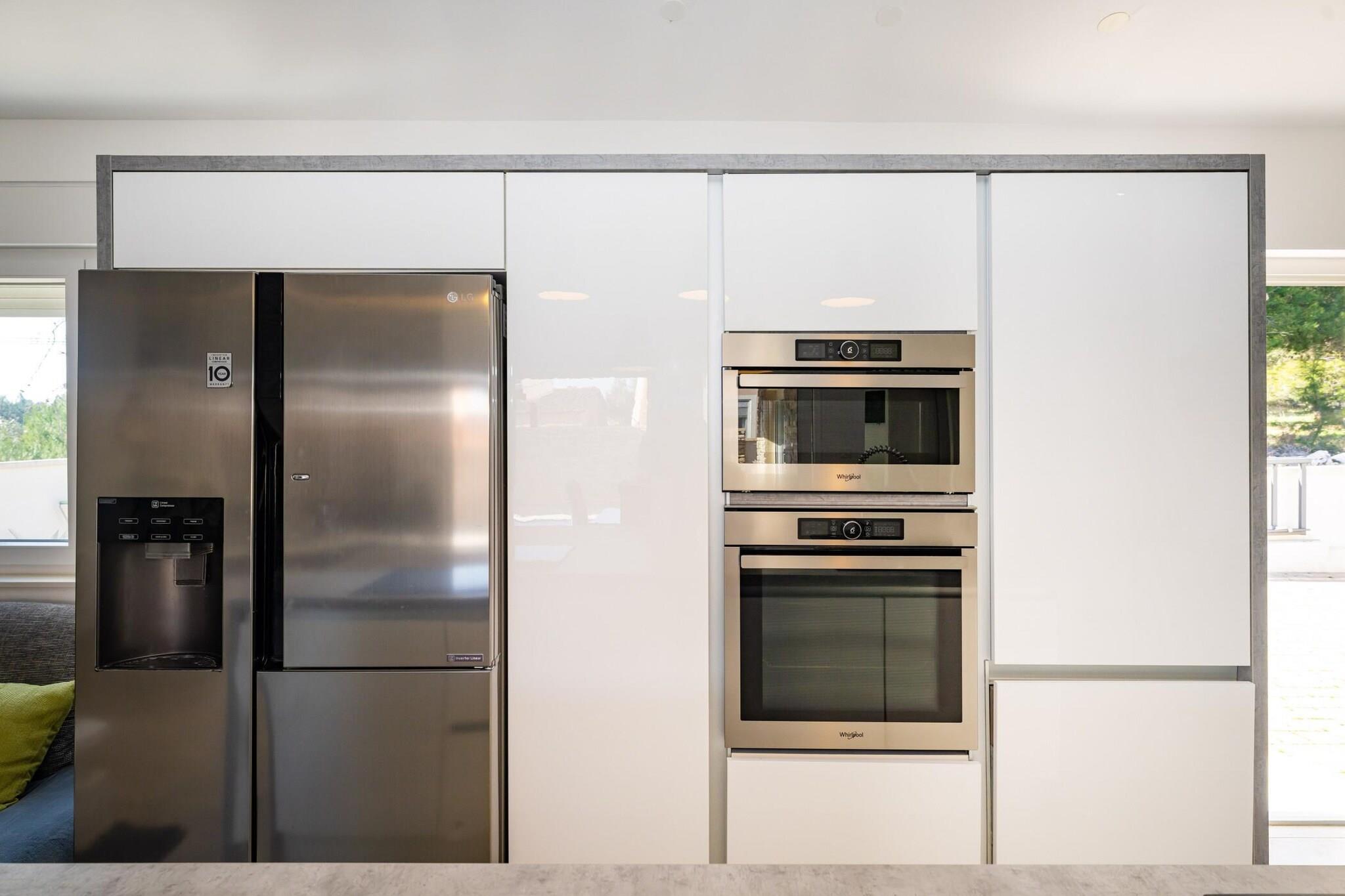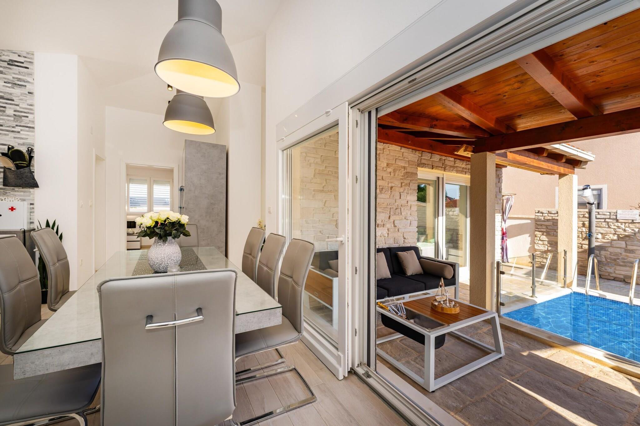 Dette moderne feriehus ligger kun en kort gåtur fra Virs turkisblå kyst og lover en afslappende ferie ved havet fyldt med solskin, komfort og ubesværet stil. Det er perfekt designet til familier eller små grupper og kombinerer en forfriskende privat pool, elegant interiør og indbydende udendørsarealer, der gør hvert øjeblik til en ægte ferieoplevelse. Indenfor byder huset dig velkommen med en lys, åben stue og spiseplads, der går direkte over i et elegant, fuldt udstyret køkken. Store vinduer bader rummet i naturligt lys og skaber en varm og luftig atmosfære. Med tre hyggelige, klimatiserede soveværelser og to moderne badeværelser kan huset komfortabelt rumme op til syv gæster, hvilket sikrer både privatliv og samvær. Træd ud i din egen private oase – en smukt indhegnet gårdhave med en glitrende swimmingpool omgivet af liggestole, et udekøkken, en overdækket spiseplads og et stilfuldt loungeområde, der er perfekt til dovne eftermiddage eller sommermiddage under stjernerne. Alt, hvad du har brug for til at slappe af, er lige her – fra solbruser og grill til hurtig Wi-Fi-forbindelse og privat parkering. Beliggende i et fredeligt boligområde tilbyder huset det bedste fra begge verdener, ro og bekvemmelighed. Stranden ligger kun 250 meter væk, hvilket er ideelt til morgensvømning eller solnedgangsvandringer, mens det livlige centrum af Vir med sine caféer, restauranter og butikker ligger en behagelig 20 minutters gåtur derfra. Inden for rækkevidde ligger den historiske by Nin og den livlige by Zadar, der er kendt for deres rige arv og smukke strande. For naturelskere lover dagsture til nærliggende nationalparker som Paklenica, Krka, Plitvice eller Kornati uforglemmelige oplevelser.
