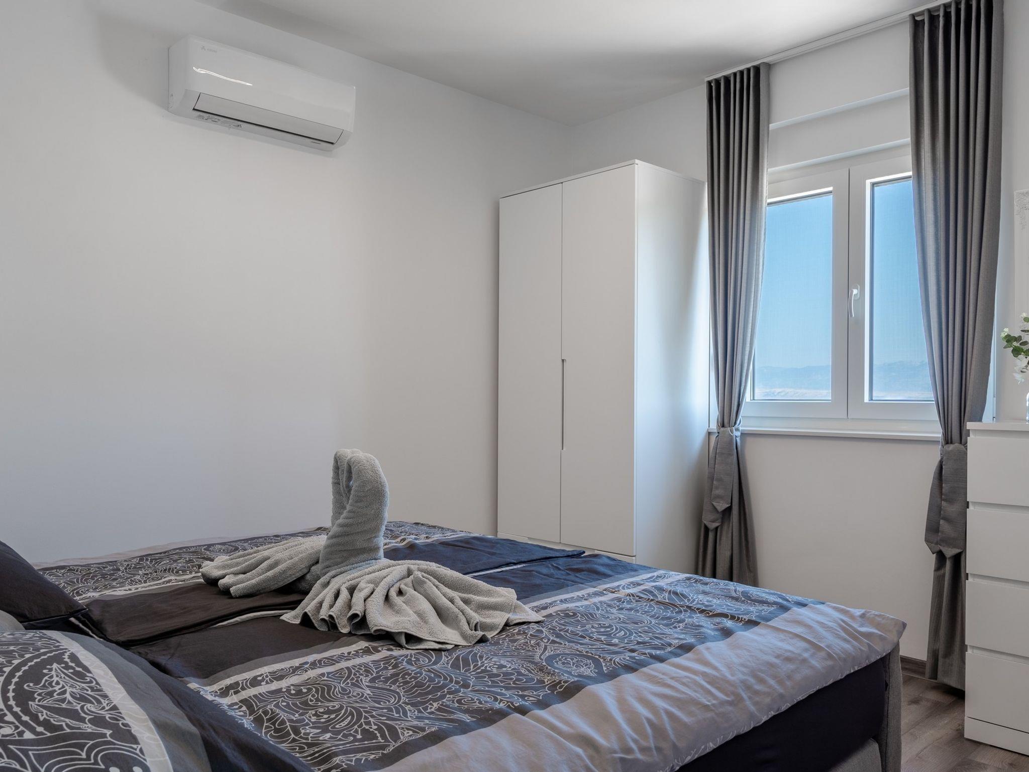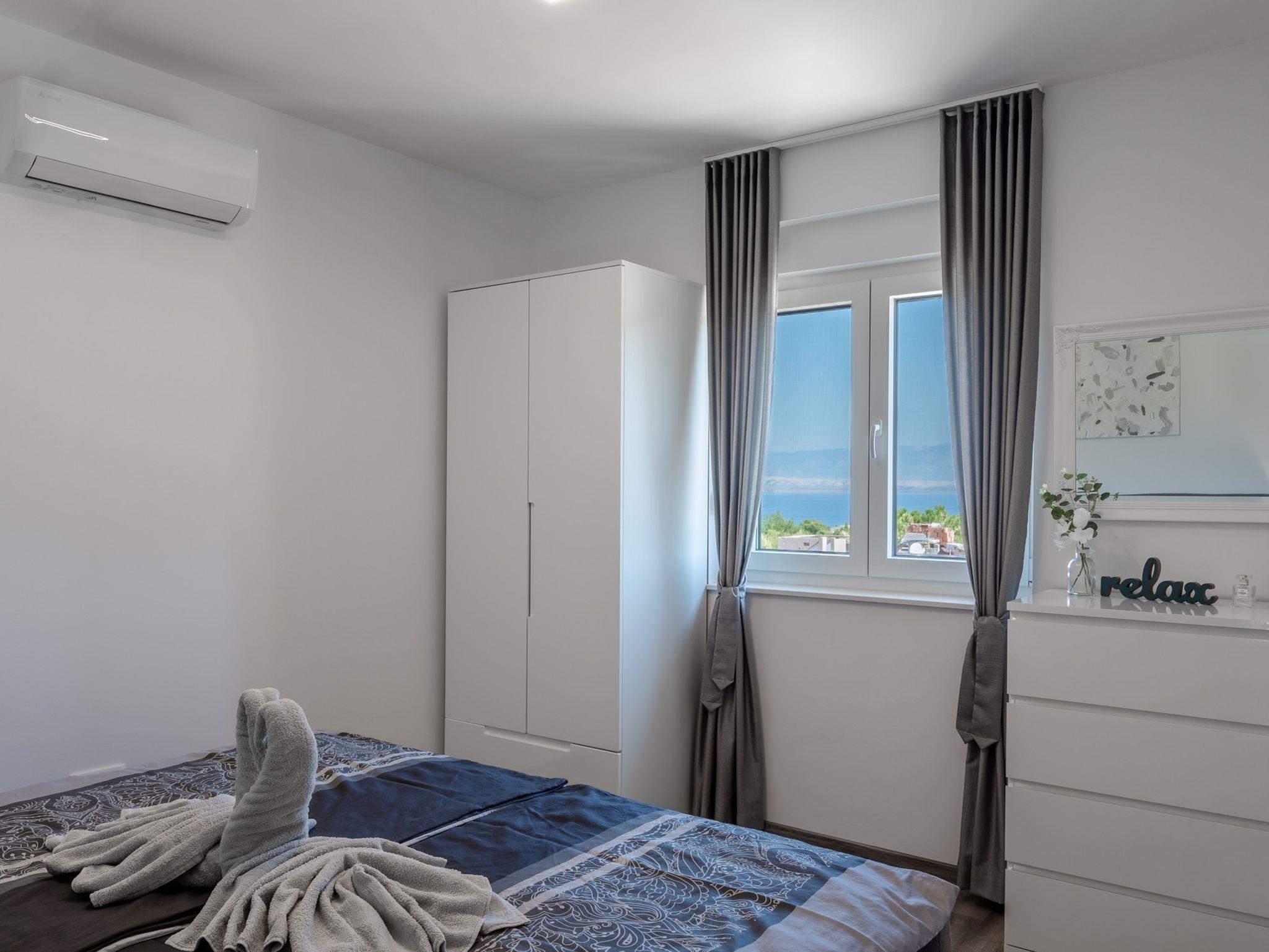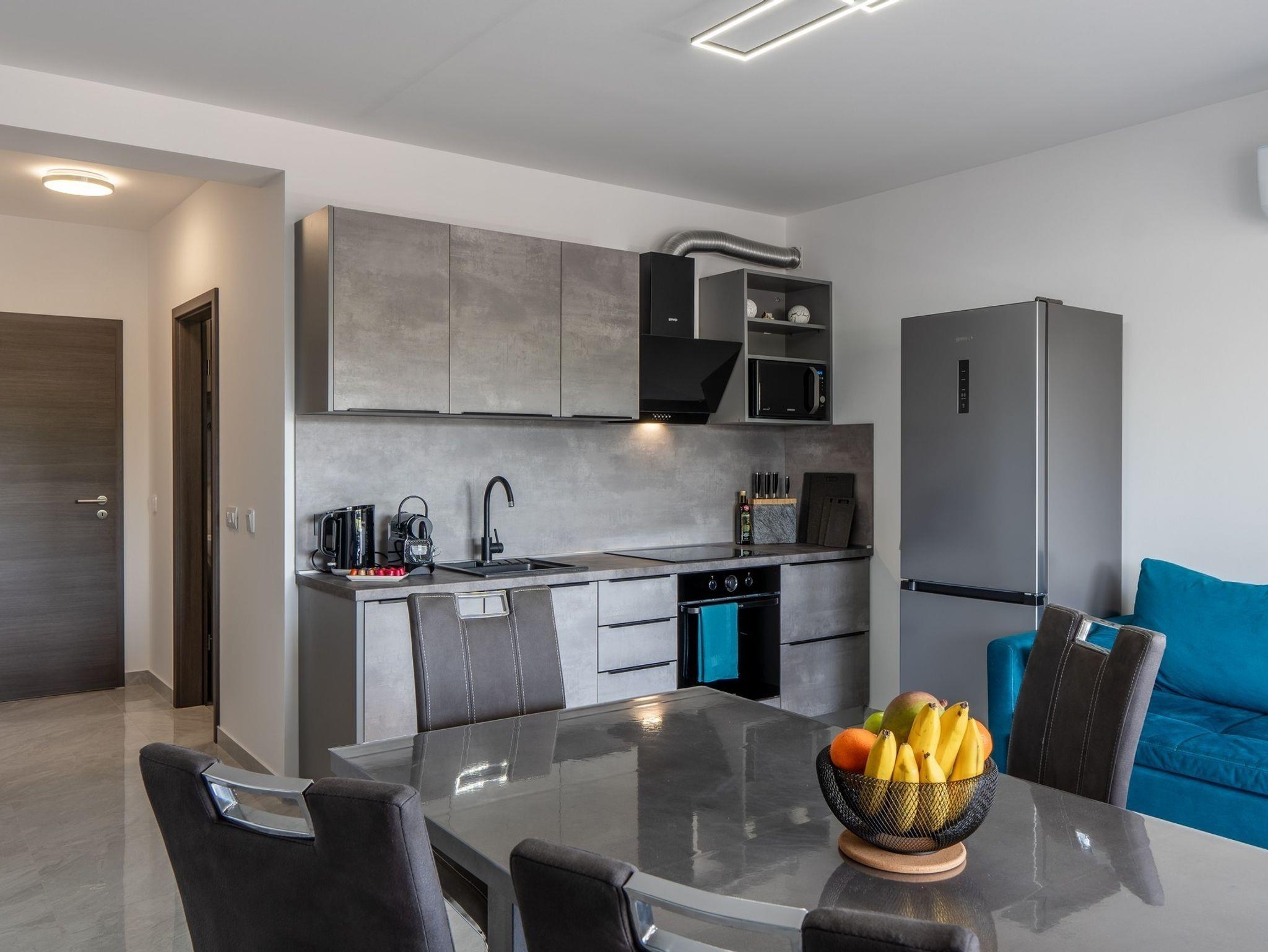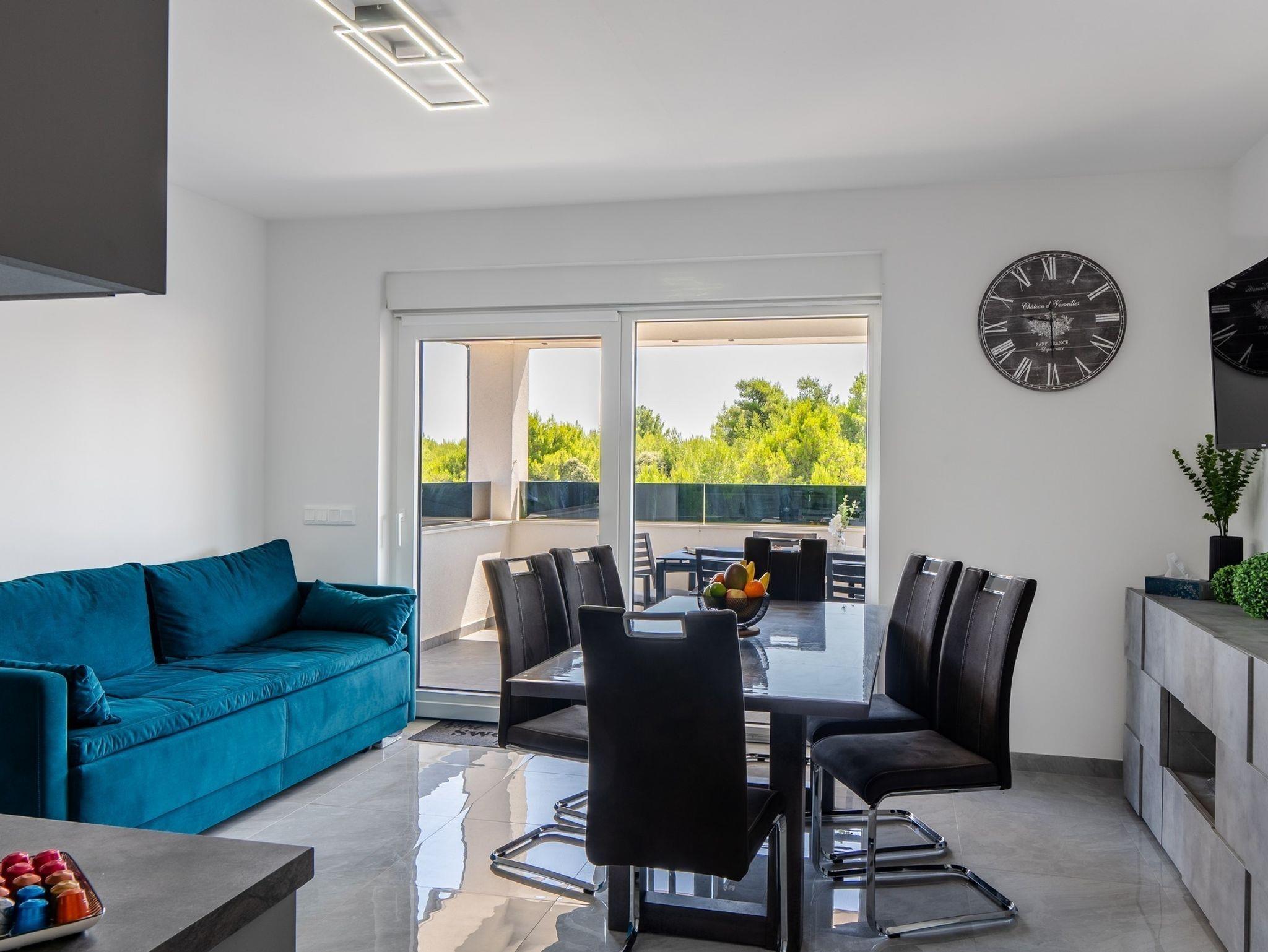 Ferienwohnung bietet Platz für 6 Gäste. Die Betten sind in Schlafzimmern, die es 2 gibt, und in Wohnzimmer, innerhalb einer Gesamtfläche von 51m2, angeordnet. Die Gäste haben eine eigene Terrasse zur Verfügung, auf der sie in warmen Sommernächten genießen können. Das Apartment bietet Meerblick. Es ist erlaubt, Speisen auf dem Gemeinschafts-Grill vorzubereiten. IM PREIS INBEGRIFFEN: Kurtaxe, Endreinigung, Klimatisierung, Parkplatz, Internet, Bügeleisen, Bügelbrett, Föhn, tragbarer Grill. Die Verfügbarkeit zusätzlicher Dienstleistungen in Ihrem reservierten Termin und die Preise derselben (falls nicht aufgeführt) müssen im Voraus überprüft werden. Zusätzliche Dienstleistungen die in der Zahlungsaufforderung nicht aufgeführt sind werden direkt beim Vermieter bezahlt, angenommen der Gast nutzt auch diese.