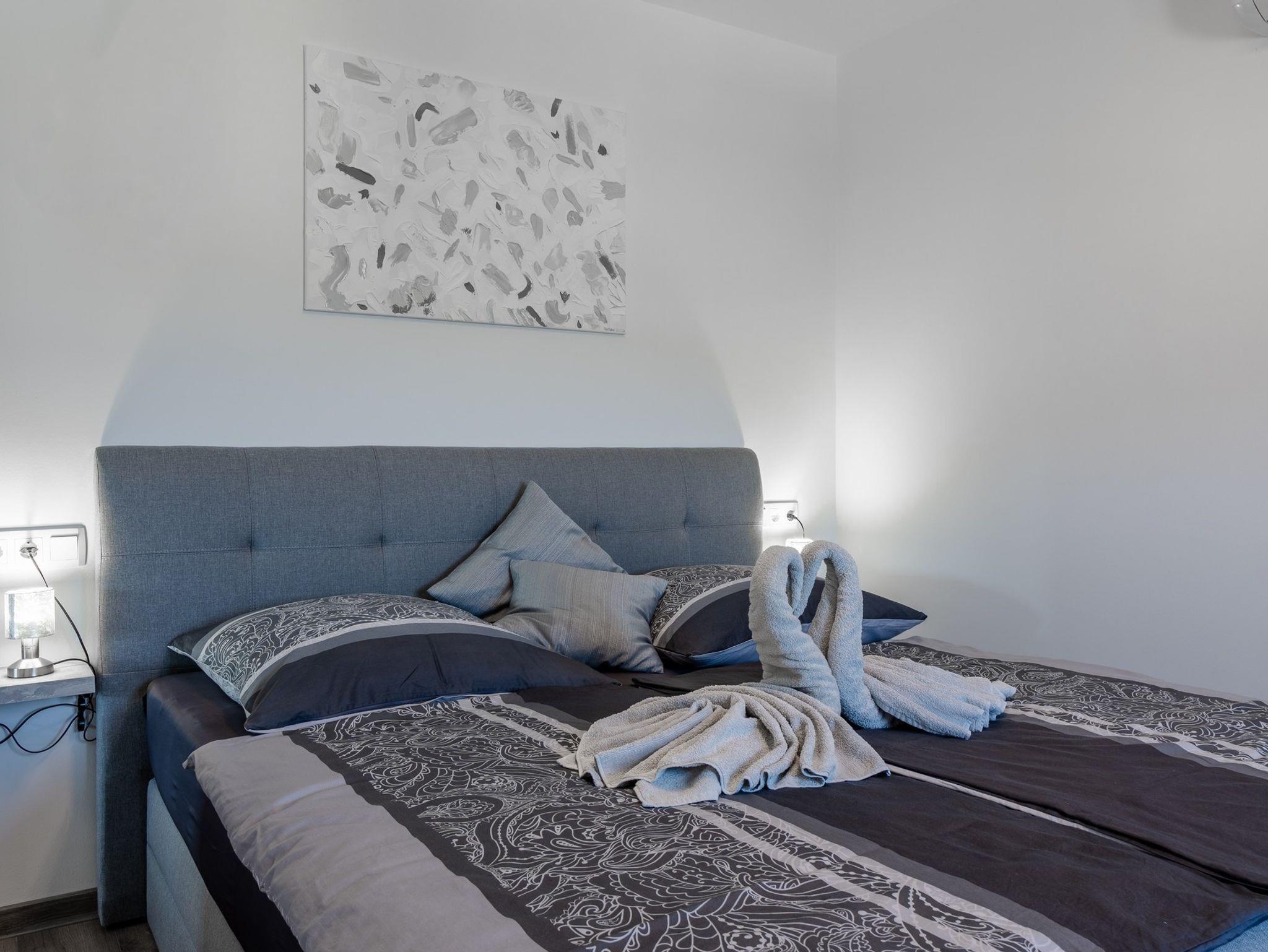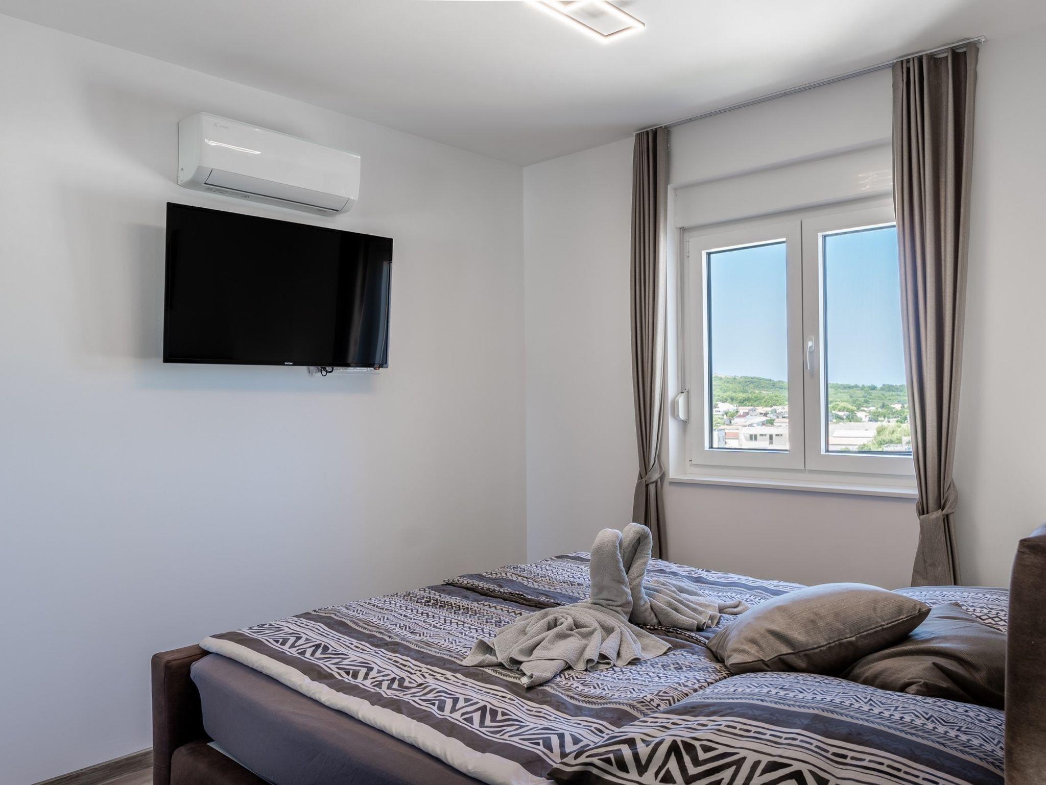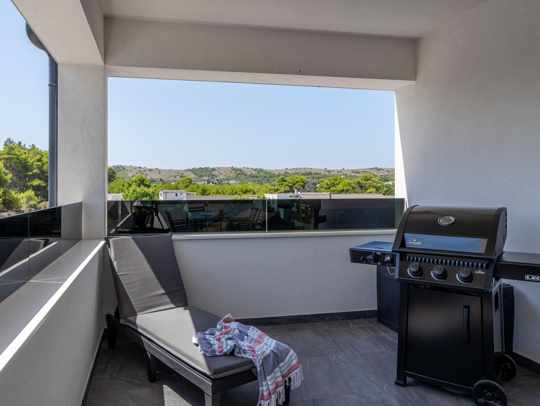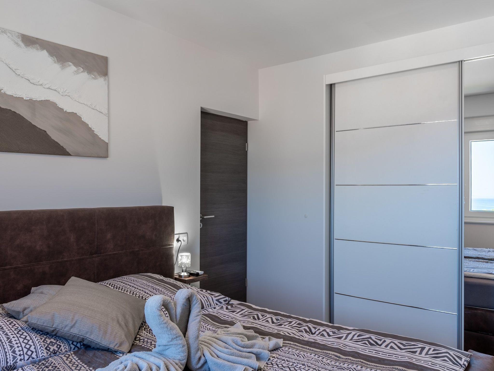 Ferienwohnung bietet Platz für 6 Gäste. Die Betten sind in Schlafzimmern, die es 2 gibt, und in Wohnzimmer, innerhalb einer Gesamtfläche von 51m2, angeordnet. Die Gäste haben eine eigene Terrasse zur Verfügung, auf der sie in warmen Sommernächten genießen können. Das Apartment bietet Meerblick. Es ist erlaubt, Speisen auf dem Gemeinschafts-Grill vorzubereiten. IM PREIS INBEGRIFFEN: Kurtaxe, Endreinigung, Klimatisierung, Parkplatz, Internet, Bügeleisen, Bügelbrett, Föhn, tragbarer Grill. Die Verfügbarkeit zusätzlicher Dienstleistungen in Ihrem reservierten Termin und die Preise derselben (falls nicht aufgeführt) müssen im Voraus überprüft werden. Zusätzliche Dienstleistungen die in der Zahlungsaufforderung nicht aufgeführt sind werden direkt beim Vermieter bezahlt, angenommen der Gast nutzt auch diese.