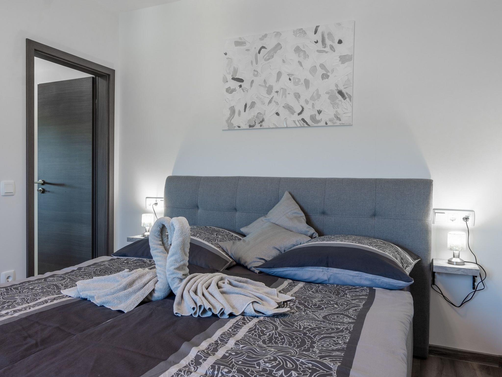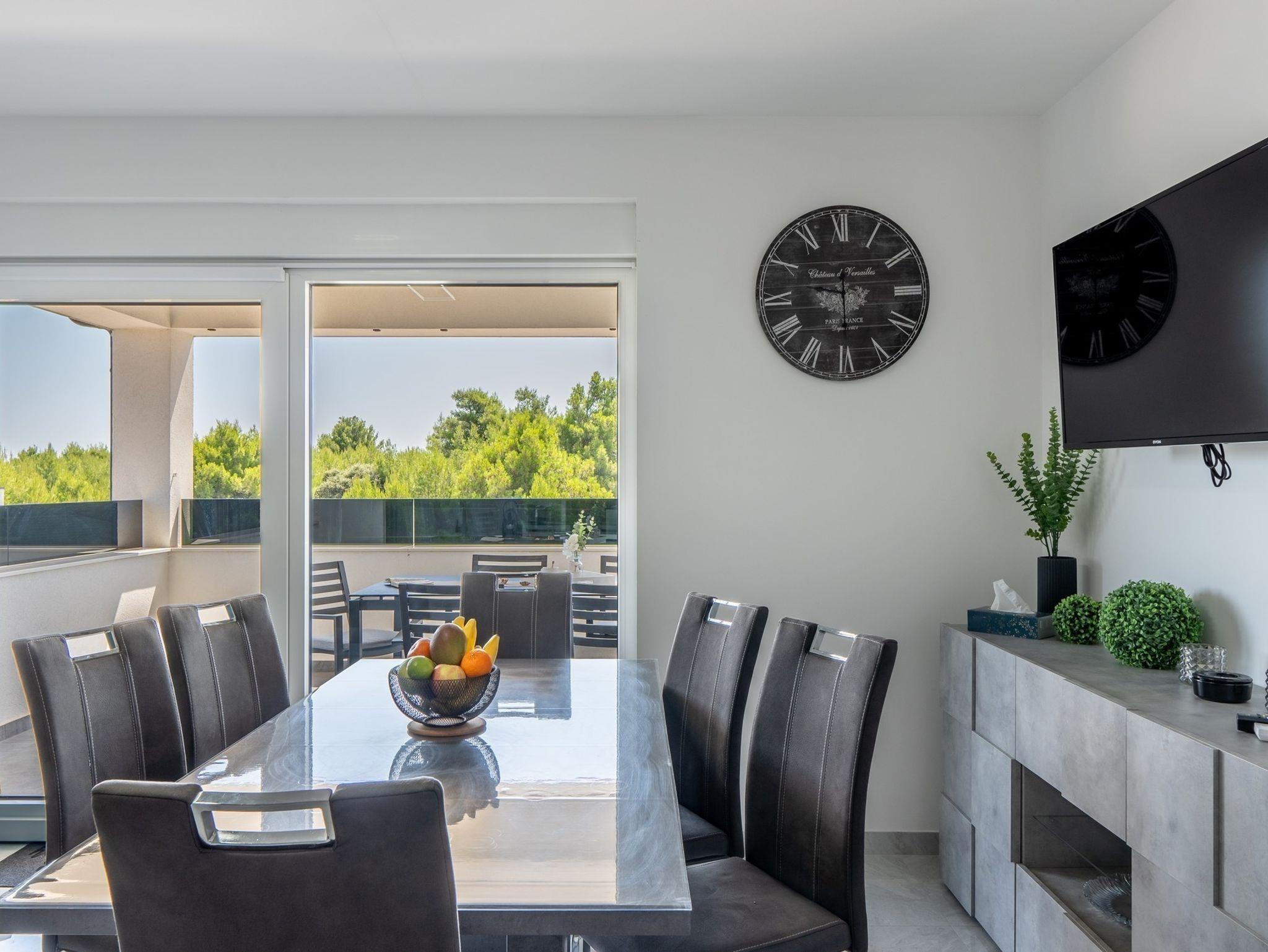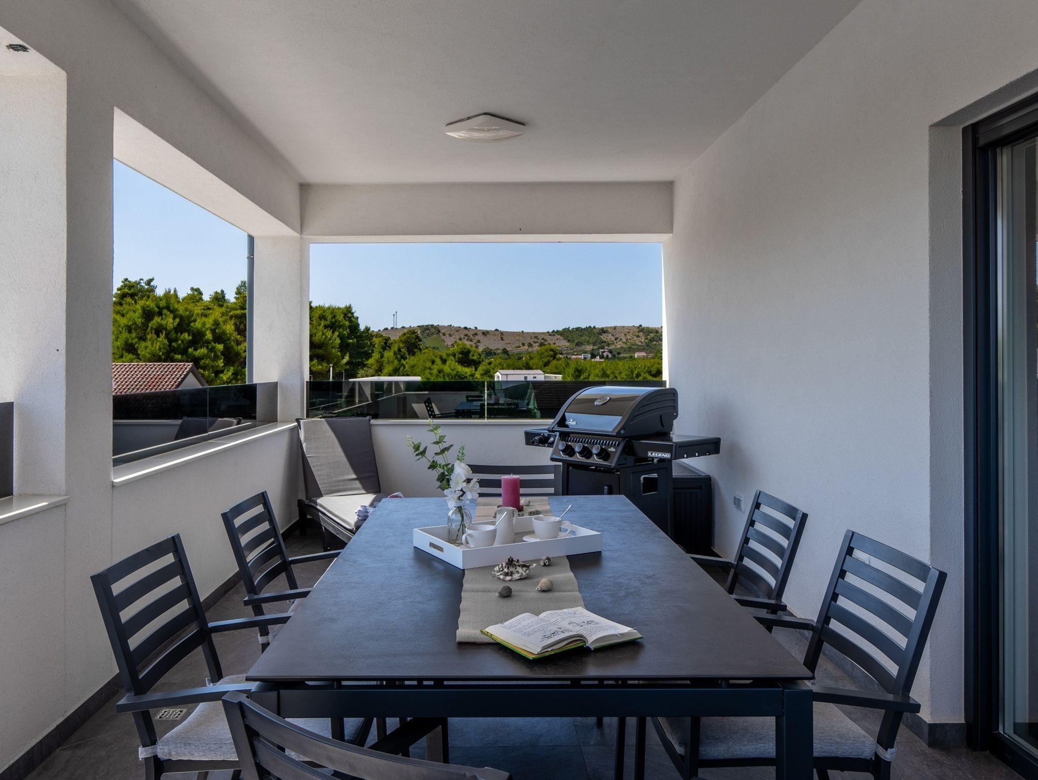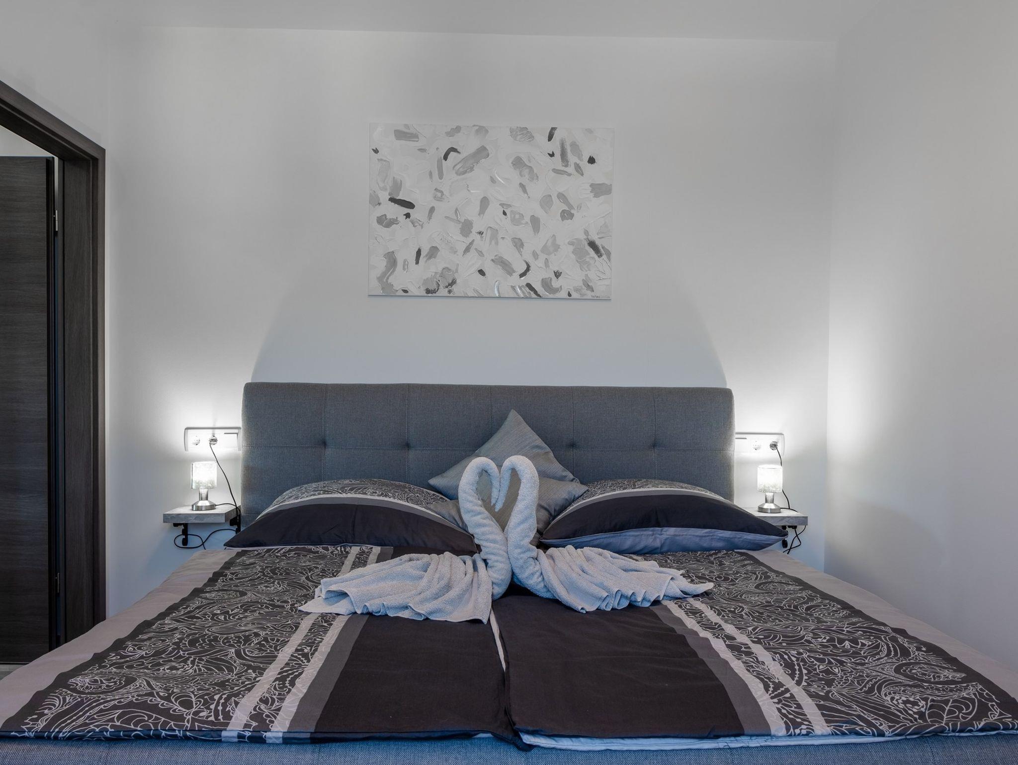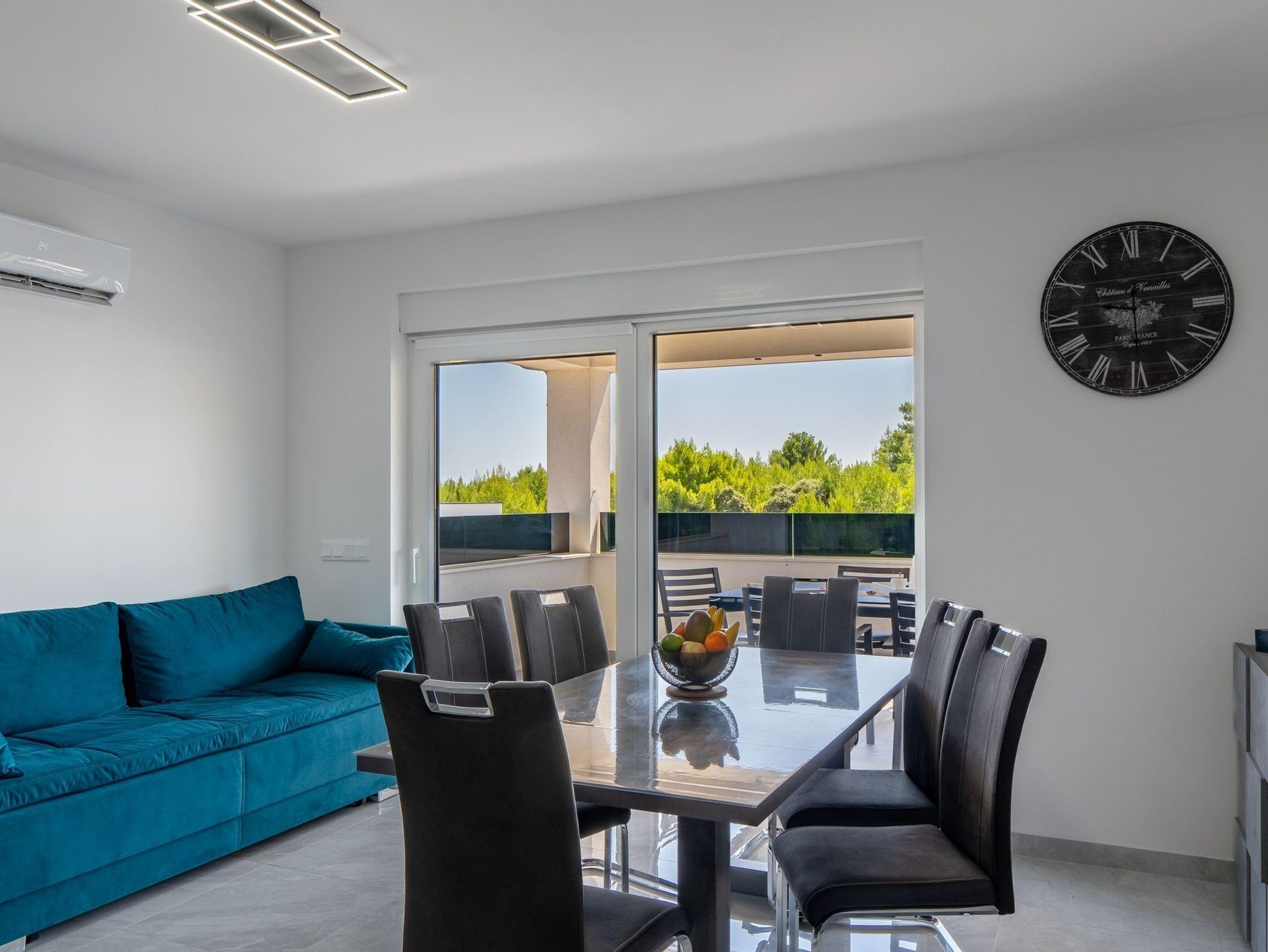 Ferienwohnung bietet Platz für 6 Gäste. Die Betten sind in Schlafzimmern, die es 2 gibt, und in Wohnzimmer, innerhalb einer Gesamtfläche von 51m2, angeordnet. Die Gäste haben eine eigene Terrasse zur Verfügung, auf der sie in warmen Sommernächten genießen können. Das Apartment bietet Meerblick. Es ist erlaubt, Speisen auf dem Gemeinschafts-Grill vorzubereiten. IM PREIS INBEGRIFFEN: Kurtaxe, Endreinigung, Klimatisierung, Parkplatz, Internet, Bügeleisen, Bügelbrett, Föhn, tragbarer Grill. Die Verfügbarkeit zusätzlicher Dienstleistungen in Ihrem reservierten Termin und die Preise derselben (falls nicht aufgeführt) müssen im Voraus überprüft werden. Zusätzliche Dienstleistungen die in der Zahlungsaufforderung nicht aufgeführt sind werden direkt beim Vermieter bezahlt, angenommen der Gast nutzt auch diese.