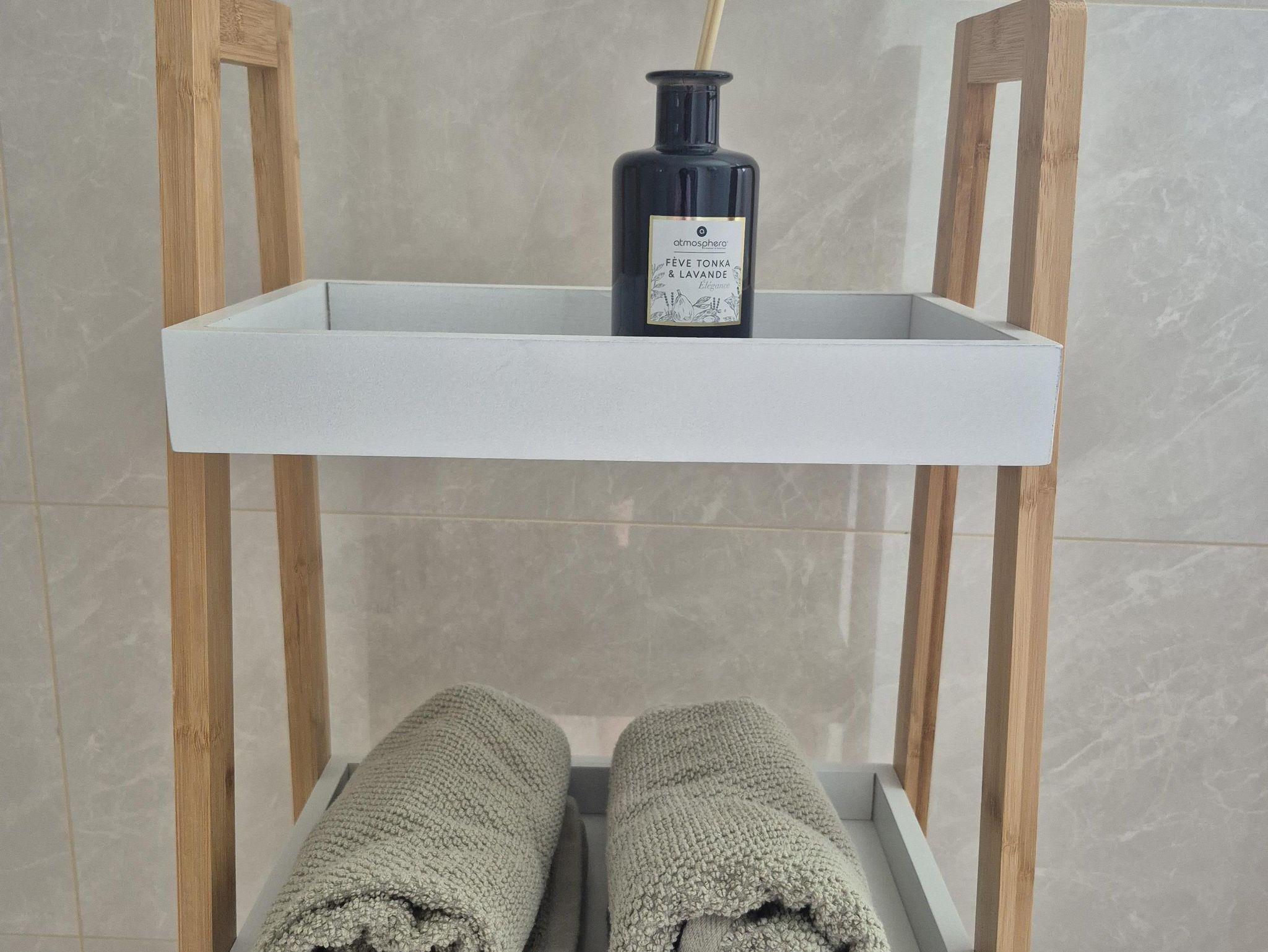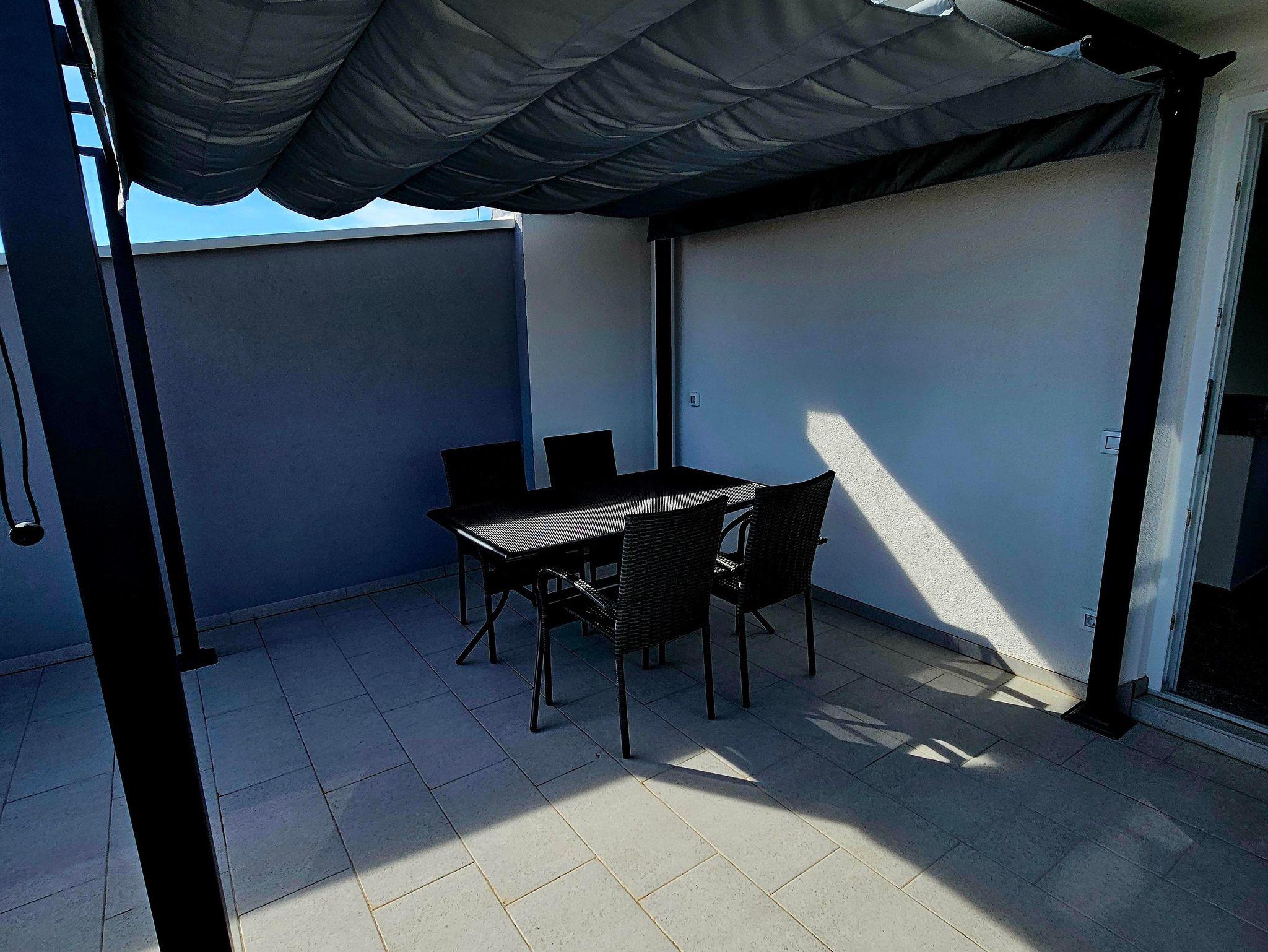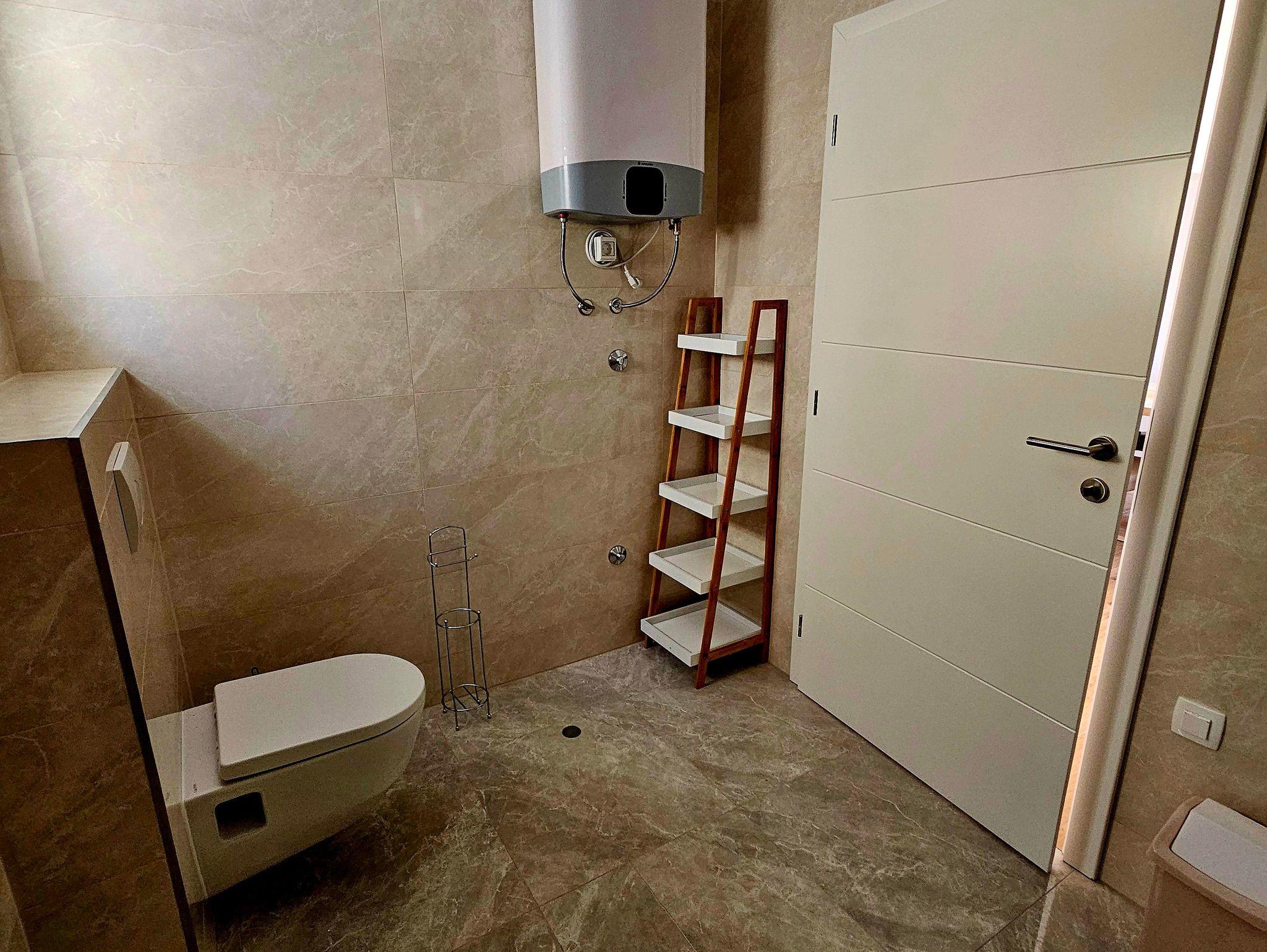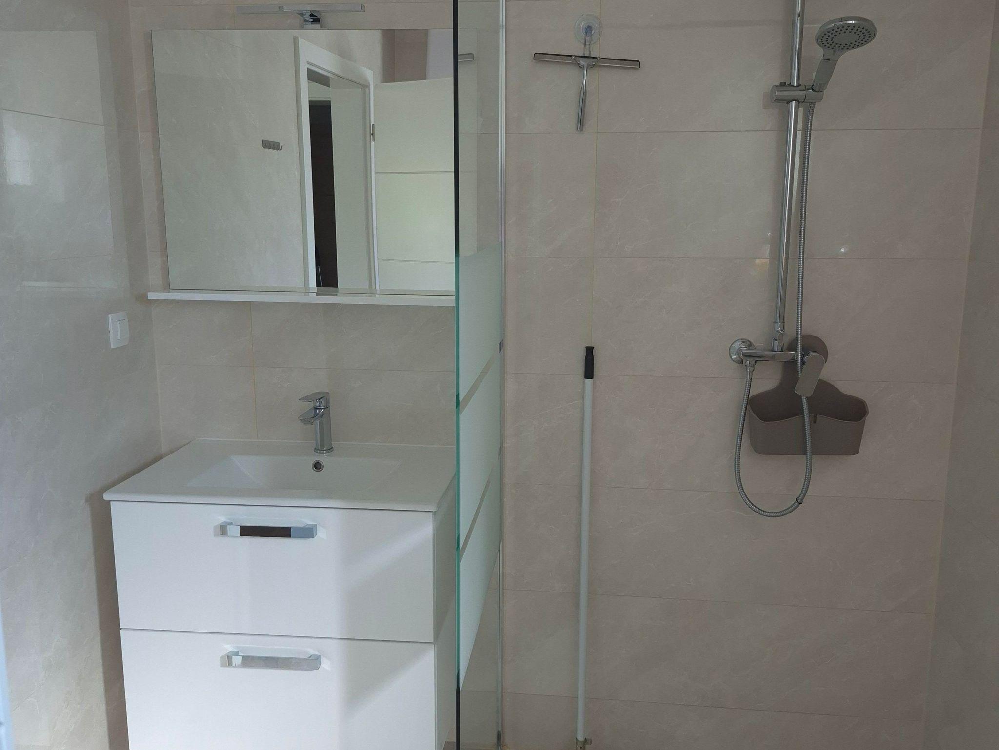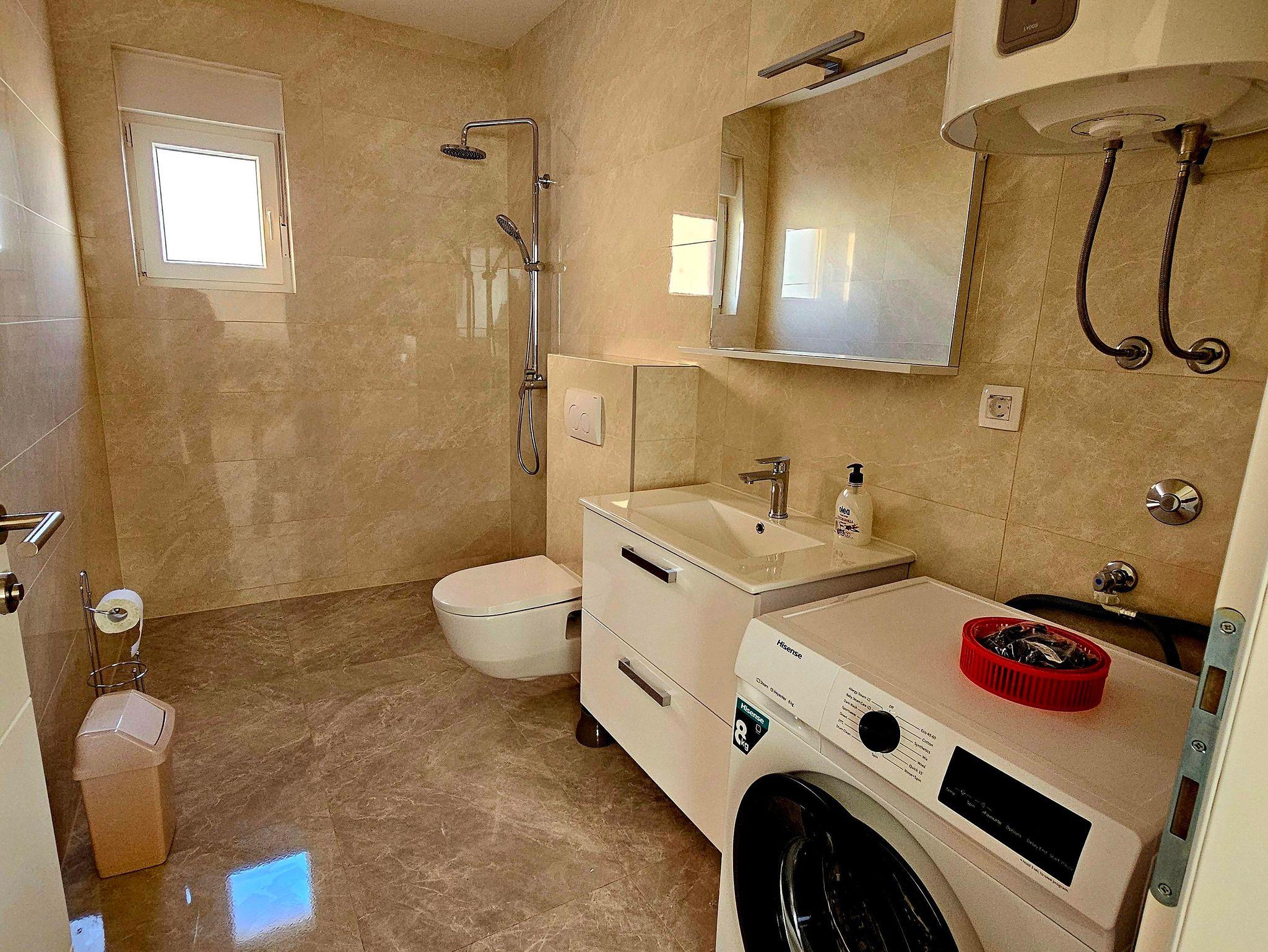 Die Wohnung verfügt über zwei moderne Badezimmer, beide mit bodenebener, barrierefreier Regendusche im Marmorlook. Waschmaschine (Toplader), Haartrockner und Handtücher sind vorhanden. Jeder Raum hat eine eigene Klimaanlage. Ein eigener PKW-Stellplatz, kostenfreies WLAN sowie Grillmöglichkeiten auf der Dachterrasse ergänzen das Angebot mit wunderschönem Meer- und dem Blick auf die für Kroatien bekannten sagenhaften Sonnenuntergänge.