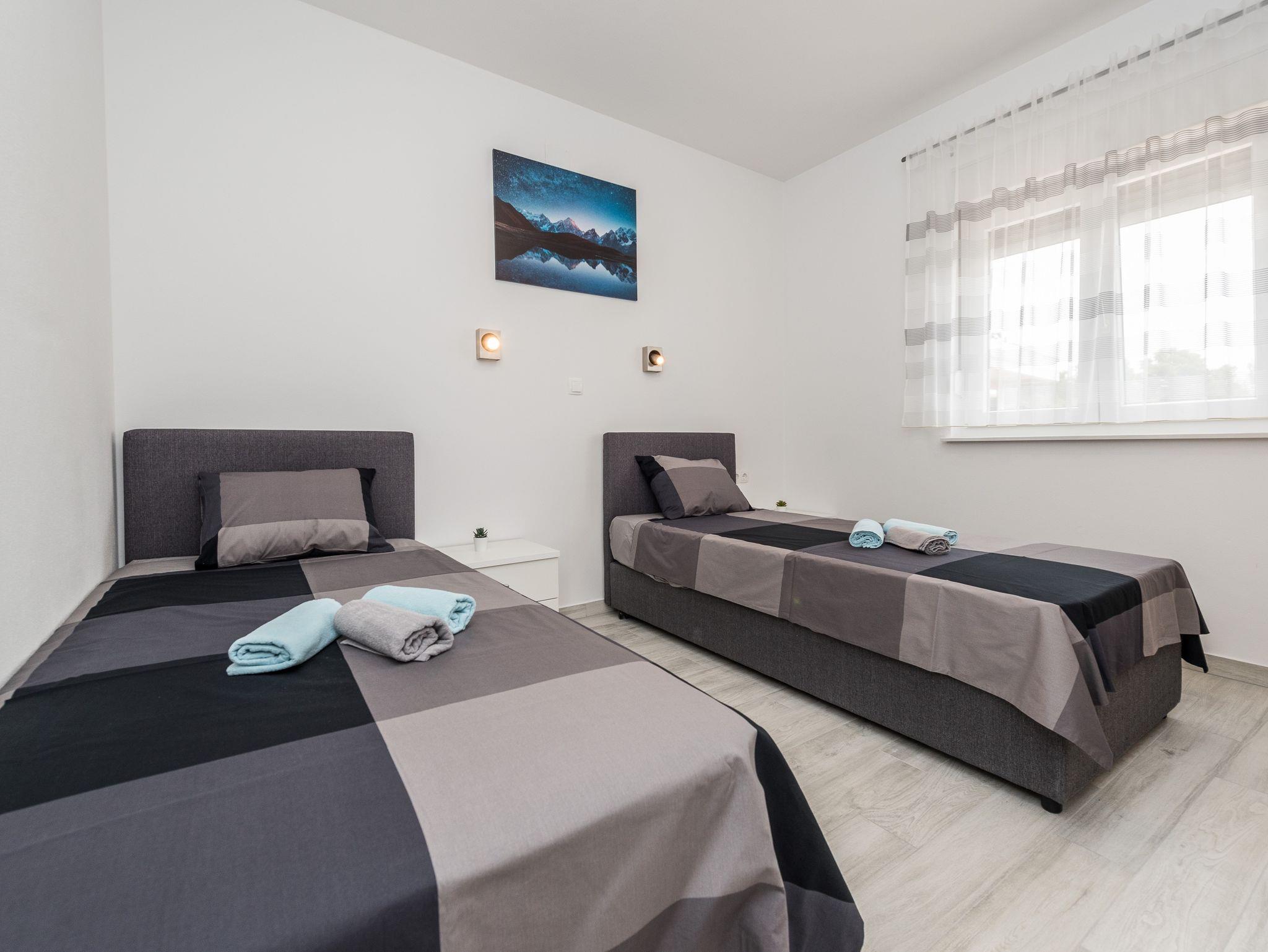 Ferienwohnung bietet Platz für 6 Gäste. Die Betten sind in Schlafzimmern, die es 2 gibt, und in Wohnzimmer, innerhalb einer Gesamtfläche von 59m2, angeordnet. Die Gäste haben eine eigene Terrasse zur Verfügung, auf der sie in warmen Sommernächten genießen können. Es ist erlaubt, Speisen auf dem Gemeinschafts-Grill vorzubereiten. IM PREIS INBEGRIFFEN: Kurtaxe, Endreinigung, Klimatisierung, Parkplatz, Internet, Kinderbett, Bügeleisen, Bügelbrett, Föhn. VERBINDLICHE ZUSÄTZLICHE KOSTEN: Aufzahlung für Kurzaufenthalte (prozentualer Zuschlag pro Nächtigungsanzahl: 30% - 1, 20% - 2, 10% - 3). Die Verfügbarkeit zusätzlicher Dienstleistungen in Ihrem reservierten Termin und die Preise derselben (falls nicht aufgeführt) müssen im Voraus überprüft werden. Zusätzliche Dienstleistungen die in der Zahlungsaufforderung nicht aufgeführt sind werden direkt beim Vermieter bezahlt, angenommen der Gast nutzt auch diese.