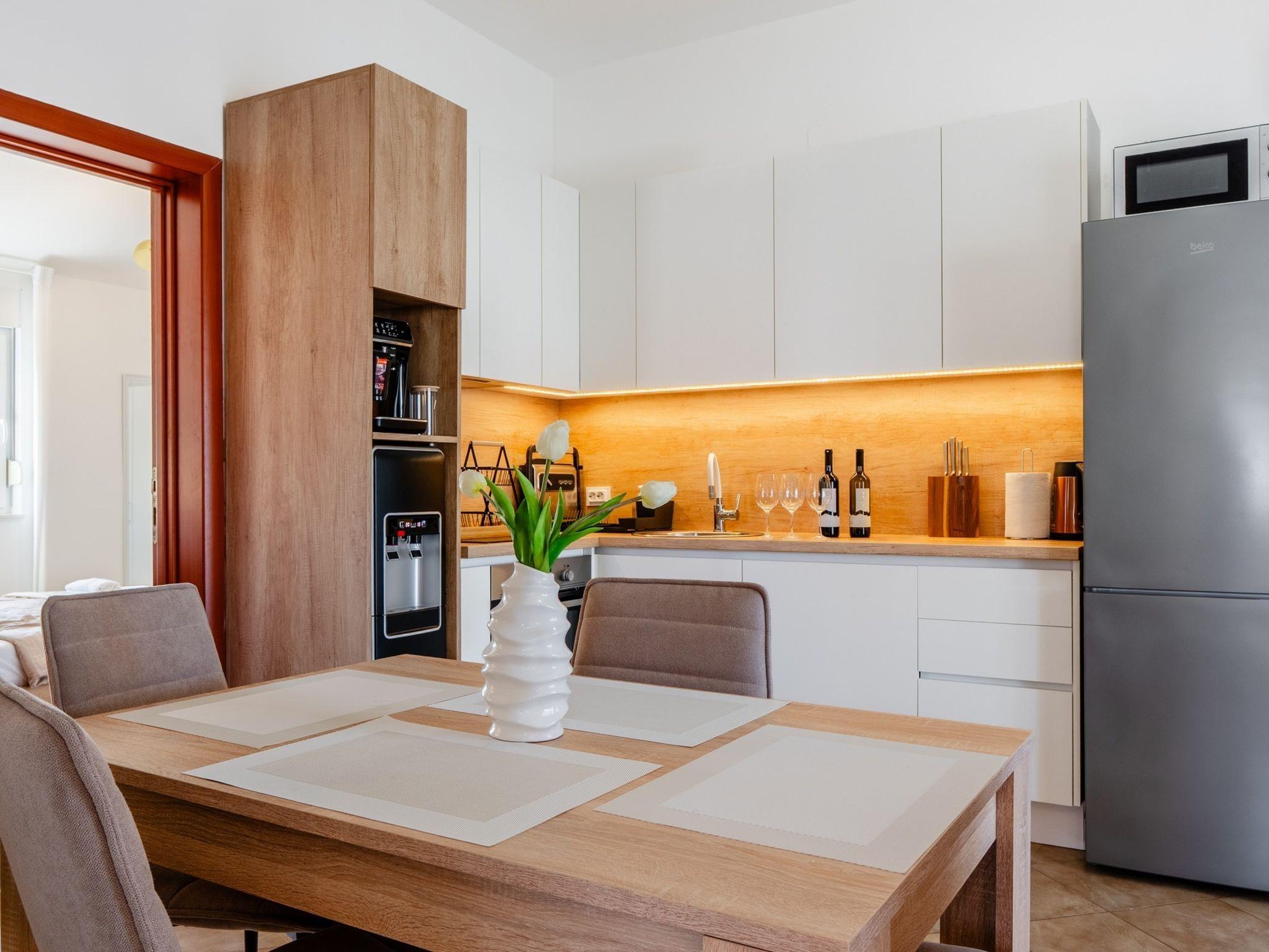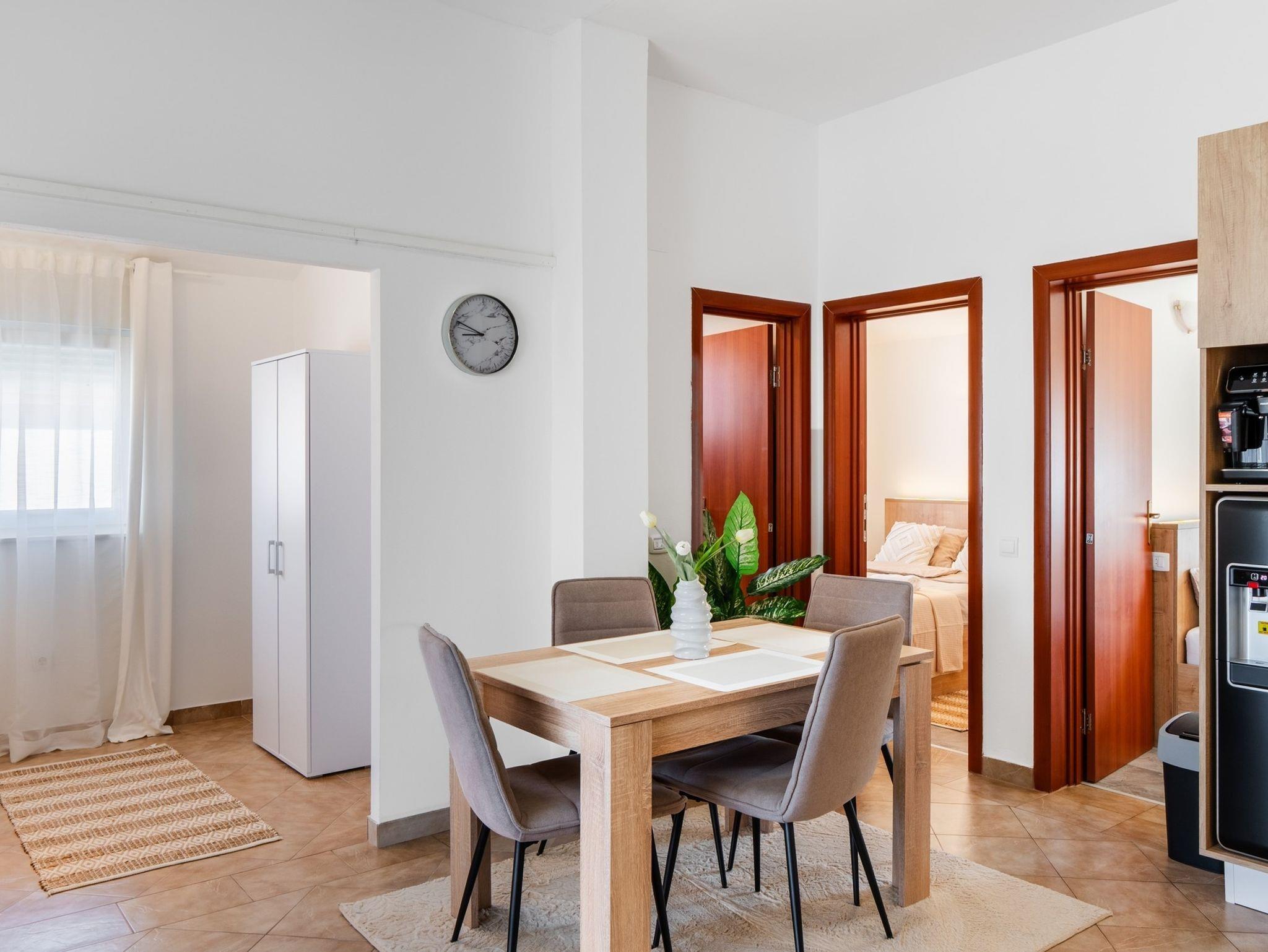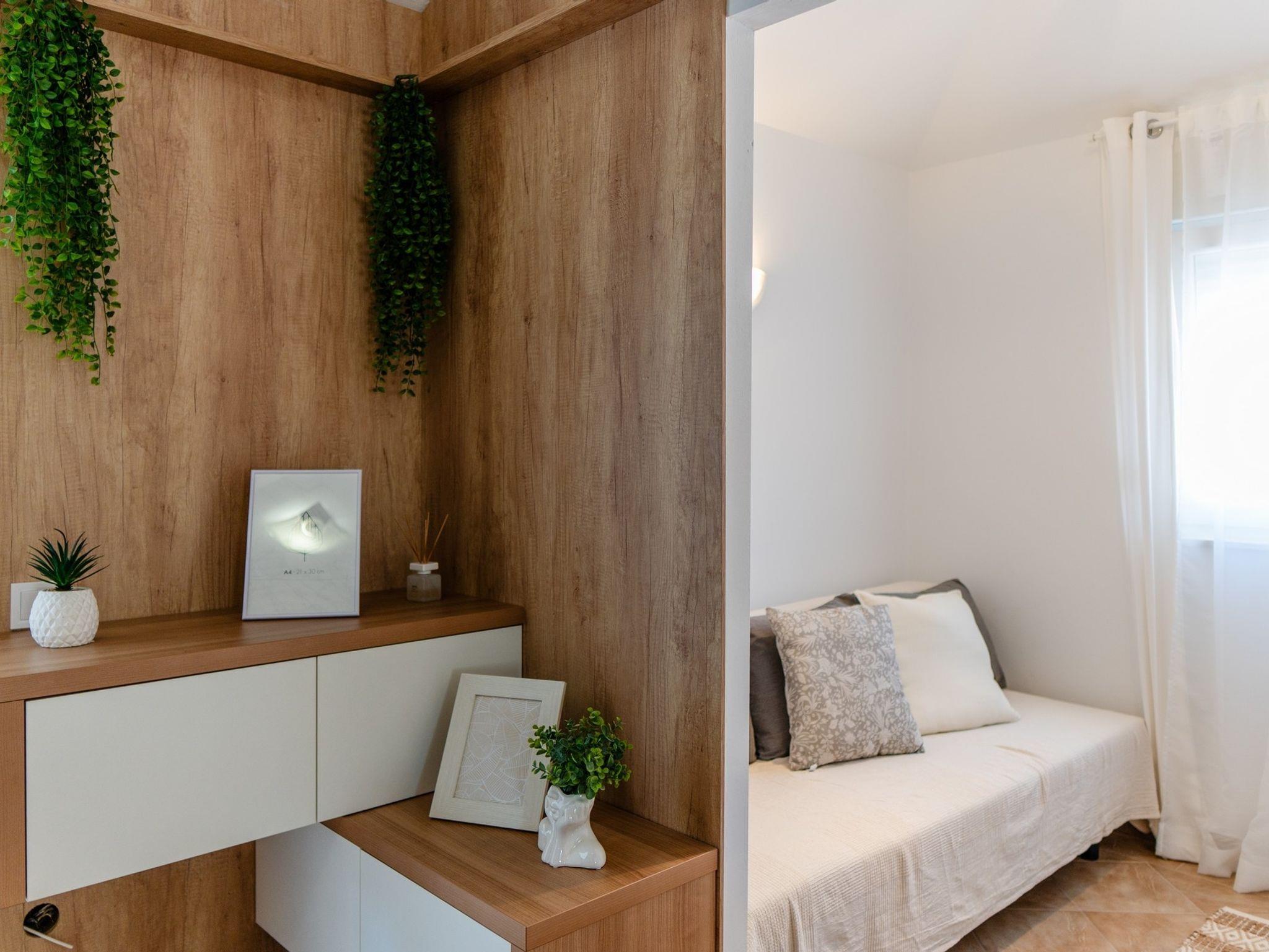 Ferienwohnung bietet Platz für 5 Gäste. Die Betten sind in Schlafzimmern, die es 2 gibt, und in Wohnzimmer, innerhalb einer Gesamtfläche von 55m2, angeordnet. Die Gäste haben eine eigene Terrasse zur Verfügung, auf der sie in warmen Sommernächten genießen können. Es ist erlaubt, Speisen auf dem Gemeinschafts-Grill vorzubereiten. IM PREIS INBEGRIFFEN: Kurtaxe, Endreinigung, Klimatisierung, Parkplatz, Internet, Bügeleisen, Bügelbrett, Föhn. VERBINDLICHE ZUSÄTZLICHE KOSTEN: Aufzahlung für Kurzaufenthalte (prozentualer Zuschlag pro Nächtigungsanzahl: 30% - 1, 20% - 2, 10% - 3). Die Verfügbarkeit zusätzlicher Dienstleistungen in Ihrem reservierten Termin und die Preise derselben (falls nicht aufgeführt) müssen im Voraus überprüft werden. Zusätzliche Dienstleistungen die in der Zahlungsaufforderung nicht aufgeführt sind werden direkt beim Vermieter bezahlt, angenommen der Gast nutzt auch diese.