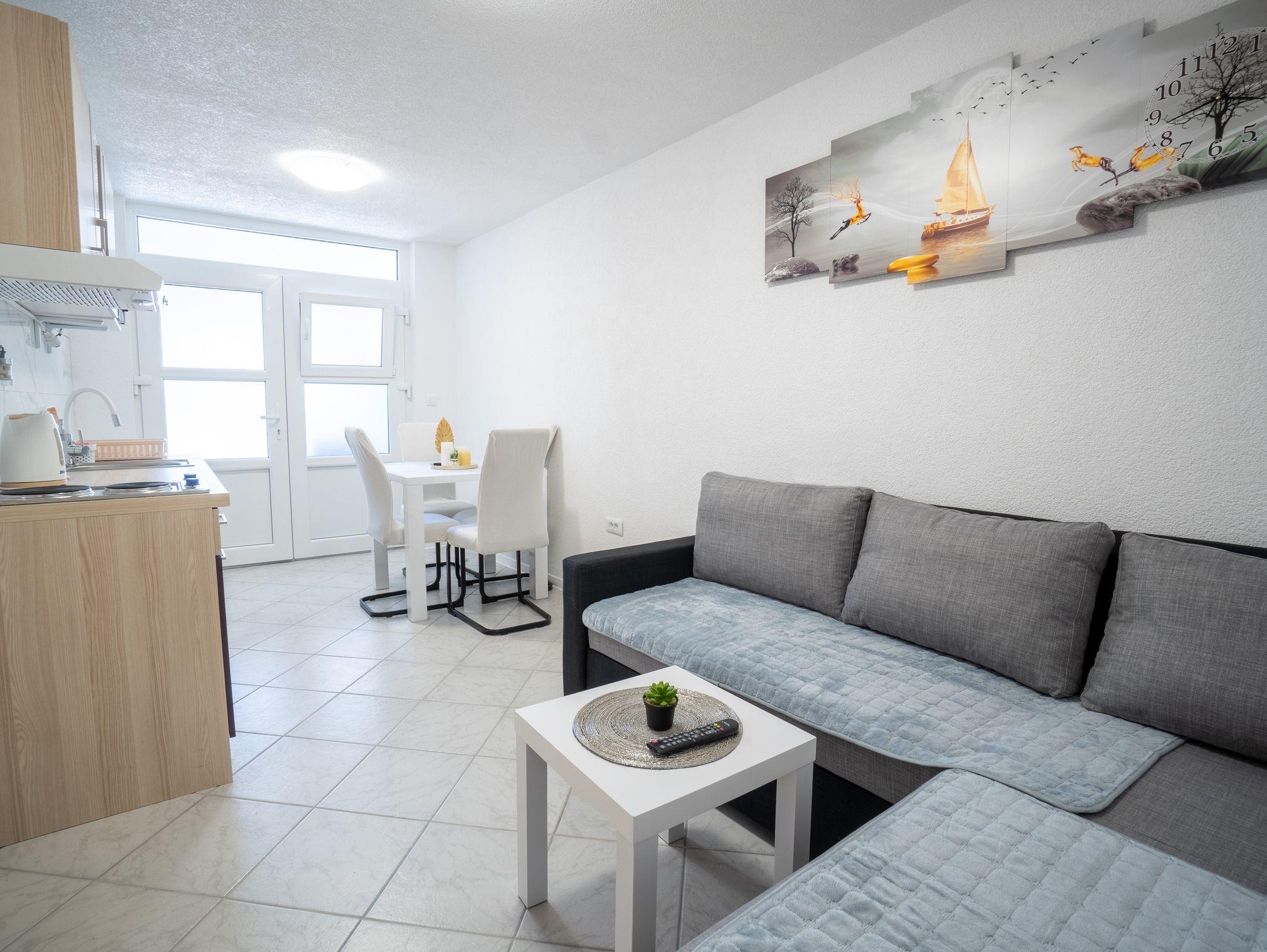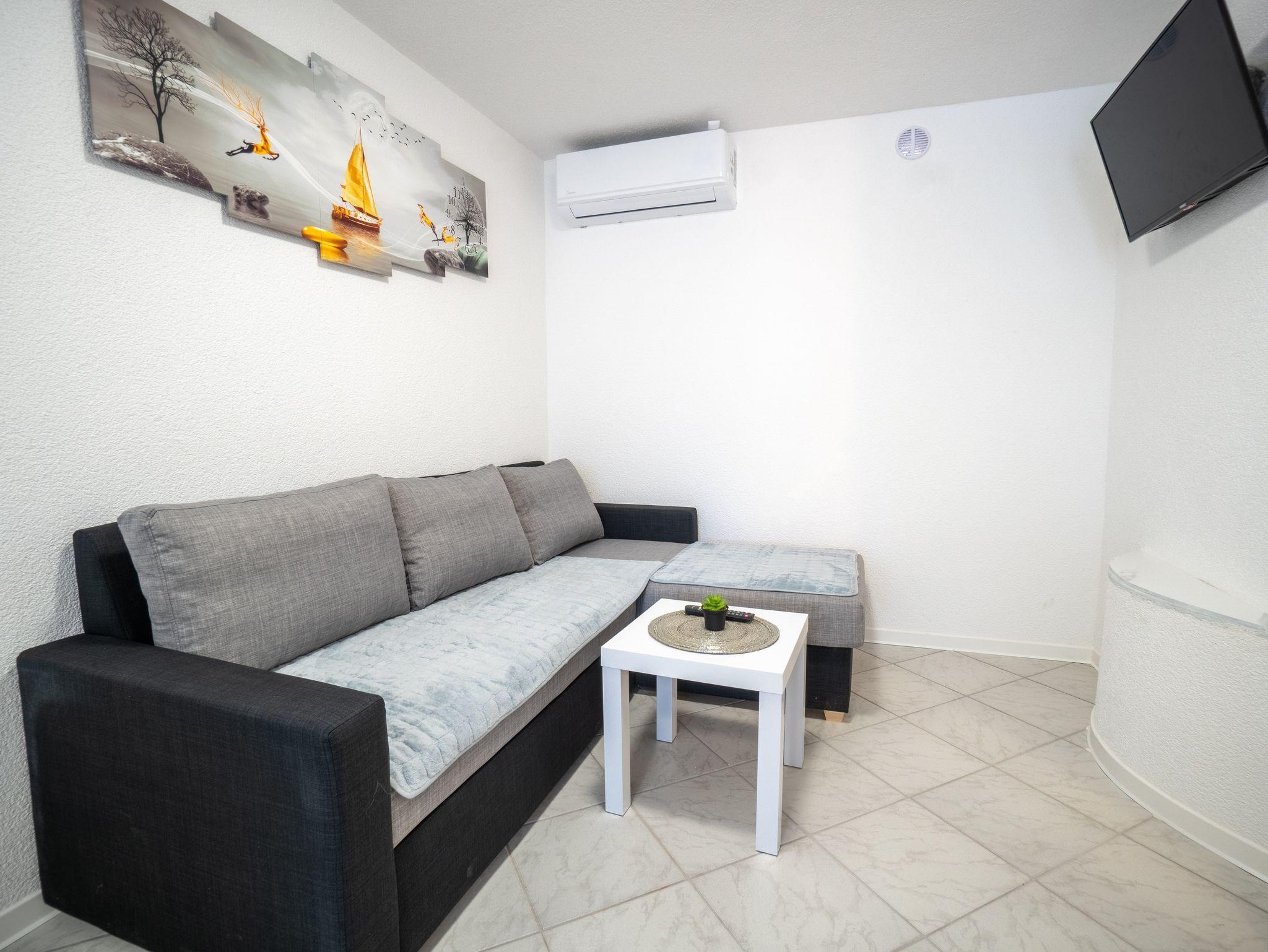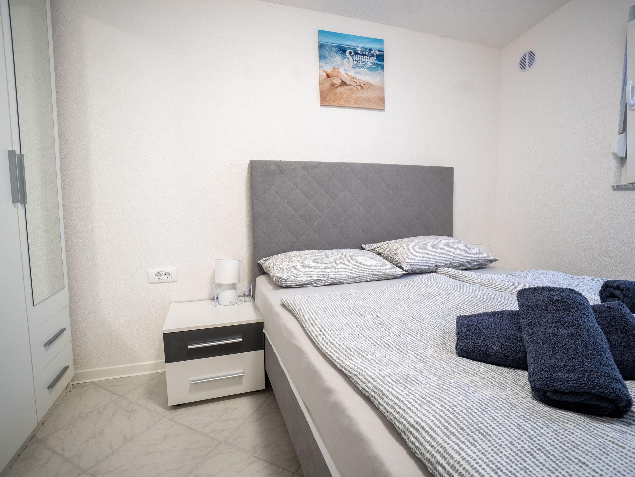 Ferienwohnung bietet Platz für 4 Gäste. Die Betten sind in Schlafzimmern, die es 1 gibt, und in Wohnzimmer, innerhalb einer Gesamtfläche von 27m2, angeordnet. Die Gäste haben eine eigene Terrasse zur Verfügung, auf der sie in warmen Sommernächten genießen können. Es ist erlaubt, Speisen auf dem Gemeinschafts-Grill vorzubereiten. IM PREIS INBEGRIFFEN: Kurtaxe, Endreinigung, Klimatisierung, Parkplatz, Internet, Kinderbett, Föhn. VERBINDLICHE ZUSÄTZLICHE KOSTEN: Aufzahlung für Kurzaufenthalte (prozentualer Zuschlag pro Nächtigungsanzahl: 30% - 1, 20% - 2, 10% - 3). Die Verfügbarkeit zusätzlicher Dienstleistungen in Ihrem reservierten Termin und die Preise derselben (falls nicht aufgeführt) müssen im Voraus überprüft werden. Zusätzliche Dienstleistungen die in der Zahlungsaufforderung nicht aufgeführt sind werden direkt beim Vermieter bezahlt, angenommen der Gast nutzt auch diese.