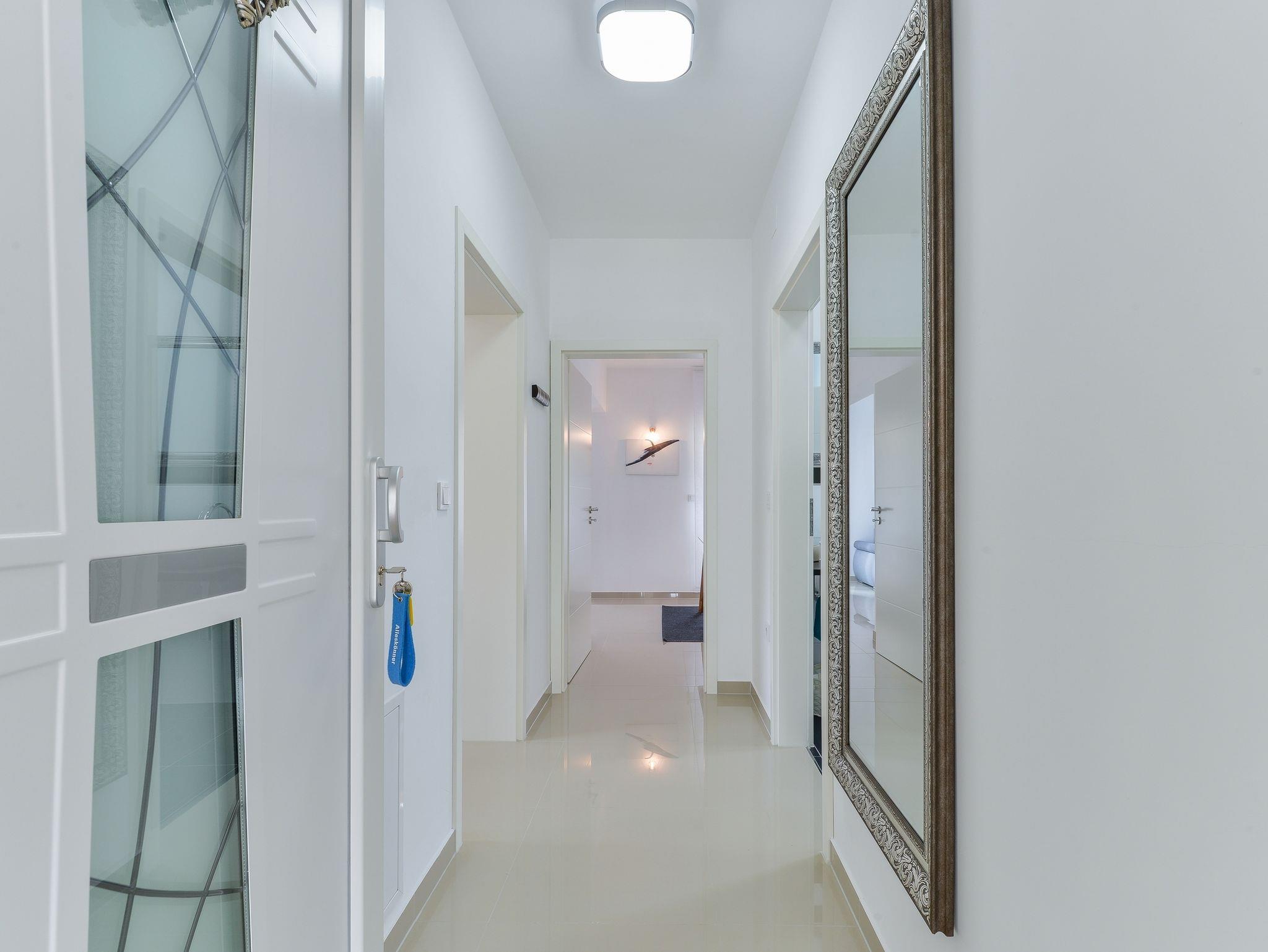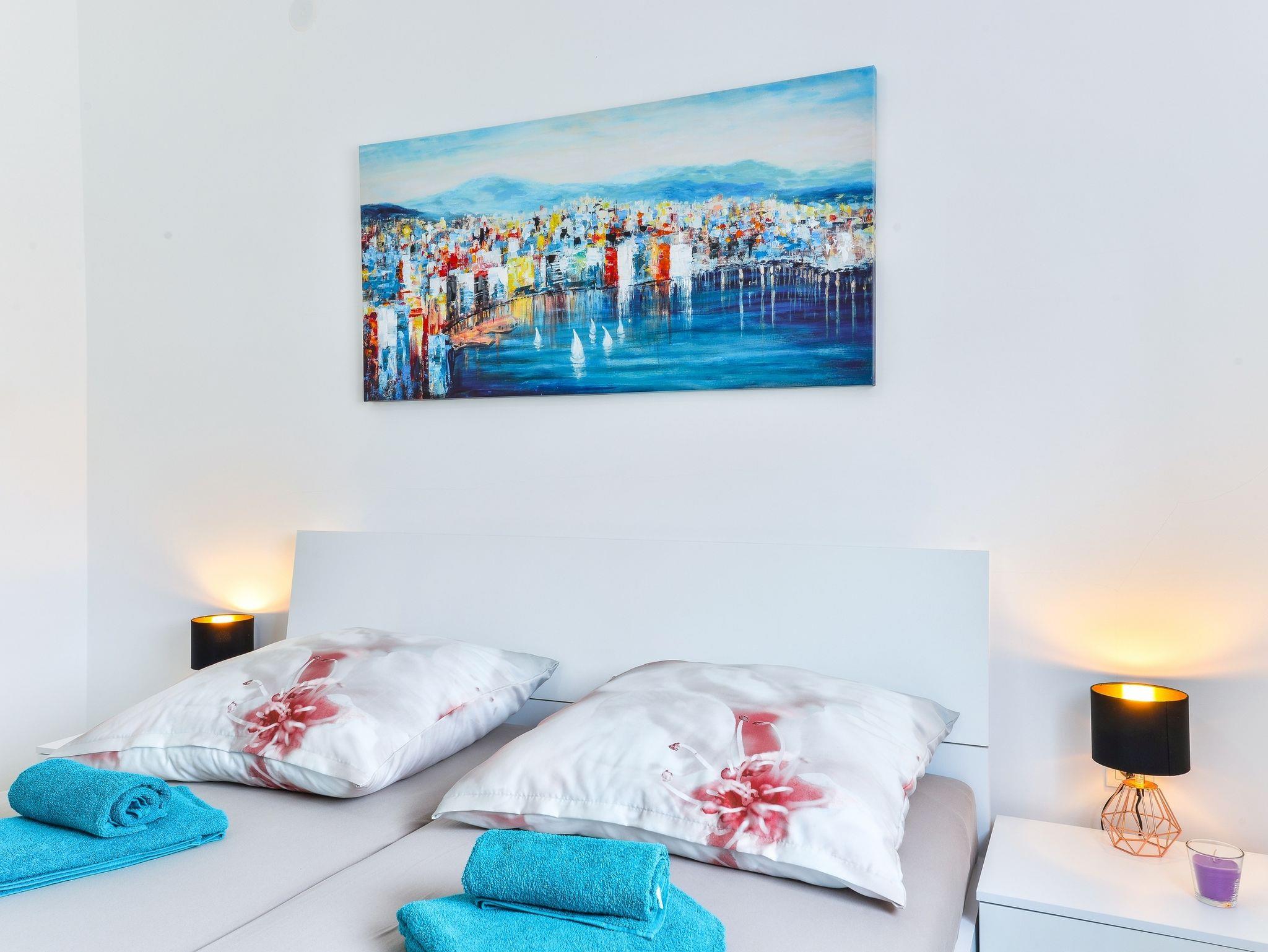 Ferienwohnung bietet Platz für 4 Gäste. Die Betten sind in Schlafzimmern, die es 1 gibt, und in Wohnzimmer, innerhalb einer Gesamtfläche von 59m2, angeordnet. Die Gäste haben einen eigenen Balkon zur Verfügung, auf der sie in warmen Sommernächten genießen können. Das Apartment bietet Meerblick. Es ist erlaubt, Speisen auf dem Gemeinschafts-Grill vorzubereiten. Während ihres Aufenthalts können Gäste das gemeinsam zur Nutzung stehende Schwimmbad benutzen. IM PREIS INBEGRIFFEN: Kurtaxe, Endreinigung, Klimatisierung, Pool, Parkplatz, Internet, Kinderbett, Bügeleisen, Bügelbrett, Föhn. VERBINDLICHE ZUSÄTZLICHE KOSTEN: Aufzahlung für Kurzaufenthalte (prozentualer Zuschlag pro Nächtigungsanzahl: 30% - 1, 20% - 2, 10% - 3). Die Verfügbarkeit zusätzlicher Dienstleistungen in Ihrem reservierten Termin und die Preise derselben (falls nicht aufgeführt) müssen im Voraus überprüft werden. Zusätzliche Dienstleistungen die in der Zahlungsaufforderung nicht aufgeführt sind werden direkt beim Vermieter bezahlt, angenommen der Gast nutzt auch diese.