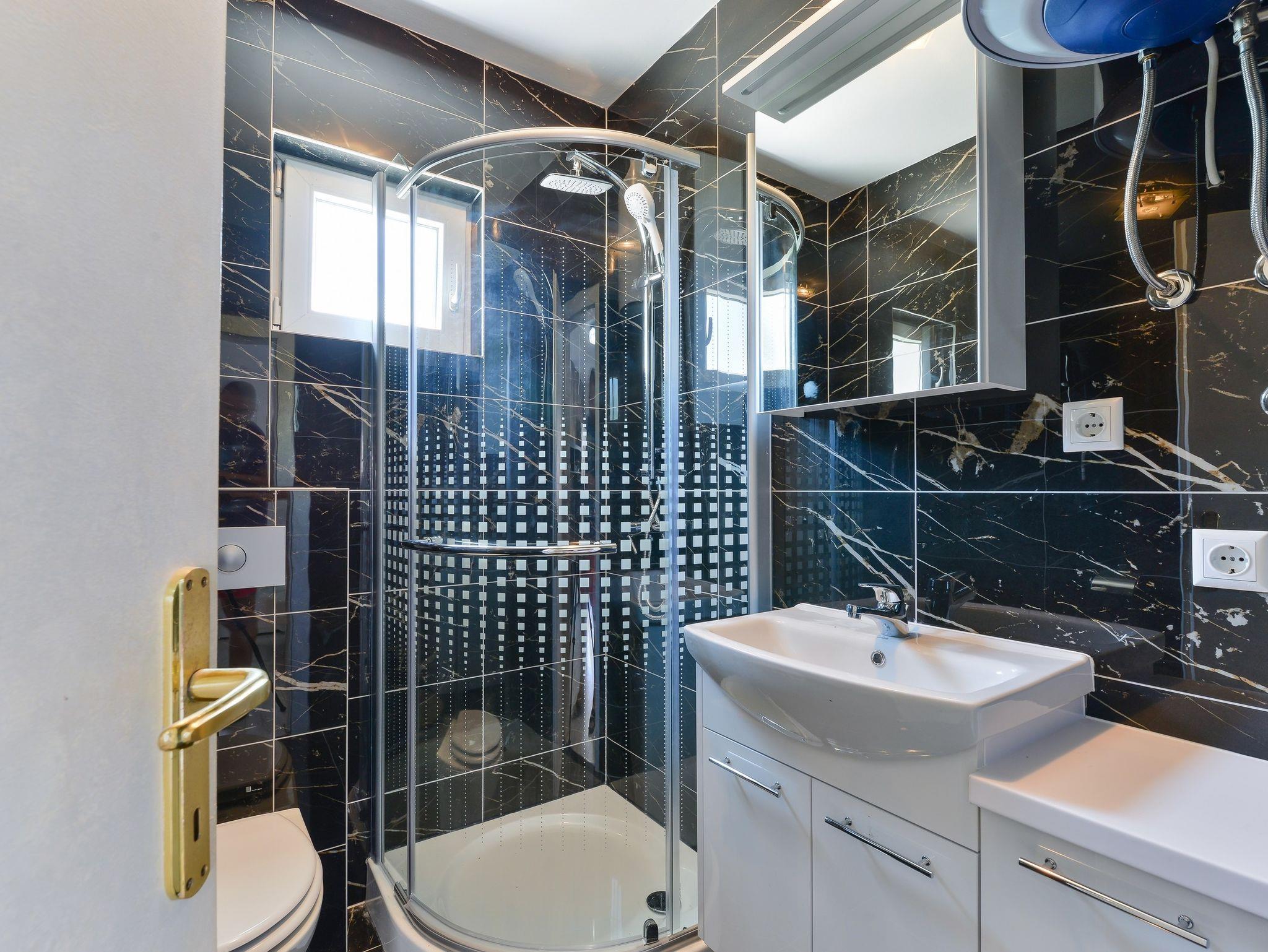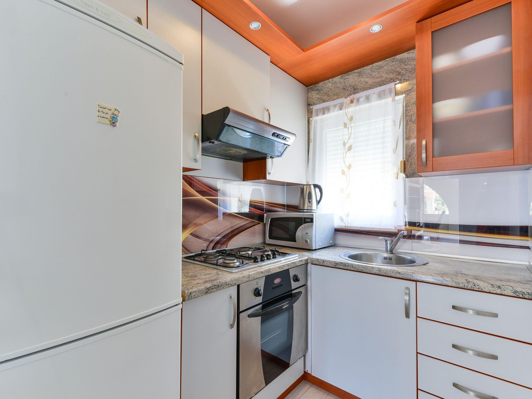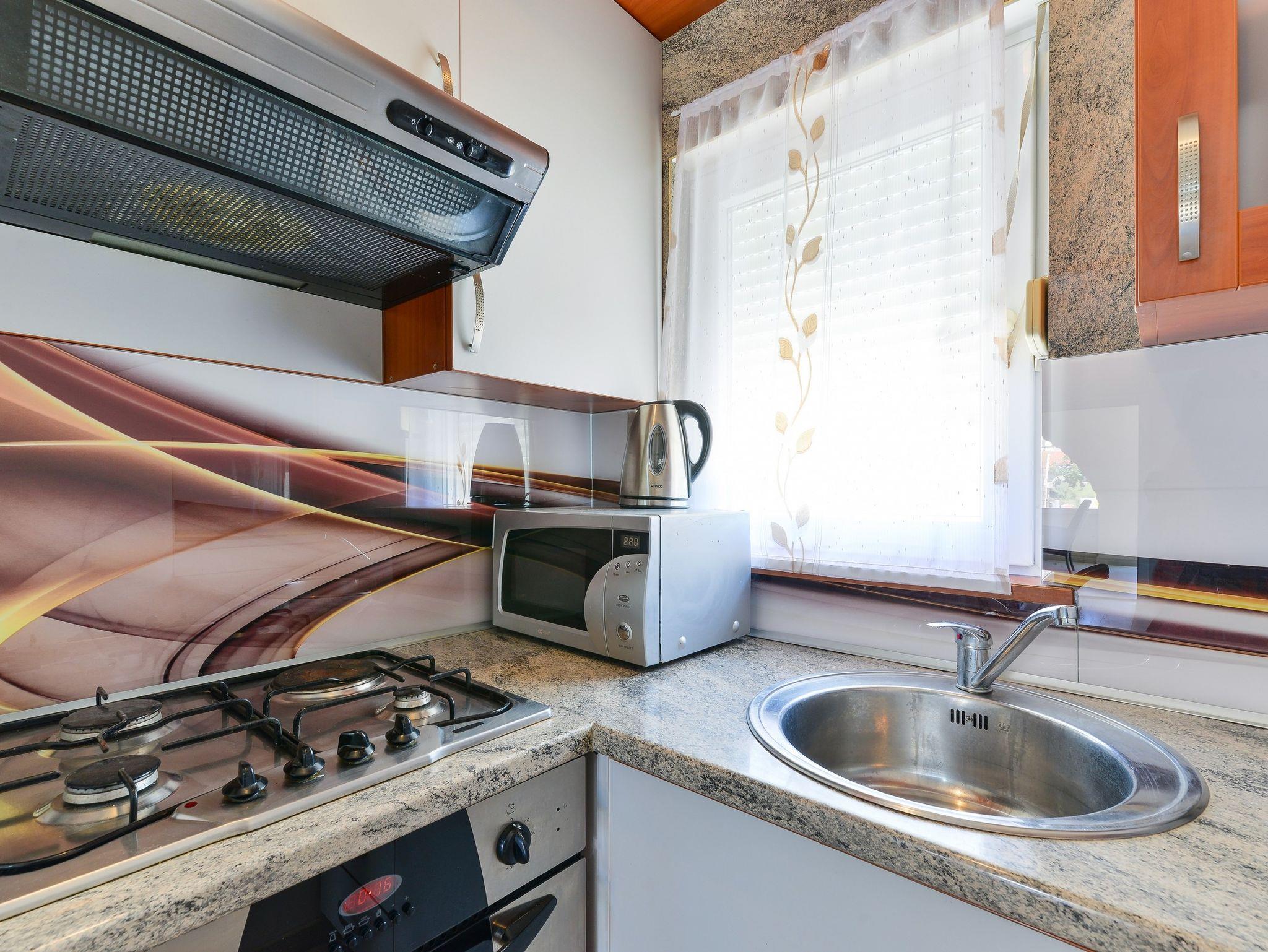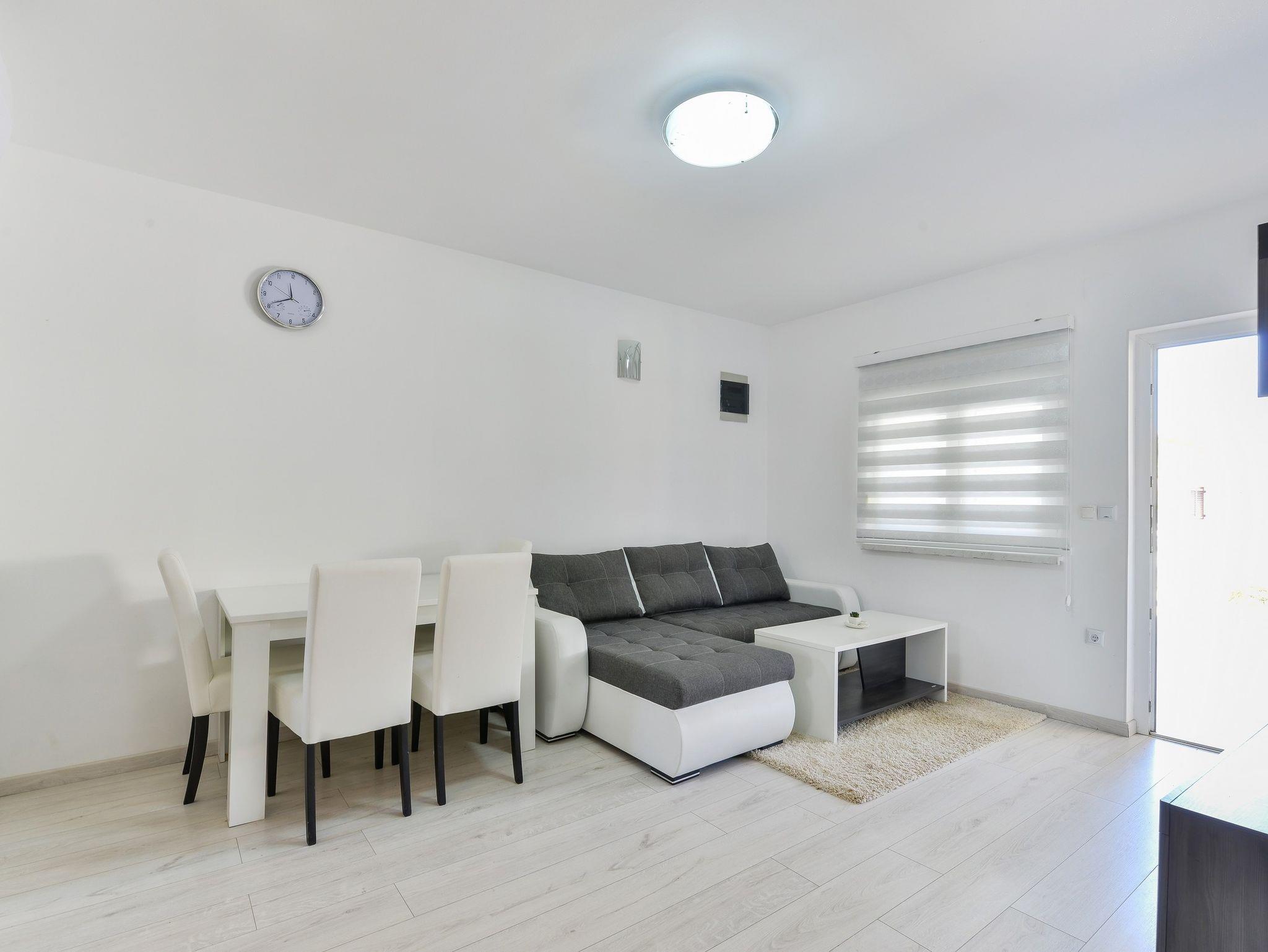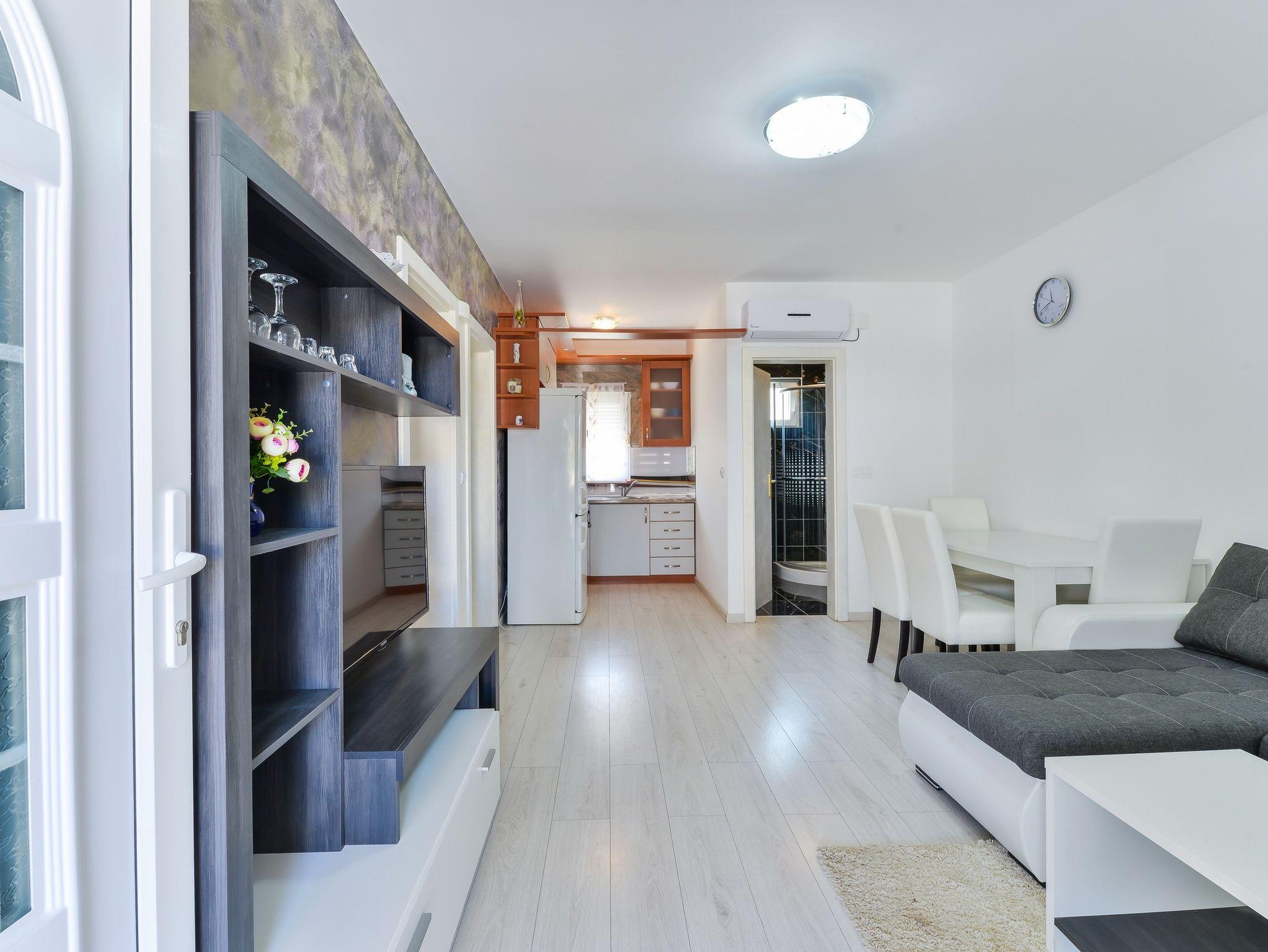 Ferienwohnung bietet Platz für 6 Gäste. Die Betten sind in Schlafzimmern, die es 2 gibt, und in Wohnzimmer, innerhalb einer Gesamtfläche von 47m2, angeordnet. Die Gäste haben eine eigene Terrasse zur Verfügung, auf der sie in warmen Sommernächten genießen können. Das Apartment bietet Meerblick. Es ist erlaubt, Speisen auf dem Gemeinschafts-Grill vorzubereiten. IM PREIS INBEGRIFFEN: Kurtaxe, Endreinigung, Klimatisierung, Parkplatz, Internet, Wäschewaschen, Kinderbett. VERBINDLICHE ZUSÄTZLICHE KOSTEN: Aufzahlung für Kurzaufenthalte (prozentualer Zuschlag pro Nächtigungsanzahl: 30% - 1, 20% - 2, 10% - 3). Die Verfügbarkeit zusätzlicher Dienstleistungen in Ihrem reservierten Termin und die Preise derselben (falls nicht aufgeführt) müssen im Voraus überprüft werden. Zusätzliche Dienstleistungen die in der Zahlungsaufforderung nicht aufgeführt sind werden direkt beim Vermieter bezahlt, angenommen der Gast nutzt auch diese.