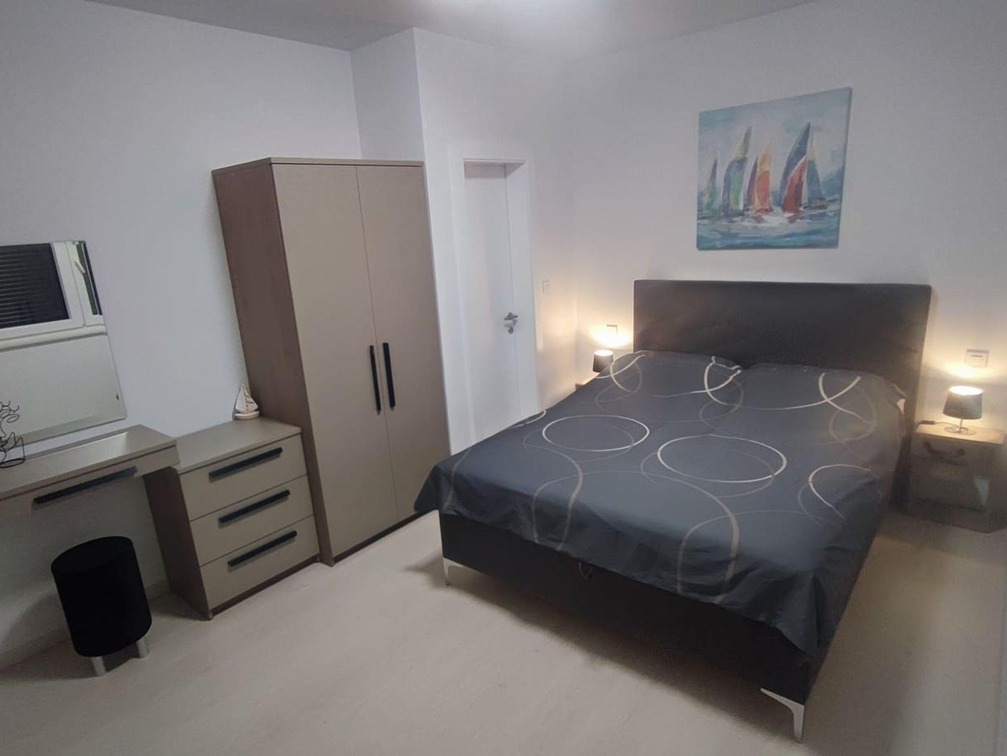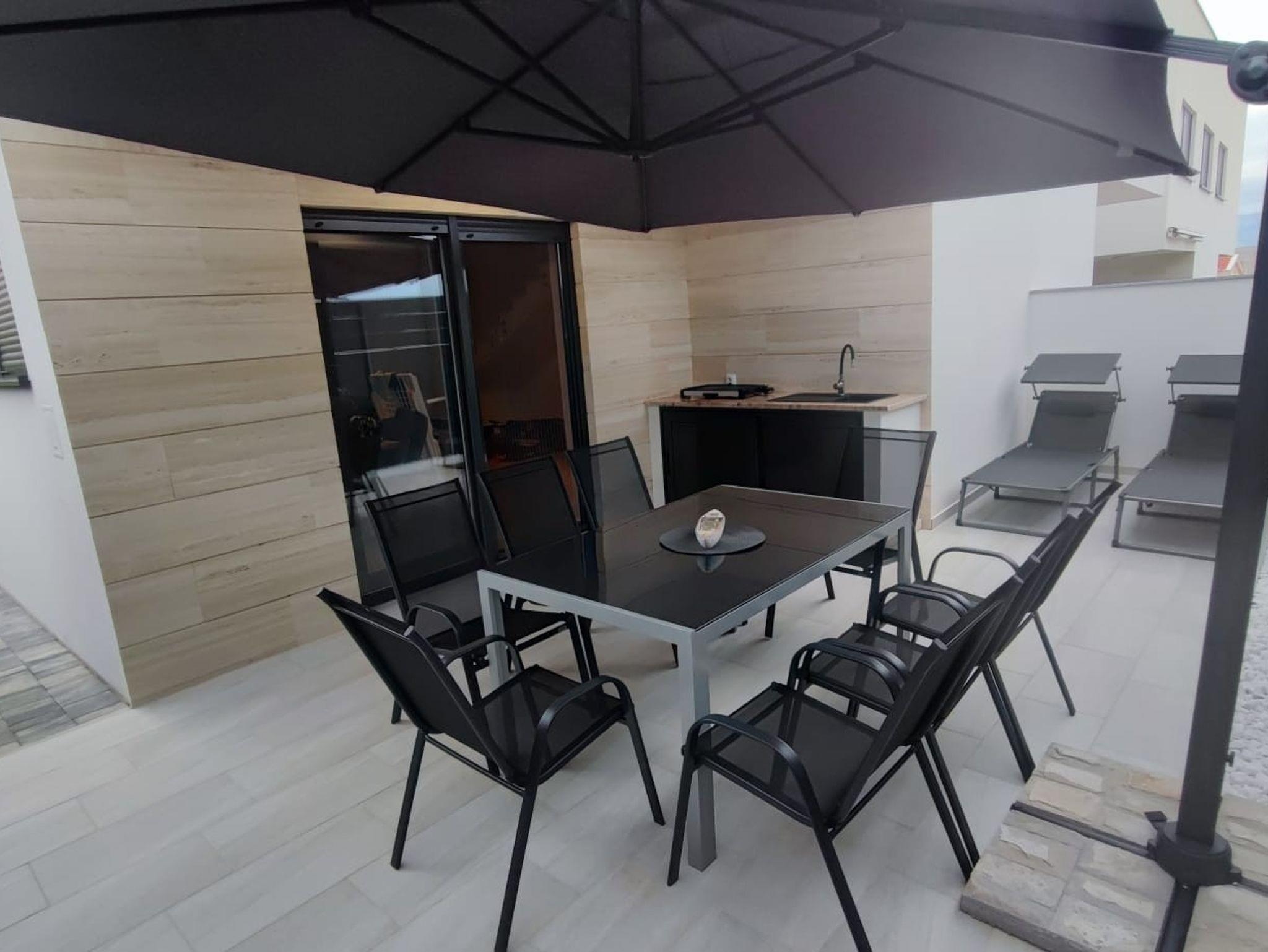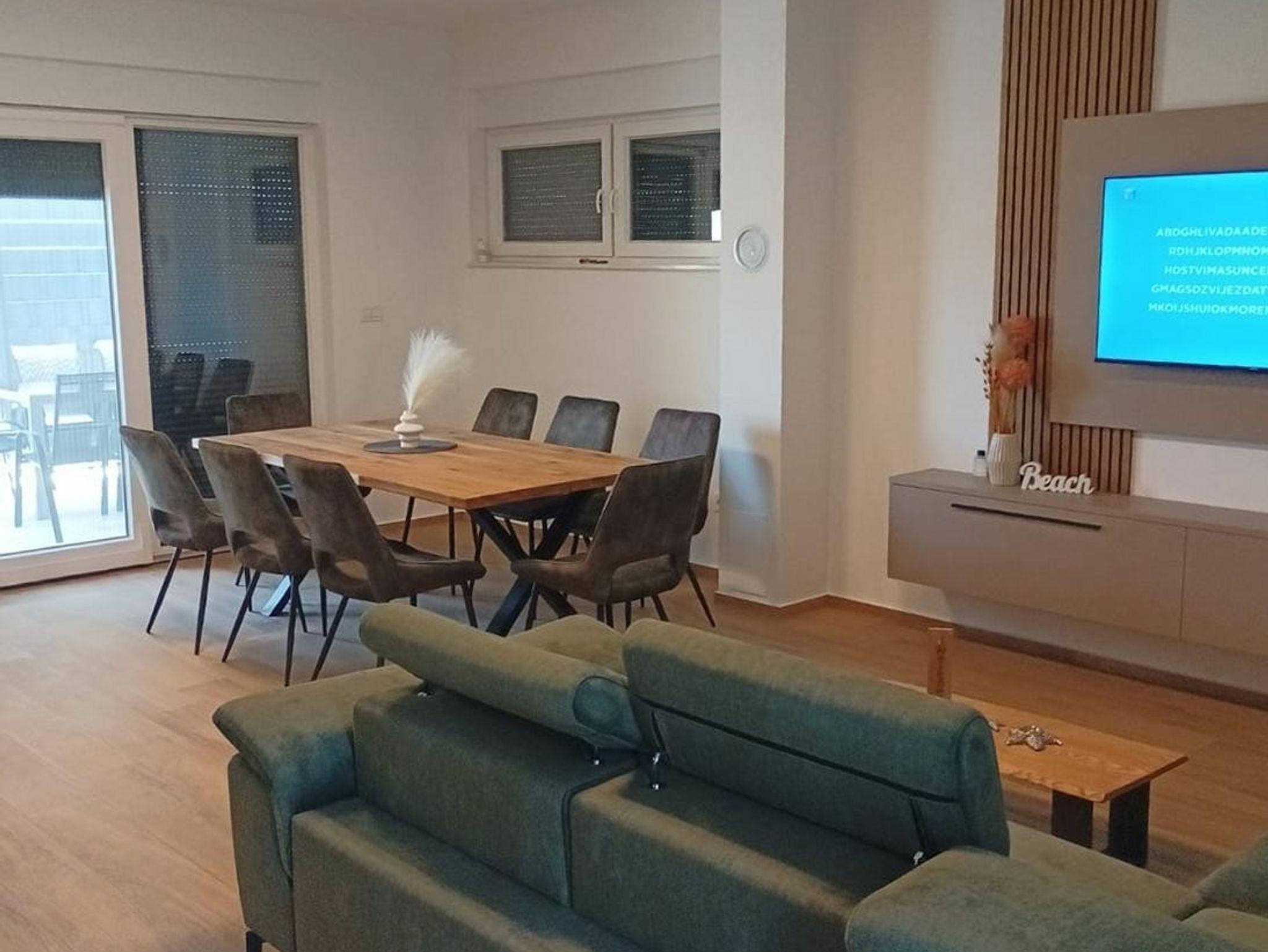 Haus bietet Platz für 8 Gäste. Die Betten sind in Schlafzimmern, die es 3 gibt, und in Wohnzimmer, innerhalb einer Gesamtfläche von 118m2, angeordnet. Die Gäste haben eine eigene Terrasse zur Verfügung, auf der sie in warmen Sommernächten genießen können. Für vollen Genuss und Entspannung gibt es einen privaten Grill für Gäste dieser Unterkunft. IM PREIS INBEGRIFFEN: Kurtaxe, Endreinigung, Klimatisierung, Parkplatz, Internet, Kinderbett, Bügeleisen, Bügelbrett, Föhn. VERBINDLICHE ZUSÄTZLICHE KOSTEN: Aufzahlung für Kurzaufenthalte (prozentualer Zuschlag pro Nächtigungsanzahl: 30% - 1, 20% - 2, 10% - 3). Die Verfügbarkeit zusätzlicher Dienstleistungen in Ihrem reservierten Termin und die Preise derselben (falls nicht aufgeführt) müssen im Voraus überprüft werden. Zusätzliche Dienstleistungen die in der Zahlungsaufforderung nicht aufgeführt sind werden direkt beim Vermieter bezahlt, angenommen der Gast nutzt auch diese.
