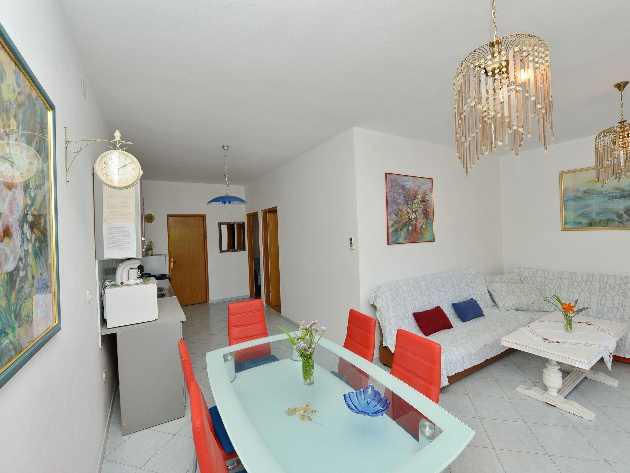 Ferienwohnung bietet Platz für 5 Gäste. Die Betten sind in Schlafzimmern, die es 2 gibt, und in Wohnzimmer, innerhalb einer Gesamtfläche von 55m2, angeordnet. Die Gäste haben eine eigene Terrasse zur Verfügung, auf der sie in warmen Sommernächten genießen können. Das Apartment bietet Meerblick. Es ist erlaubt, Speisen auf dem Gemeinschafts-Grill vorzubereiten. IM PREIS INBEGRIFFEN: Kurtaxe, Endreinigung, Klimatisierung, Parkplatz, Internet, Bügeleisen, Bügelbrett, Föhn. Die Verfügbarkeit zusätzlicher Dienstleistungen in Ihrem reservierten Termin und die Preise derselben (falls nicht aufgeführt) müssen im Voraus überprüft werden. Zusätzliche Dienstleistungen die in der Zahlungsaufforderung nicht aufgeführt sind werden direkt beim Vermieter bezahlt, angenommen der Gast nutzt auch diese. Ermäßigung auf den Grundpreis: Gratistag 14=13 (bei einem Aufenthalt von 14 Tagen oder mehr erhalten Sie einen Gratistag für den Aufenthalt bis 31.12.26).