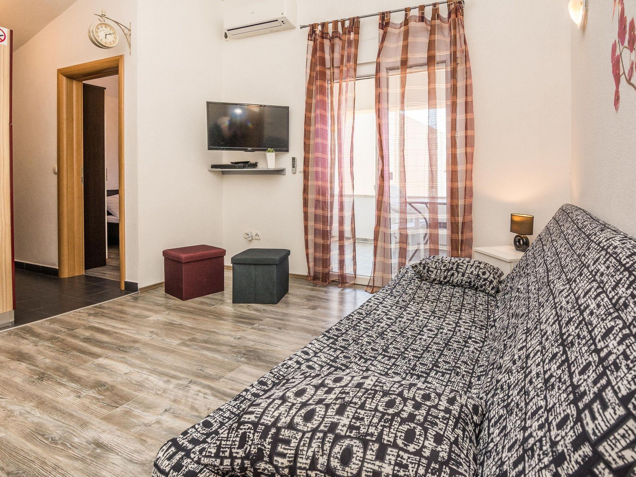 Ferienwohnung bietet Platz für 4 Gäste. Die Betten sind in Schlafzimmern, die es 1 gibt, und in Wohnzimmer, innerhalb einer Gesamtfläche von 27m2, angeordnet. Die Gäste haben eine eigene Terrasse zur Verfügung, auf der sie in warmen Sommernächten genießen können. Es ist erlaubt, Speisen auf dem Gemeinschafts-Grill vorzubereiten. IM PREIS INBEGRIFFEN: Kurtaxe, Endreinigung, Klimatisierung, Parkplatz, Internet, Kinderbett, Föhn. VERBINDLICHE ZUSÄTZLICHE KOSTEN: Aufzahlung für Kurzaufenthalte (prozentualer Zuschlag pro Nächtigungsanzahl: 30% - 1, 20% - 2, 10% - 3). Die Verfügbarkeit zusätzlicher Dienstleistungen in Ihrem reservierten Termin und die Preise derselben (falls nicht aufgeführt) müssen im Voraus überprüft werden. Zusätzliche Dienstleistungen die in der Zahlungsaufforderung nicht aufgeführt sind werden direkt beim Vermieter bezahlt, angenommen der Gast nutzt auch diese.