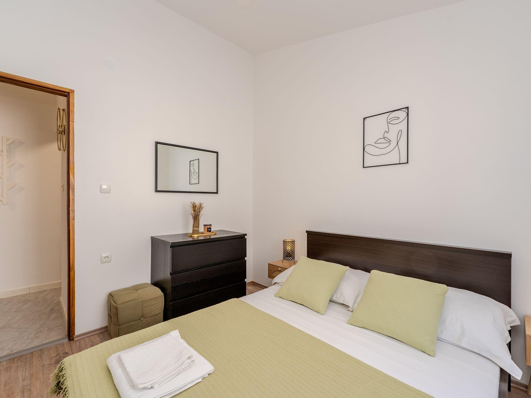 Ferienwohnung bietet Platz für 5 Gäste. Die Betten sind in Schlafzimmern, die es 2 gibt, und in Wohnzimmer, innerhalb einer Gesamtfläche von 42m2, angeordnet. Die Gäste haben einen eigenen Balkon zur Verfügung, auf der sie in warmen Sommernächten genießen können. Es ist erlaubt, Speisen auf dem Gemeinschafts-Grill vorzubereiten. IM PREIS INBEGRIFFEN: Kurtaxe, Endreinigung, Klimatisierung, Parkplatz, Internet, Föhn. VERBINDLICHE ZUSÄTZLICHE KOSTEN: Aufzahlung für Kurzaufenthalte (prozentualer Zuschlag pro Nächtigungsanzahl: 30% - 1, 20% - 2, 10% - 3). Die Verfügbarkeit zusätzlicher Dienstleistungen in Ihrem reservierten Termin und die Preise derselben (falls nicht aufgeführt) müssen im Voraus überprüft werden. Zusätzliche Dienstleistungen die in der Zahlungsaufforderung nicht aufgeführt sind werden direkt beim Vermieter bezahlt, angenommen der Gast nutzt auch diese.