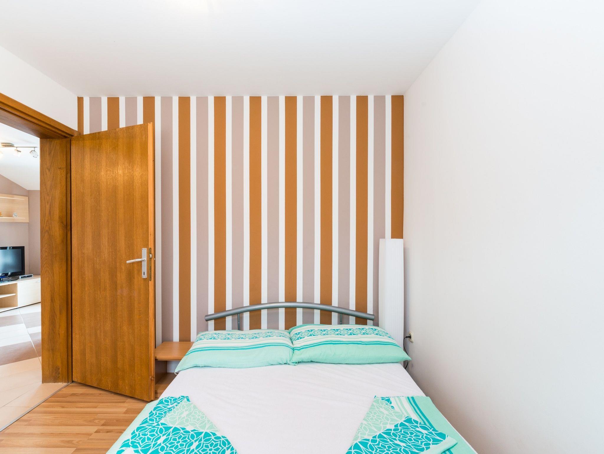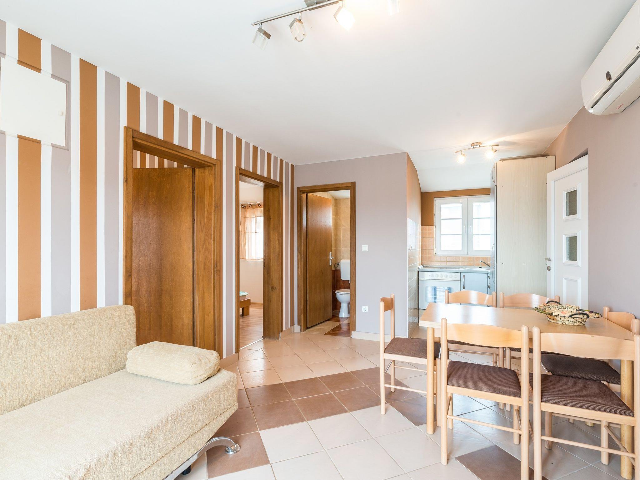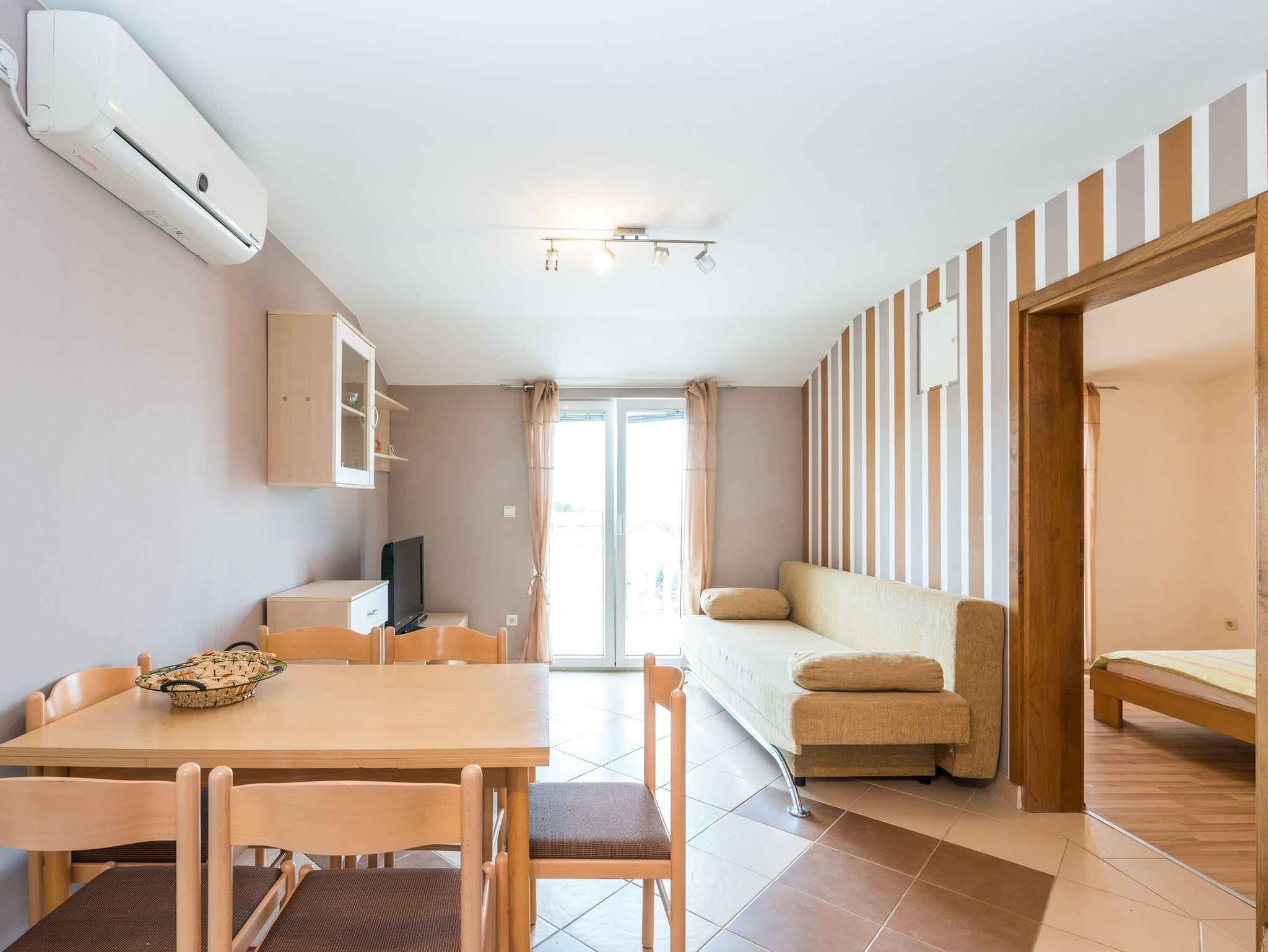 Ferienwohnung bietet Platz für 6 Gäste. Die Betten sind in Schlafzimmern, die es 2 gibt, und in Wohnzimmer, innerhalb einer Gesamtfläche von 43m2, angeordnet. Die Gäste haben einen eigenen Balkon zur Verfügung, auf der sie in warmen Sommernächten genießen können. Das Apartment bietet Meerblick. Es ist erlaubt, Speisen auf dem Gemeinschafts-Grill vorzubereiten. IM PREIS INBEGRIFFEN: Kurtaxe, Endreinigung, Klimatisierung, Parkplatz, Internet, Kinderbett, Föhn. VERBINDLICHE ZUSÄTZLICHE KOSTEN: Aufzahlung für Kurzaufenthalte (prozentualer Zuschlag pro Nächtigungsanzahl: 30% - 1, 20% - 2, 10% - 3). Die Verfügbarkeit zusätzlicher Dienstleistungen in Ihrem reservierten Termin und die Preise derselben (falls nicht aufgeführt) müssen im Voraus überprüft werden. Zusätzliche Dienstleistungen die in der Zahlungsaufforderung nicht aufgeführt sind werden direkt beim Vermieter bezahlt, angenommen der Gast nutzt auch diese.