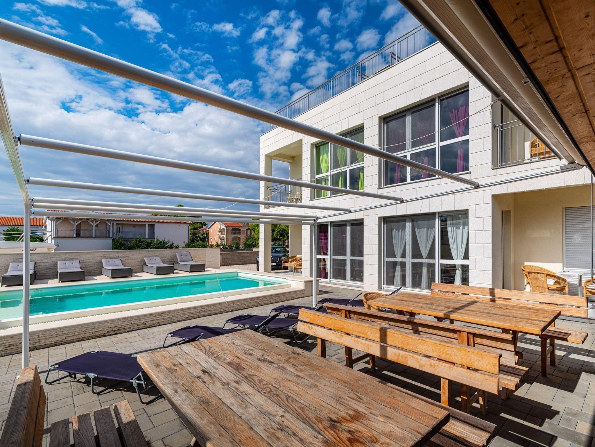Umgebung des Objekts (Eingerichtet), Hof (100m2, Kinderbereich, Sitzbereich), Parkplatz (Anzahl der Parkplätze: 12, Entfernung vom Objekt: im Hof), Pool: gemeinsam, Dimensionen: 9m x 5m x 1.6m, Wassertyp: Salzwasser, Grill: gemeinsam, WiFi Internet, Kinderbett