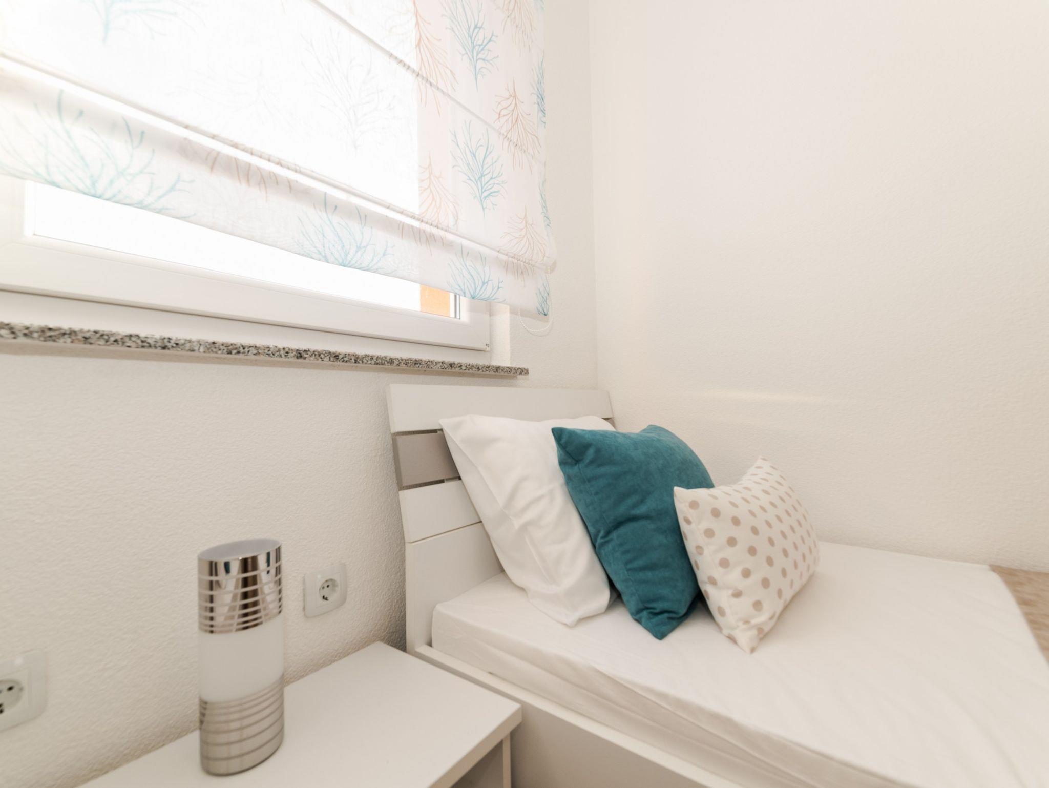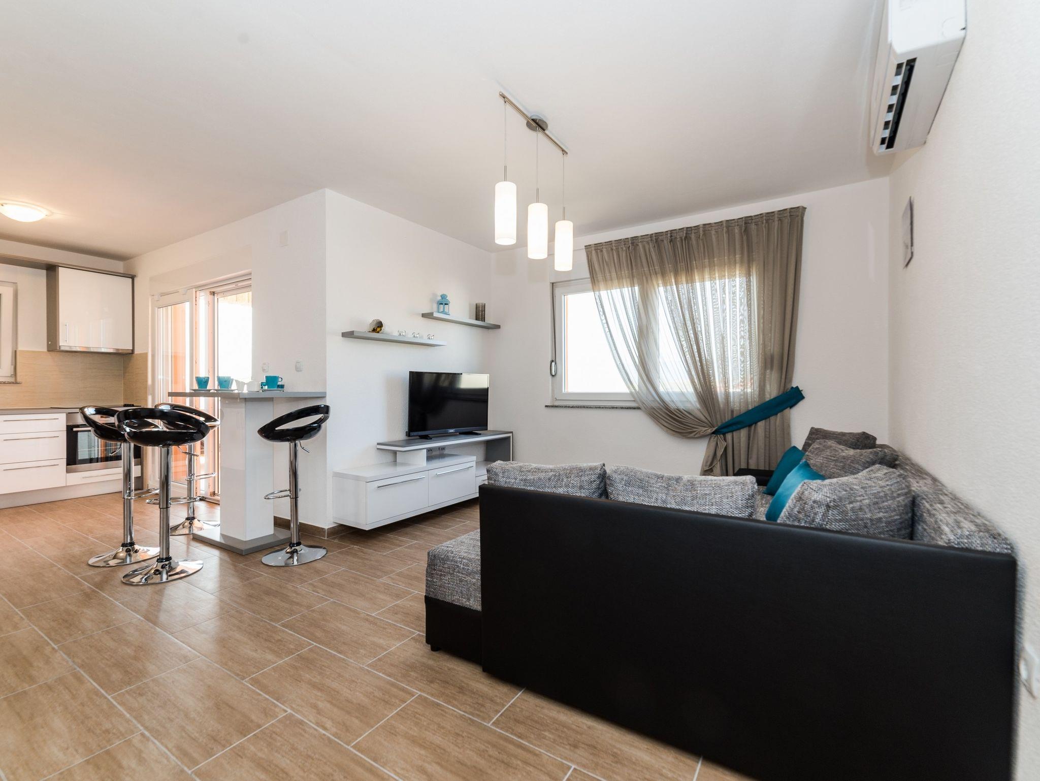 Ferienwohnung bietet Platz für 6 Gäste. Die Betten sind in Schlafzimmern, die es 2 gibt, und in Wohnzimmer, innerhalb einer Gesamtfläche von 75m2, angeordnet. Die Gäste haben einen eigenen Balkon zur Verfügung, auf der sie in warmen Sommernächten genießen können. Das Apartment bietet Meerblick. Es ist erlaubt, Speisen auf dem Gemeinschafts-Grill vorzubereiten. IM PREIS INBEGRIFFEN: Kurtaxe, Endreinigung, Klimatisierung, Parkplatz, Internet, Kinderbett, Bügeleisen, Bügelbrett, Föhn. VERBINDLICHE ZUSÄTZLICHE KOSTEN: Aufzahlung für Kurzaufenthalte (prozentualer Zuschlag pro Nächtigungsanzahl: 30% - 1, 20% - 2, 10% - 3). Die Verfügbarkeit zusätzlicher Dienstleistungen in Ihrem reservierten Termin und die Preise derselben (falls nicht aufgeführt) müssen im Voraus überprüft werden. Zusätzliche Dienstleistungen die in der Zahlungsaufforderung nicht aufgeführt sind werden direkt beim Vermieter bezahlt, angenommen der Gast nutzt auch diese.