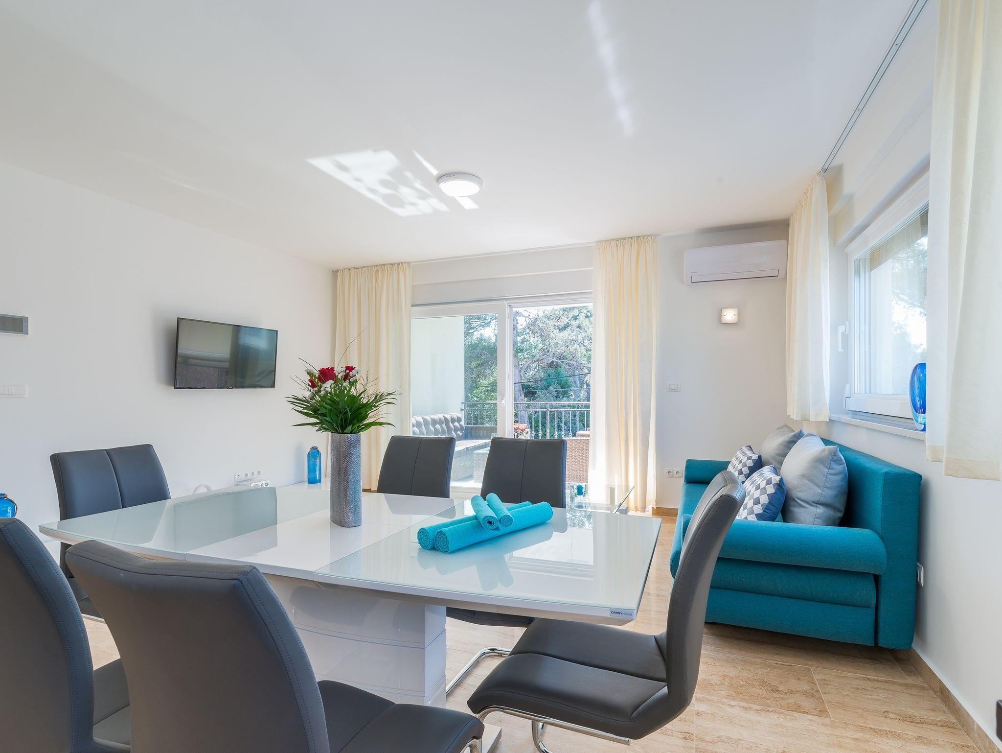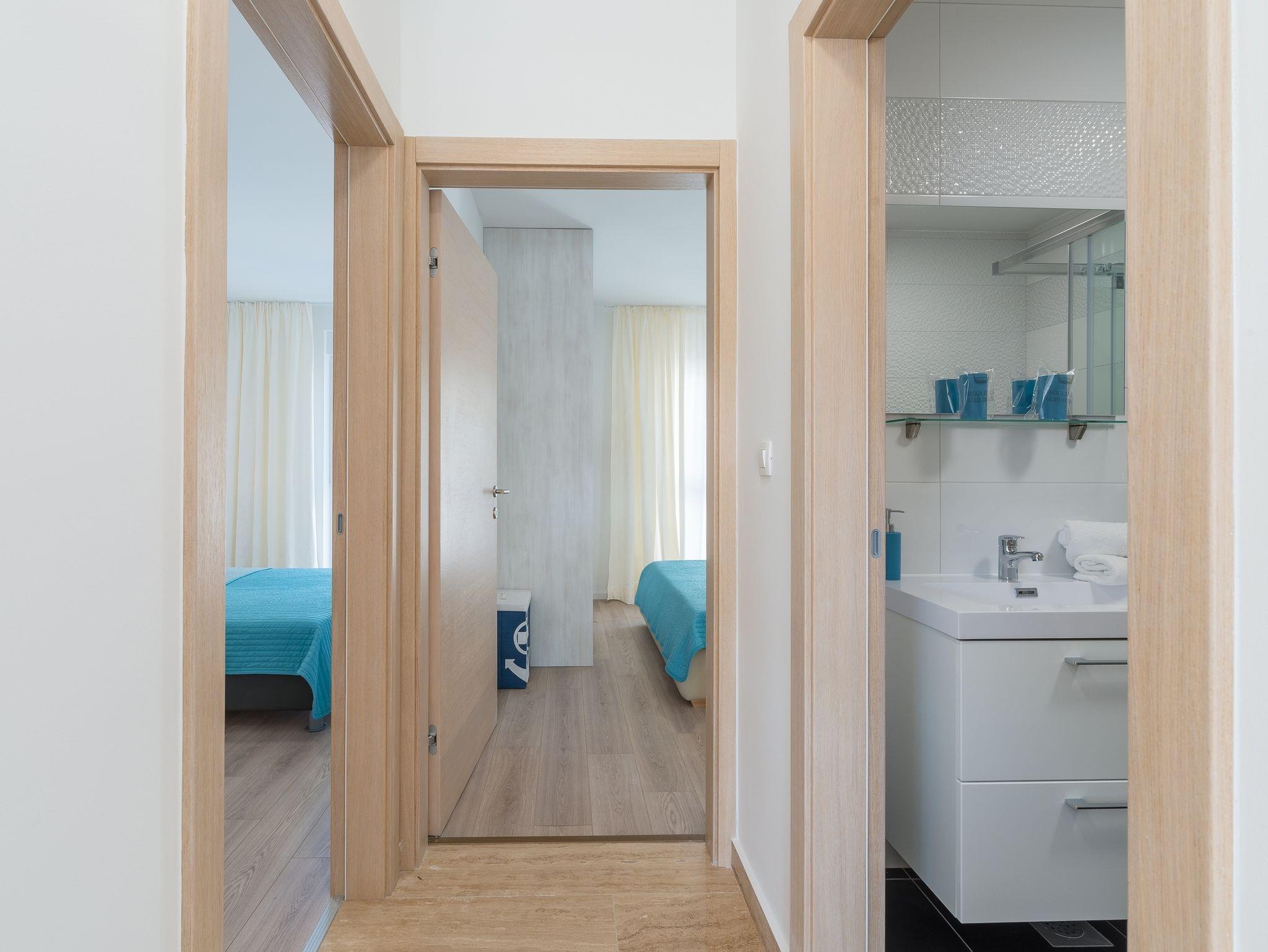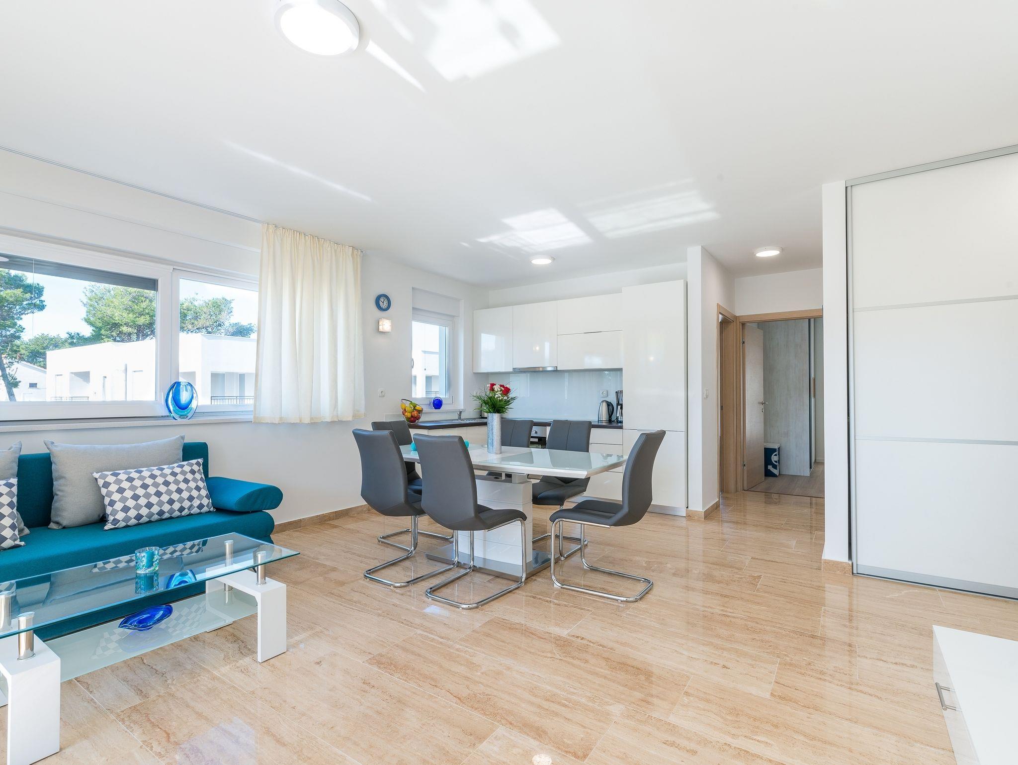 Ferienwohnung bietet Platz für 6 Gäste. Die Betten sind in Schlafzimmern, die es 2 gibt, und in Wohnzimmer, innerhalb einer Gesamtfläche von 65m2, angeordnet. Die Gäste haben eine eigene Terrasse zur Verfügung, auf der sie in warmen Sommernächten genießen können. Es ist erlaubt, Speisen auf dem Gemeinschafts-Grill vorzubereiten. IM PREIS INBEGRIFFEN: Kurtaxe, Endreinigung, Klimatisierung, Parkplatz, Internet, Kinderbett, Bügeleisen, Bügelbrett, Föhn. VERBINDLICHE ZUSÄTZLICHE KOSTEN: Aufzahlung für Kurzaufenthalte (prozentualer Zuschlag pro Nächtigungsanzahl: 30% - 1, 20% - 2, 10% - 3). Die Verfügbarkeit zusätzlicher Dienstleistungen in Ihrem reservierten Termin und die Preise derselben (falls nicht aufgeführt) müssen im Voraus überprüft werden. Zusätzliche Dienstleistungen die in der Zahlungsaufforderung nicht aufgeführt sind werden direkt beim Vermieter bezahlt, angenommen der Gast nutzt auch diese.
