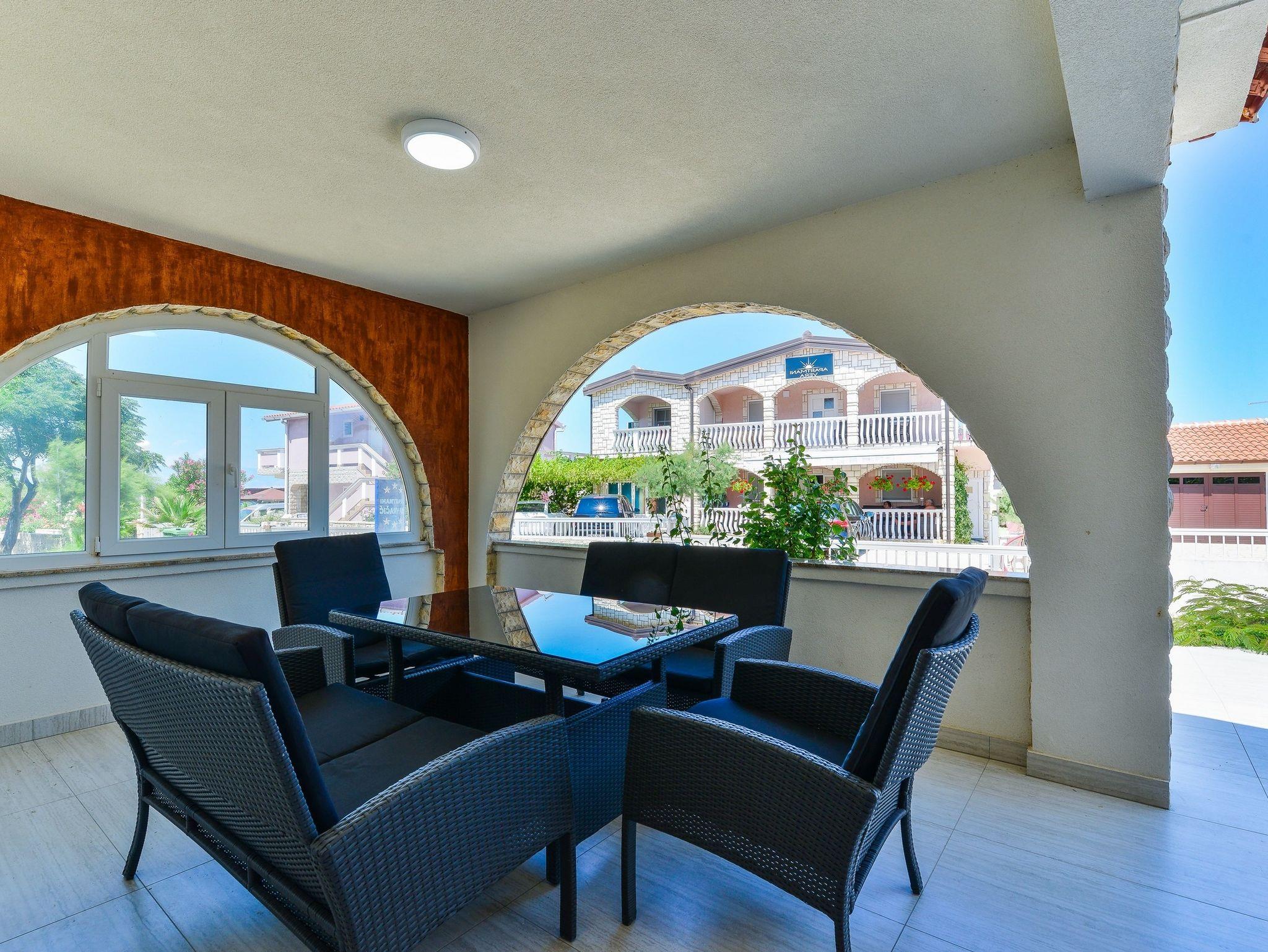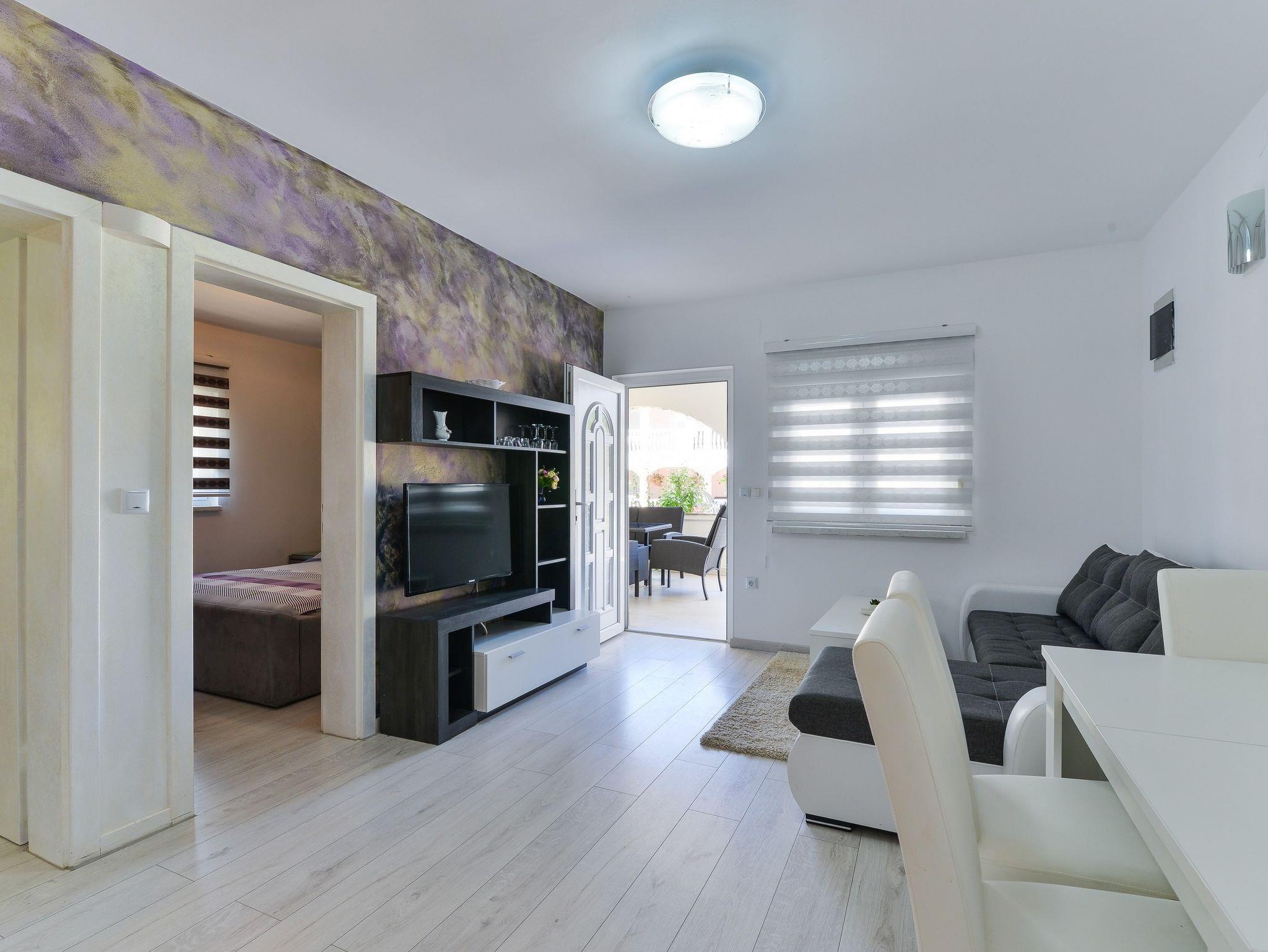 Ferienwohnung bietet Platz für 6 Gäste. Die Betten sind in Schlafzimmern, die es 2 gibt, und in Wohnzimmer, innerhalb einer Gesamtfläche von 47m2, angeordnet. Die Gäste haben eine eigene Terrasse zur Verfügung, auf der sie in warmen Sommernächten genießen können. Es ist erlaubt, Speisen auf dem Gemeinschafts-Grill vorzubereiten. IM PREIS INBEGRIFFEN: Kurtaxe, Endreinigung, Klimatisierung, Parkplatz, Internet, Wäschewaschen, Kinderbett. VERBINDLICHE ZUSÄTZLICHE KOSTEN: Aufzahlung für Kurzaufenthalte (prozentualer Zuschlag pro Nächtigungsanzahl: 30% - 1, 20% - 2, 10% - 3). Die Verfügbarkeit zusätzlicher Dienstleistungen in Ihrem reservierten Termin und die Preise derselben (falls nicht aufgeführt) müssen im Voraus überprüft werden. Zusätzliche Dienstleistungen die in der Zahlungsaufforderung nicht aufgeführt sind werden direkt beim Vermieter bezahlt, angenommen der Gast nutzt auch diese.