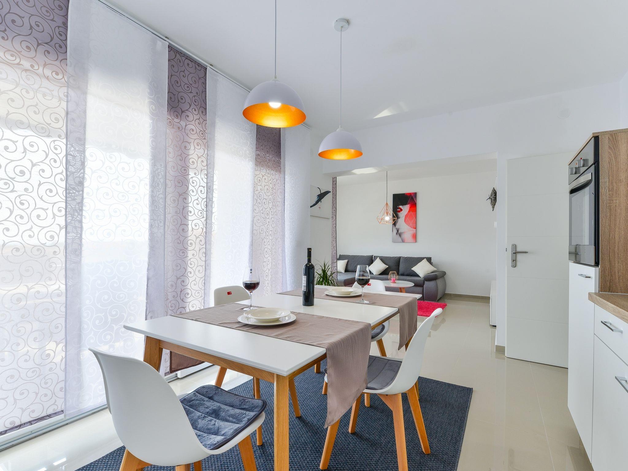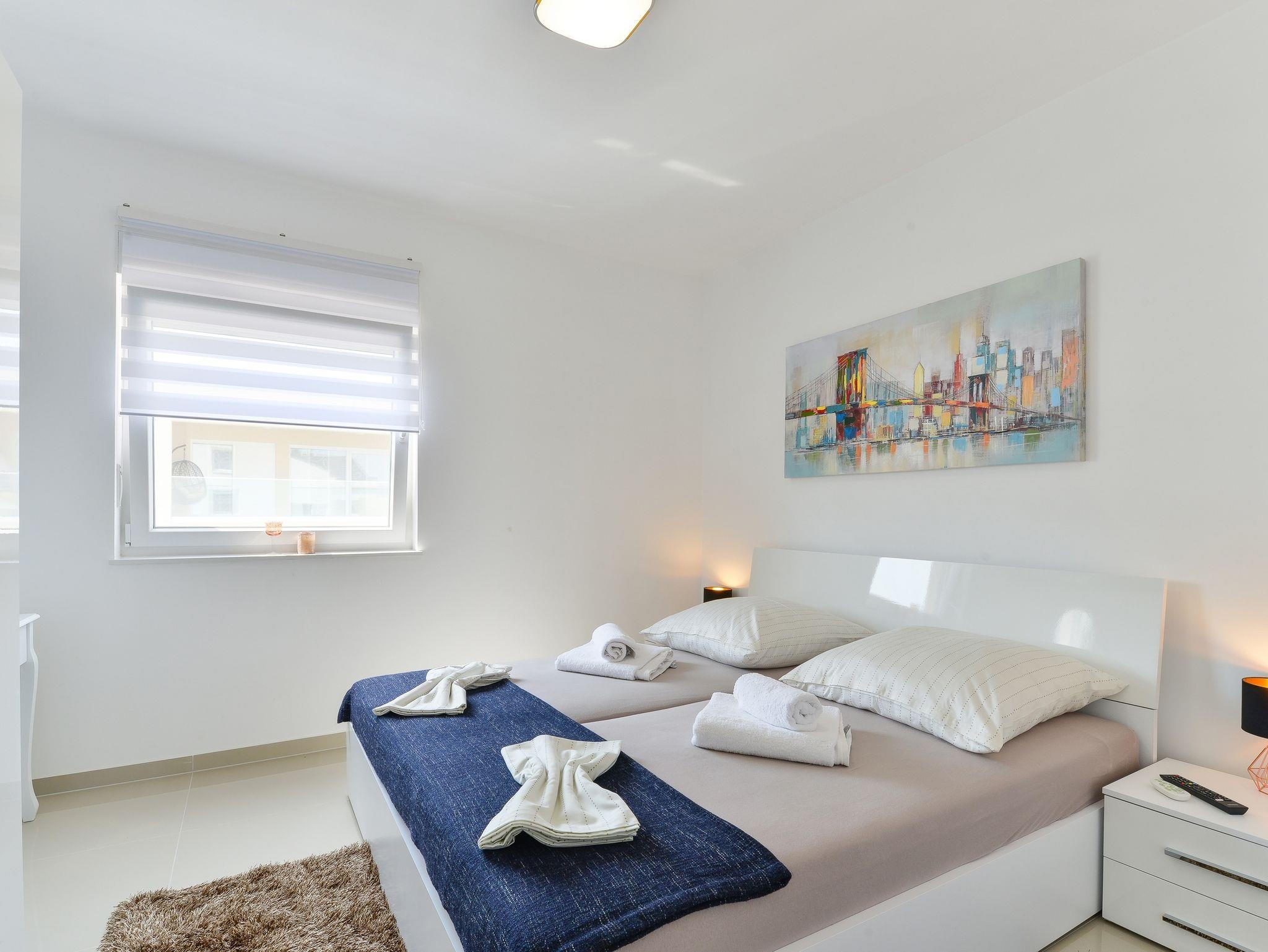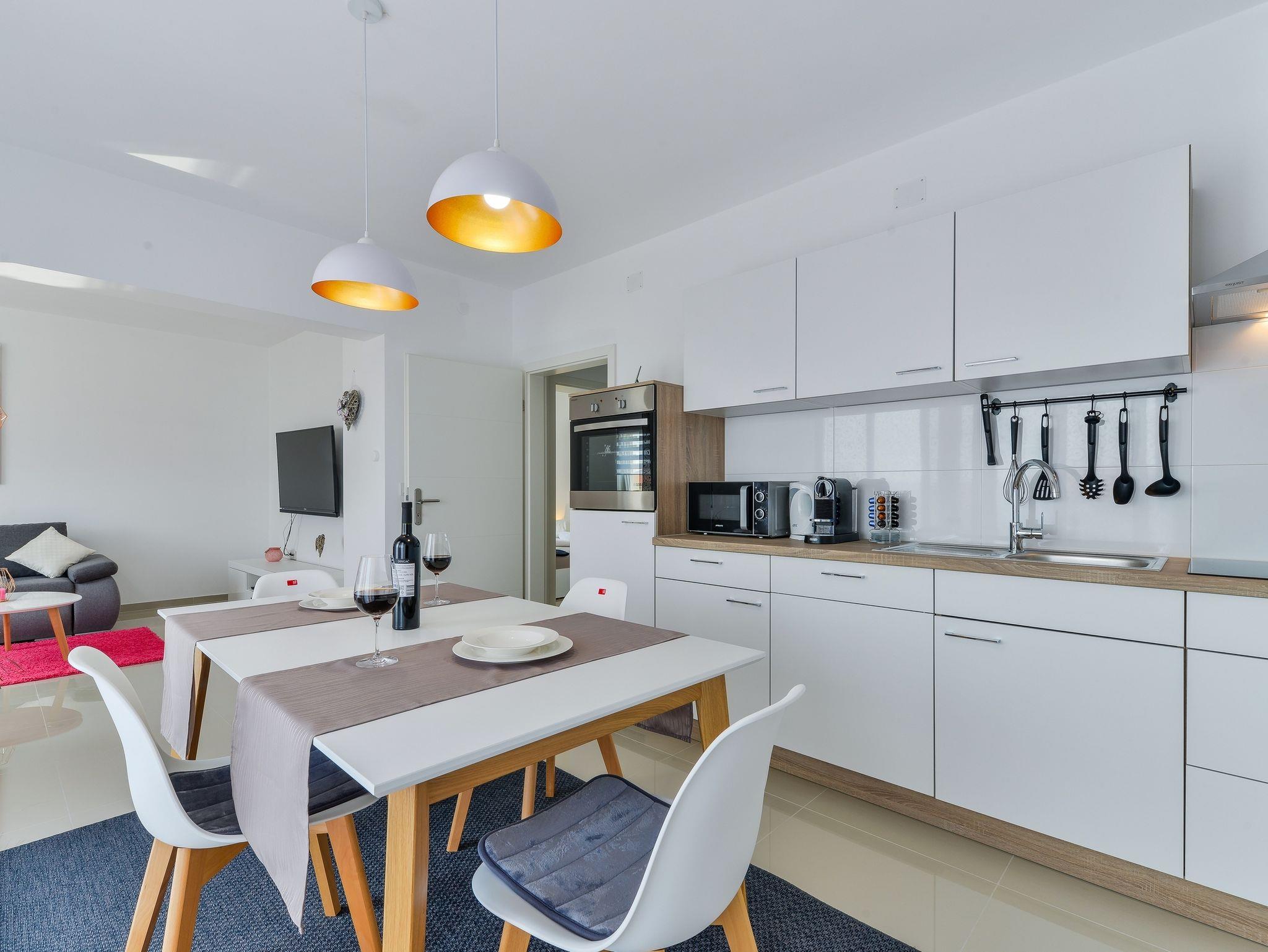Ferienwohnung bietet Platz für 4 Gäste. Die Betten sind in Schlafzimmern, die es 1 gibt, und in Wohnzimmer, innerhalb einer Gesamtfläche von 60m2, angeordnet. Die Gäste haben einen eigenen Balkon zur Verfügung, auf der sie in warmen Sommernächten genießen können. Das Apartment bietet Meerblick. Es ist erlaubt, Speisen auf dem Gemeinschafts-Grill vorzubereiten. Während ihres Aufenthalts können Gäste das gemeinsam zur Nutzung stehende Schwimmbad benutzen. IM PREIS INBEGRIFFEN: Kurtaxe, Endreinigung, Klimatisierung, Pool, Parkplatz, Internet, Kinderbett, Bügeleisen, Bügelbrett, Föhn. VERBINDLICHE ZUSÄTZLICHE KOSTEN: Aufzahlung für Kurzaufenthalte (prozentualer Zuschlag pro Nächtigungsanzahl: 30% - 1, 20% - 2, 10% - 3). Die Verfügbarkeit zusätzlicher Dienstleistungen in Ihrem reservierten Termin und die Preise derselben (falls nicht aufgeführt) müssen im Voraus überprüft werden. Zusätzliche Dienstleistungen die in der Zahlungsaufforderung nicht aufgeführt sind werden direkt beim Vermieter bezahlt, angenommen der Gast nutzt auch diese.