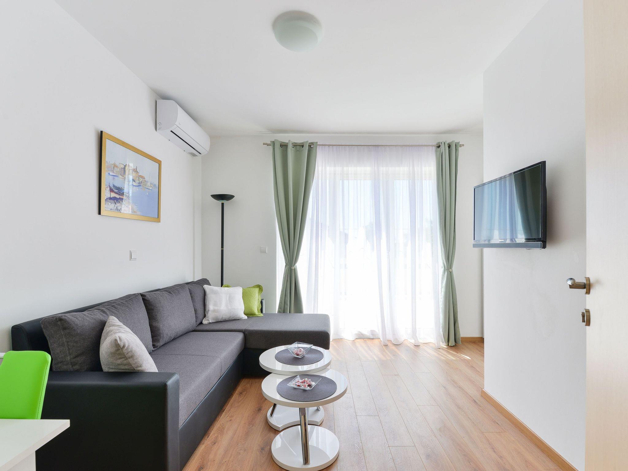 Ferienwohnung bietet Platz für 6 Gäste. Die Betten sind in Schlafzimmern, die es 2 gibt, und in Wohnzimmer, innerhalb einer Gesamtfläche von 59m2, angeordnet. Die Gäste haben eine eigene Terrasse zur Verfügung, auf der sie in warmen Sommernächten genießen können. Es ist erlaubt, Speisen auf dem Gemeinschafts-Grill vorzubereiten. IM PREIS INBEGRIFFEN: Kurtaxe, Endreinigung, Klimatisierung, Parkplatz, Internet, Kinderbett, Bügeleisen, Bügelbrett, Föhn. VERBINDLICHE ZUSÄTZLICHE KOSTEN: Aufzahlung für Kurzaufenthalte (prozentualer Zuschlag pro Nächtigungsanzahl: 30% - 1, 20% - 2, 10% - 3). Die Verfügbarkeit zusätzlicher Dienstleistungen in Ihrem reservierten Termin und die Preise derselben (falls nicht aufgeführt) müssen im Voraus überprüft werden. Zusätzliche Dienstleistungen die in der Zahlungsaufforderung nicht aufgeführt sind werden direkt beim Vermieter bezahlt, angenommen der Gast nutzt auch diese.