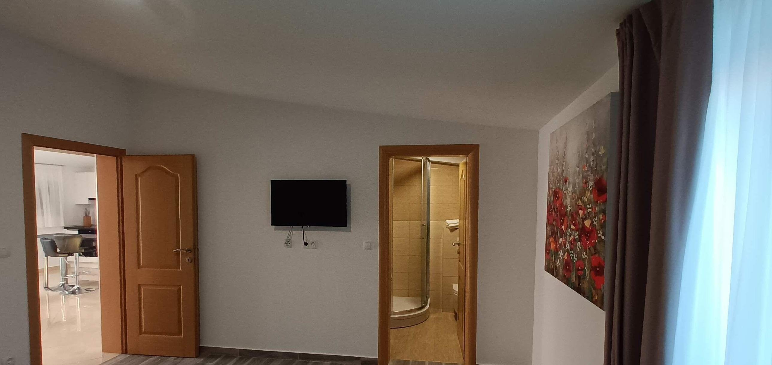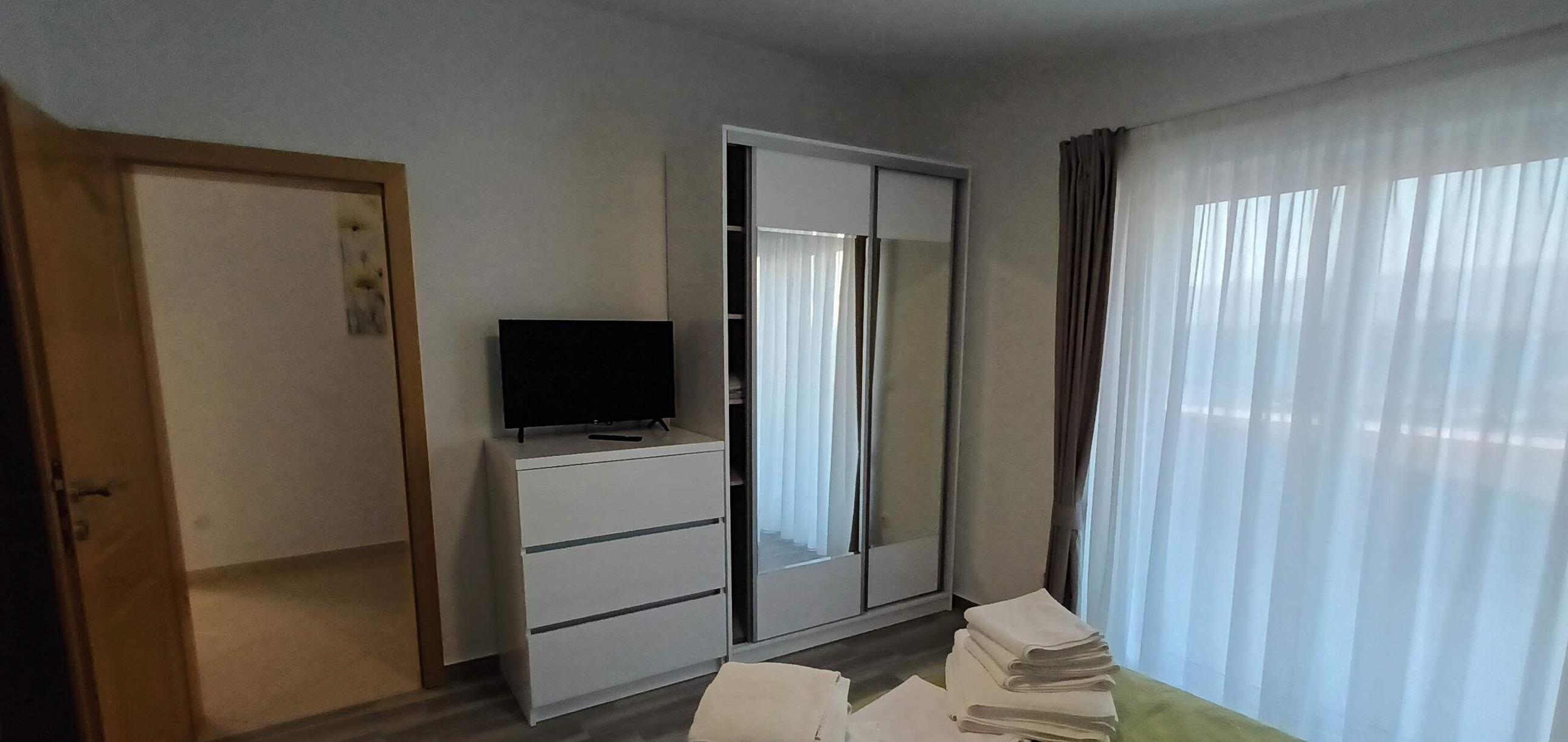 Das Apartment in Größe von 130 qm verfügt über zwei Schlafzimmer und zwei Bäder. Der Wohn- und Essbreich ist mit einem Schlafsofa sowie Essgelegenheit für 6 Personen ausgestattet. Die offene Küche ist mit einem Backofen, 4-Platten-Cerankochfeld-Herd, Spülmaschine, Mikrowelle, Toaster, Wasserkocher, Kaffeemaschine sowie ausreichend Geschirr ausgestattet. Zusätzlich ist noch ein Bügelzimmer mit Bügeleisen, Bügelbrett und Waschmaschine vorhanden.