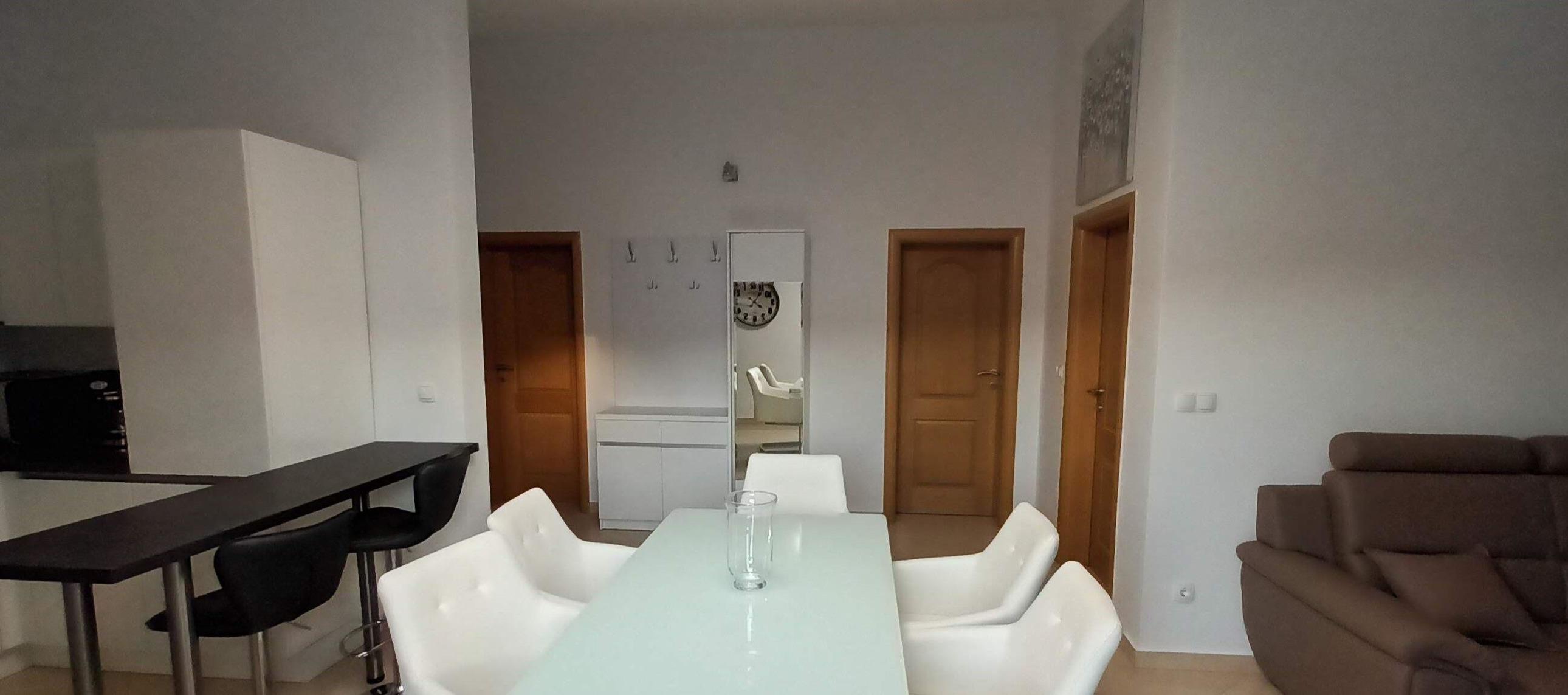 In den zwei Wohnzimmern befinden sich jeweils ein Schlafsofa, sowie Essgelegenheiten für 6 Personen. Die zwei offenen Küchen sind mit Backofen, 4-Platten-Cerankochfeld-Herd, Mikrowelle, Wasserkocher, Toaster, Kühlschrank mit Gefrierschrank, Kaffeemaschine, Spülmaschine, sowie ausreichend Geschirr ausgestattet.