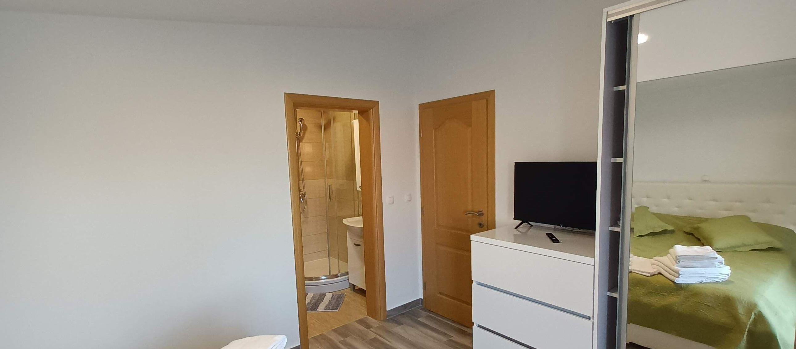 Ein kleinerer Teil der Villa ist als Studio mit einem Schlafzimmer mit Doppelbett, einem Schlafsofa, sowie Küchenzeile mit Kühlschrank, Cerankochfeld und einem Badezimmer ausgestattet