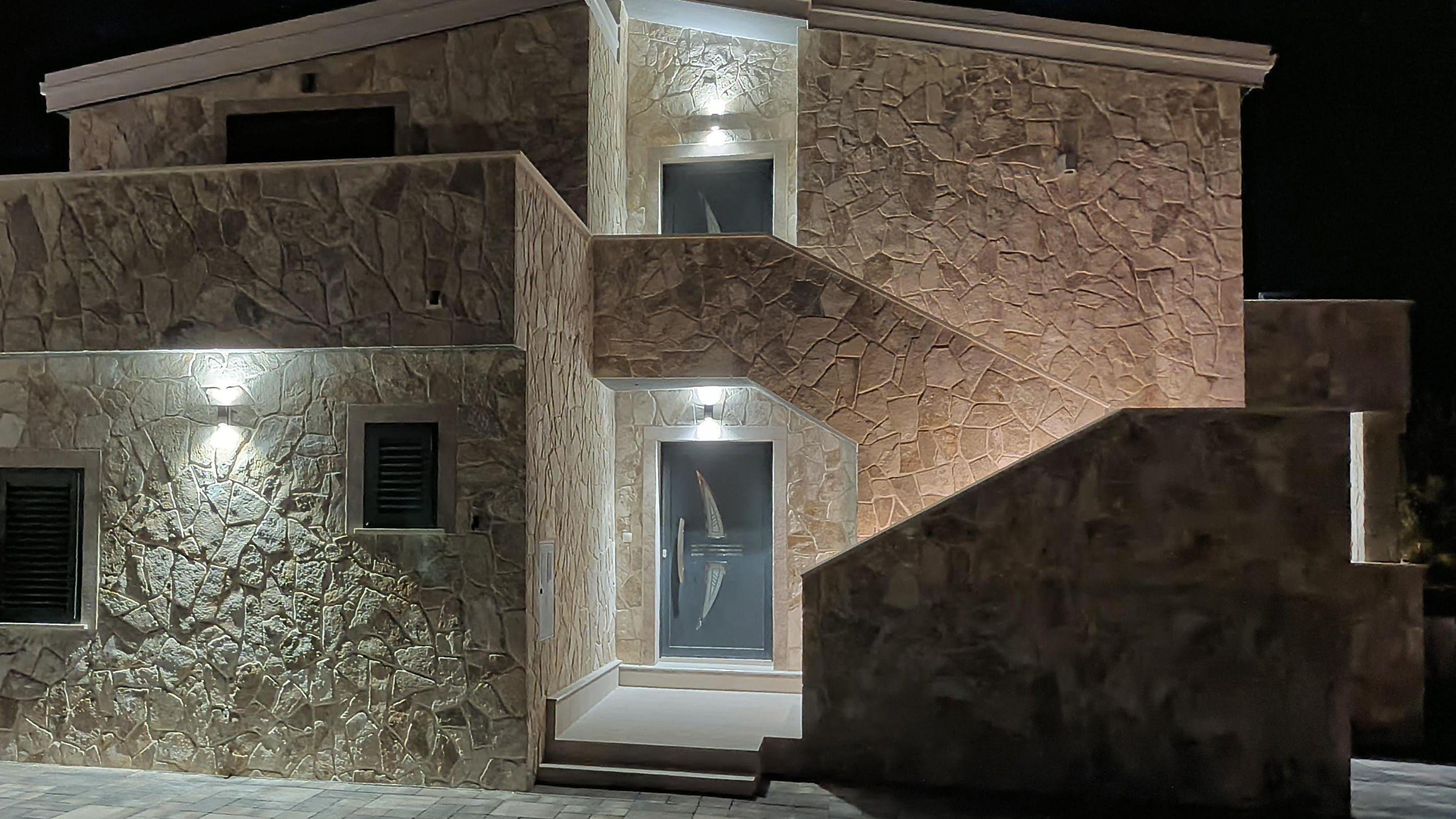 Das steinerne Haus wurde in einem modernen Baustil direkt am Meer erbaut und bietet Platz für maximal 10 Personen. Es besitzt drei Balkone mit Blick auf das Meer und das Velebit Gebirge.
