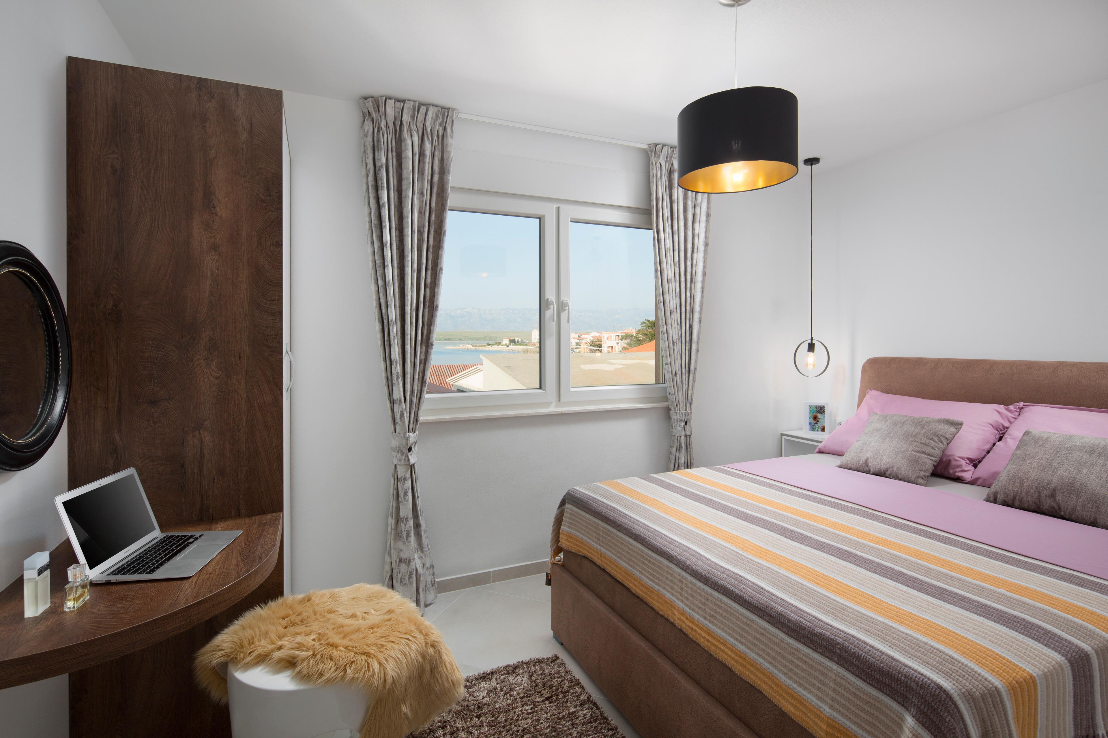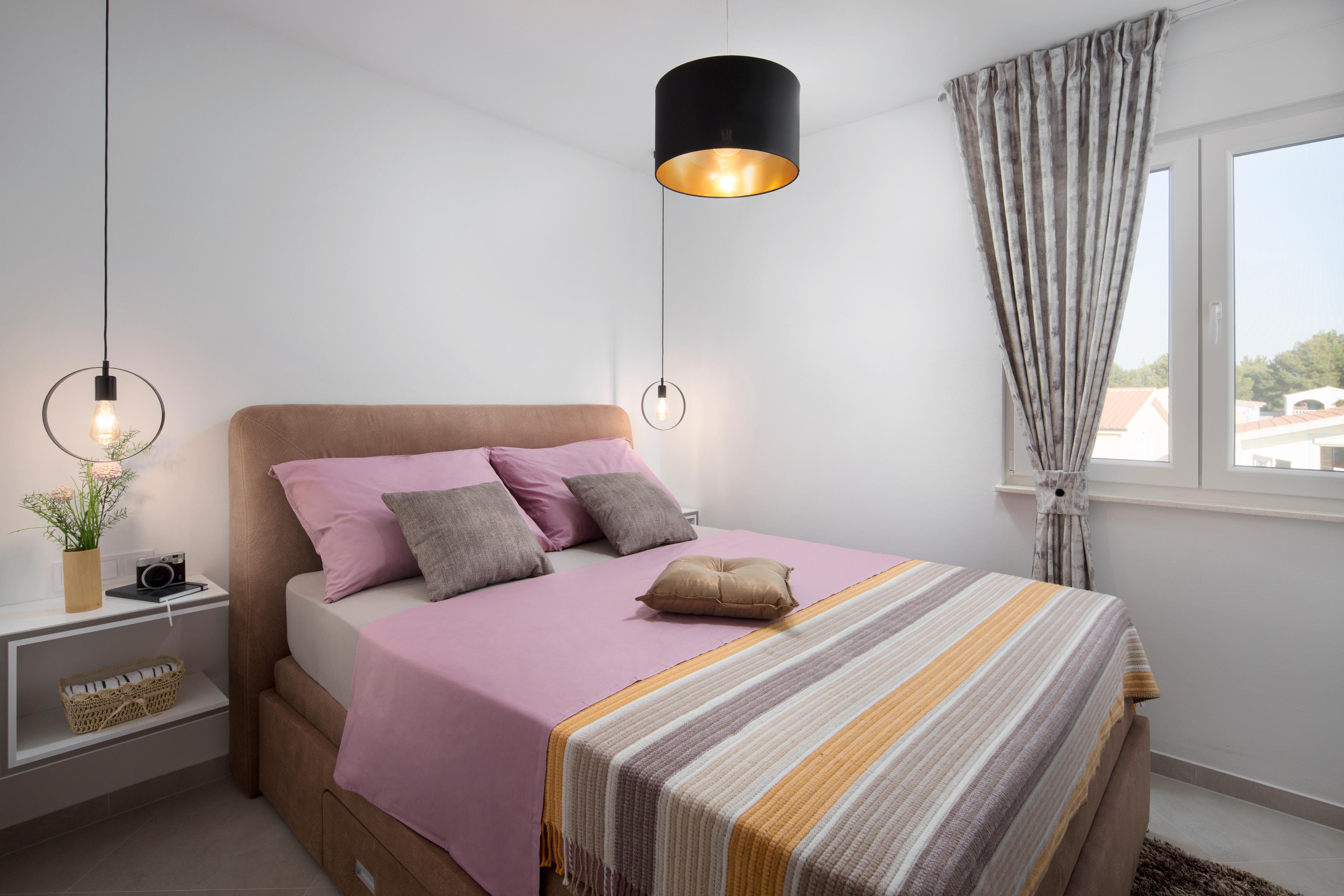 Die 63 m² Ferienunterkunft im dritten Stock des Hauses teilt sich auf ein Wohn- /Essbereich mit voll ausgestatteter Küche, zwei Schlafzimmern mit Doppelbett und ein Badezimmer mit Duschkabine. Zur Wohnung gehört eine 9 m² überdachte Balkon mit Tisch und Stühlen und mit Meerblick. Zu den weiteren Annehmlichkeiten gehören Waschmaschine, Geschirrspüler, Klimaanlage, Internet per WLAN, Sat-TV, Safe und Parkplatz auf dem Grundstück. Ein gemeinsamer Balkon und Lounge Bereich (85 m²) auf dem Dach des Hauses (3. Stock) mit Grill Pavillon, Sitzgarnitur, Liegestühlen und einem atemberaubenden Meerblick ist ein idealer Ort, um dem Alltag in den abendlichen Sonnenuntergang Atmosphäre zu entkommen. Am nahegelegenen Kiesstrand Lucica mit kristallklarem Meer können Sie Sonnenbaden, Schwimmen und Tauchen. Entlang der Küste erstreckt sich eine 7 km lange Promenade. Für diejenigen, die einen mehr aktiven Ferienurlaub bevorzugen, ist diese Promenade ideal für schnelles Gehen oder Laufen. Shops und Restaurants sind nur wenige Gehminuten entfernt.