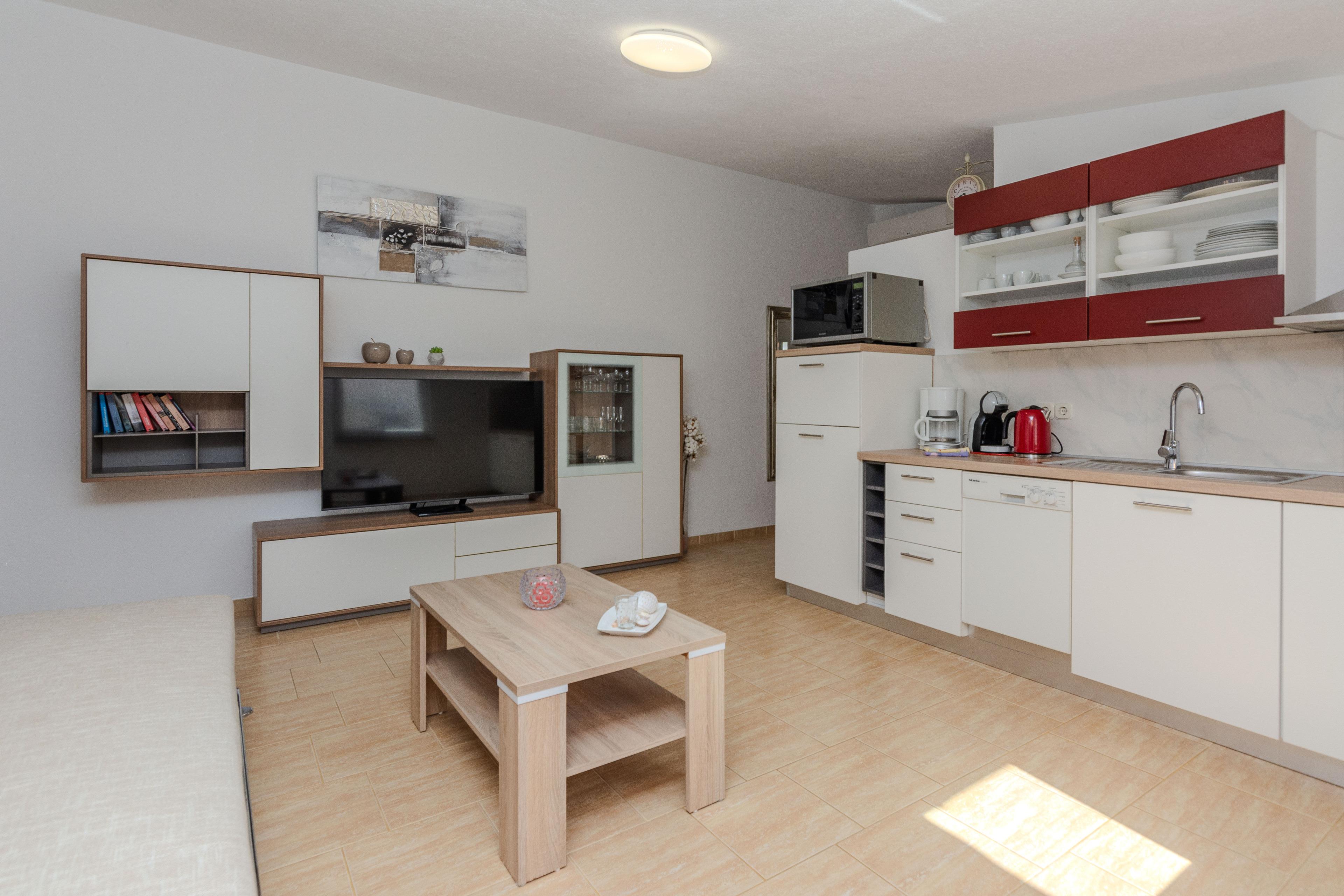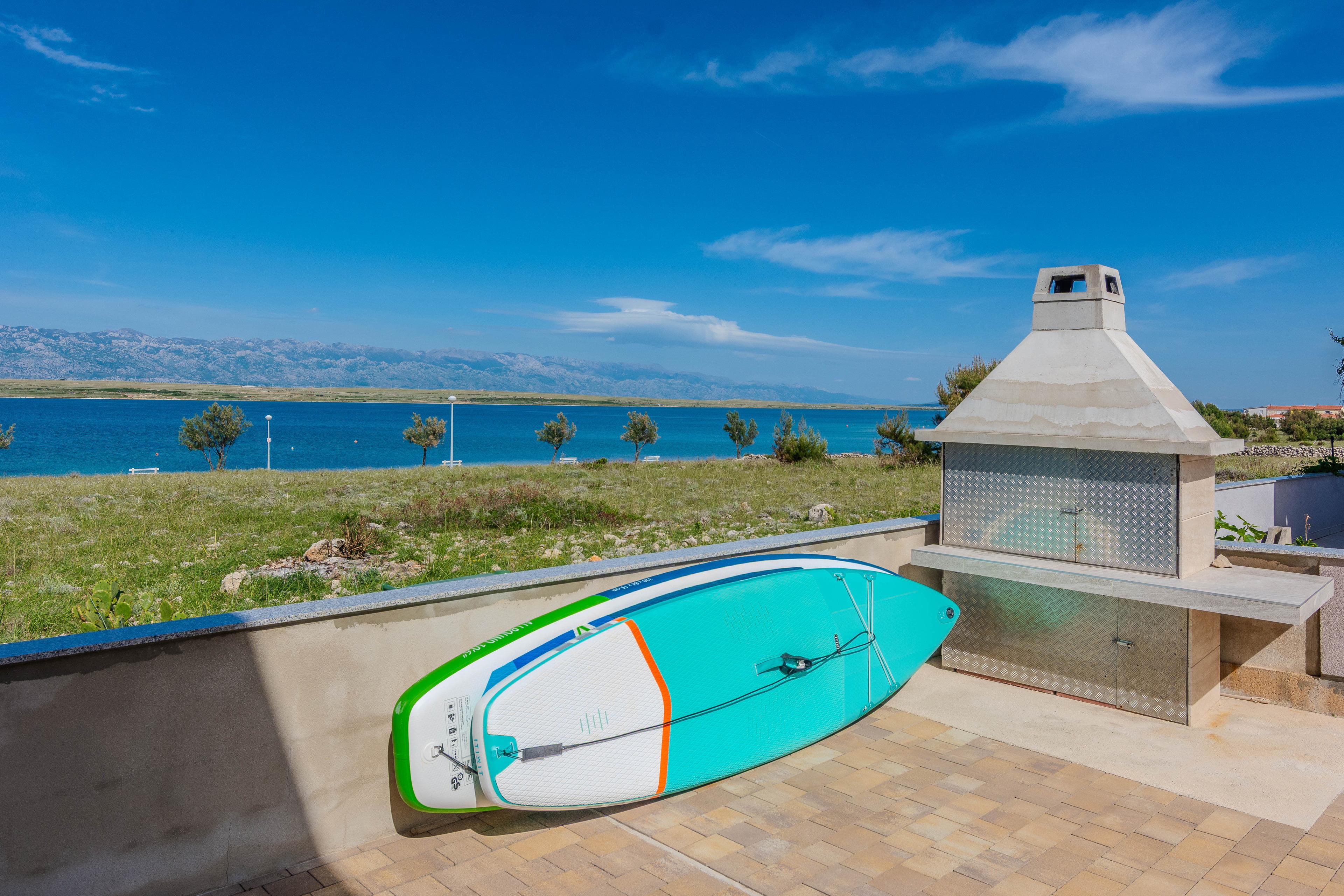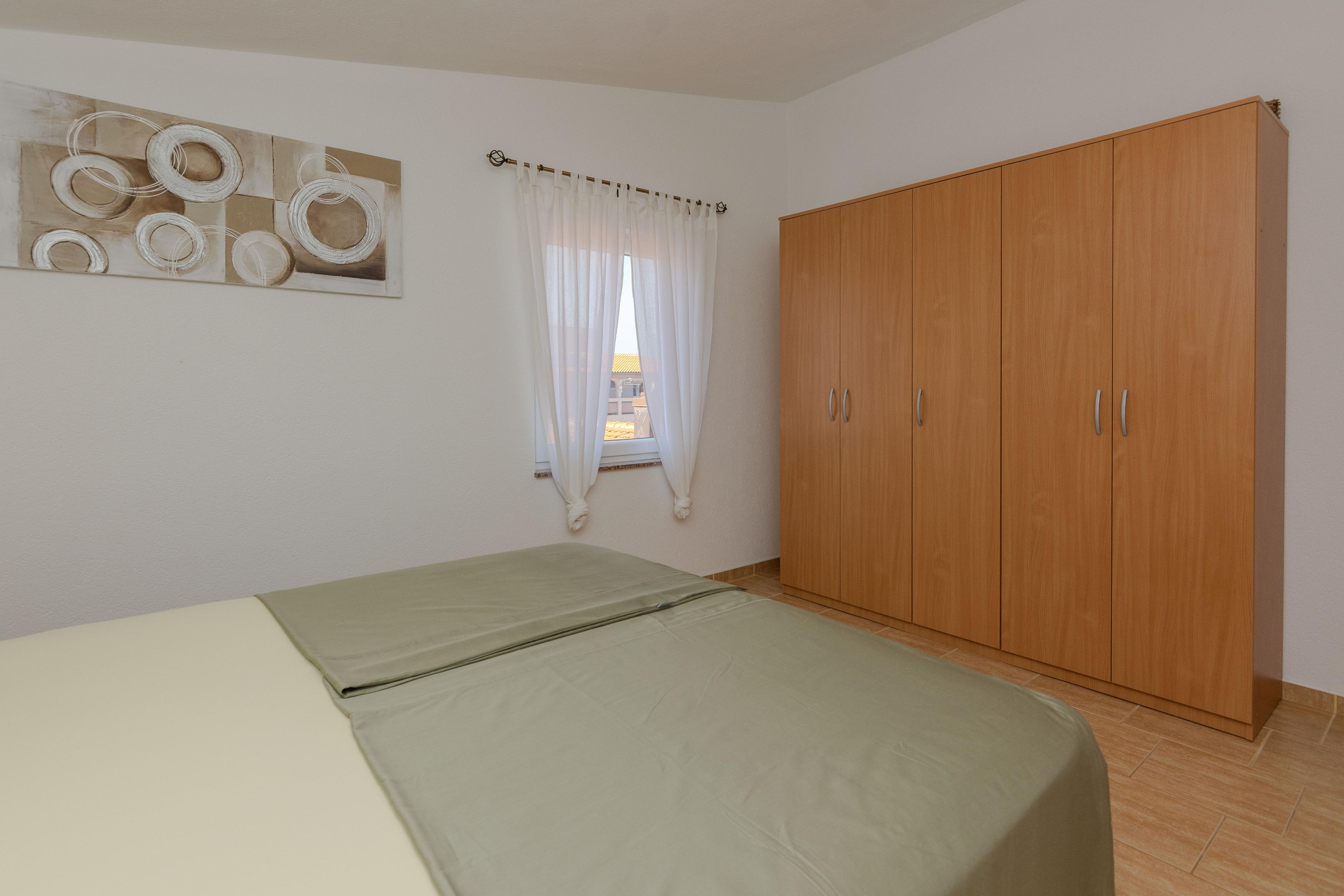Verfügt über einen herrlichen Blick auf das Meer, Insel Pag und Velebit Gebirge. Die 90m2 große Wohnung im ersten Stock des Hauses teilt sich auf eine Küche und Wohnbereich, zwei Schlafzimmern mit Doppelbetten und ein Badezimmer mit Dusche. Im Wohnzimmer befindet sich eine Schlafcouch für eine weitere Person. Zur Wohnung gehört ein 12m2 überdachter Balkon mit Tisch und Stühlen und der Meerblick. Klimaanlage, Internetzugang per WLAN, Sat-TV und Grill im Innenhof gehören zu den weiteren Annehmlichkeiten. Nur 70m entfernt erwartet Euch den schönen Kieselstrand wo Sie im Schwimmen, Tauchen oder Sonnenbaden genießen können.