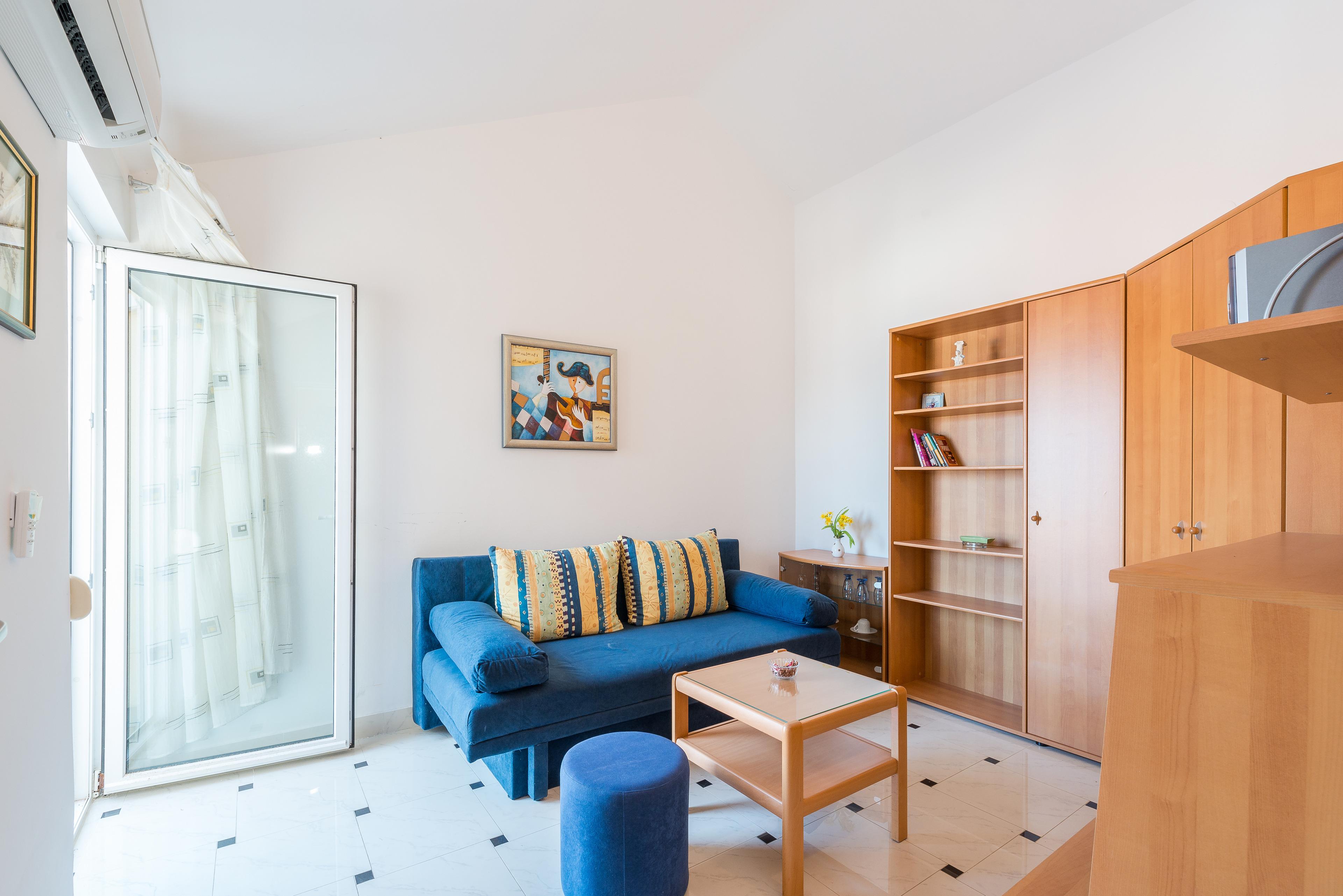 Die Wohnung ist aufgeteilt in ein Wohnzimmer mit einer Schlafcouch für zwei Personen, Küche und Essbereich und Badezimmer mit Dusche. Vom Wohnzimmer aus gelangt man auf eine möblierter 3 m² Balkon. Zu den weiteren Annehmlichkeiten gehören Klimaanlage, Sat-TV, WLAN. Kinderbett auf Anfrage. Eine gemeinsame Lounge befindet sich im Keller des Hauses die umfasst eine Bar, Sitzplätze, Darts, SAT TV, Radio, Klimaanlage und Kühlschrank mit Gefrierfach. Hinter dem Haus gibt es einen Parkplatz für Fahrräder. Im geräumigen Innenhof des Hauses (200 m²) befindet sich ein Pavillon mit Grill und Gartenmöbeln, ideal für Versammlungen in warmen Sommerabenden. Die Wohnung befindet sich in einer Entfernung von 70 m vom Meer und 150 m von Shops und Restaurants. Haustiere sind gegen einen Aufpreis von 15 EUR pro Tier und Nacht willkommen.