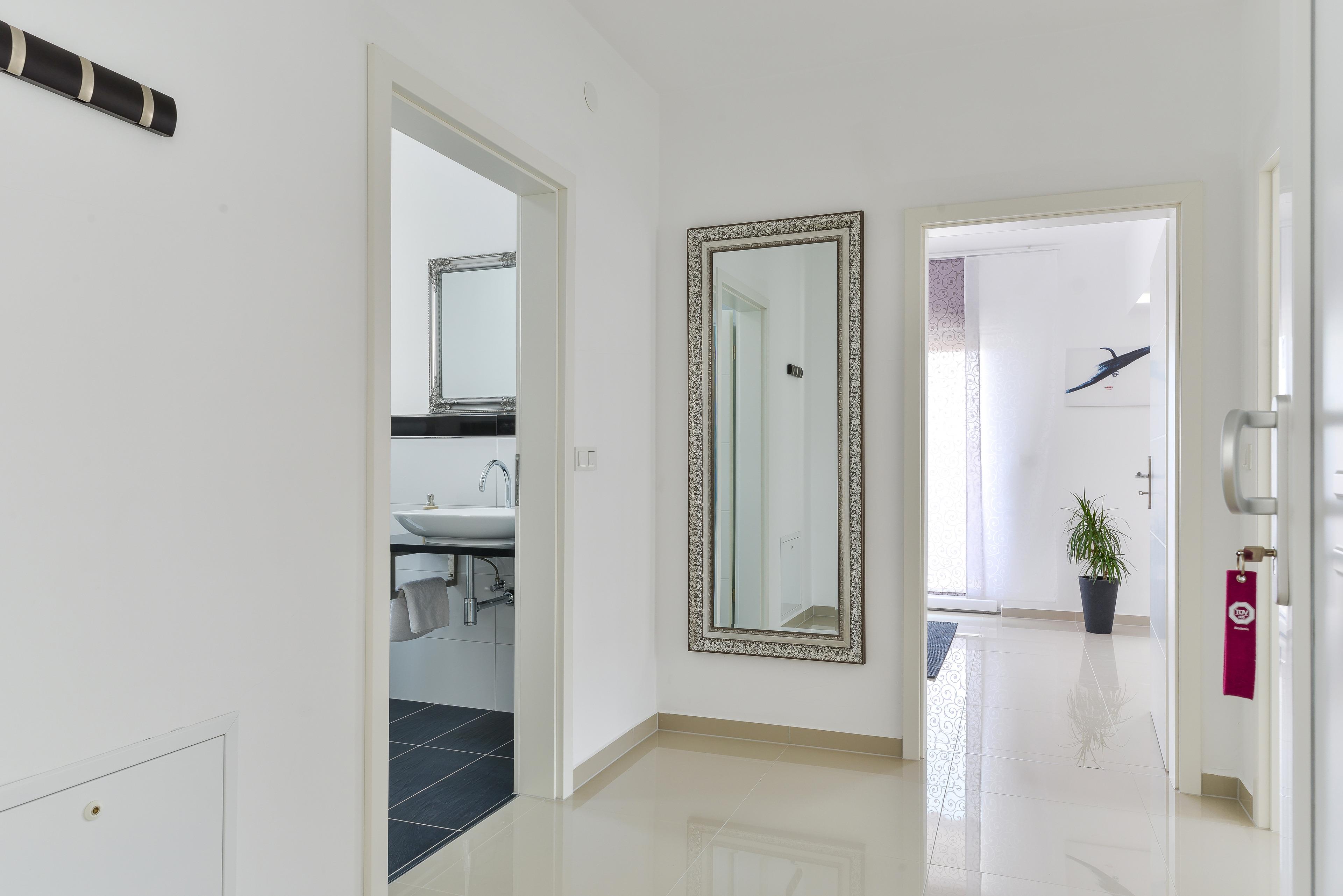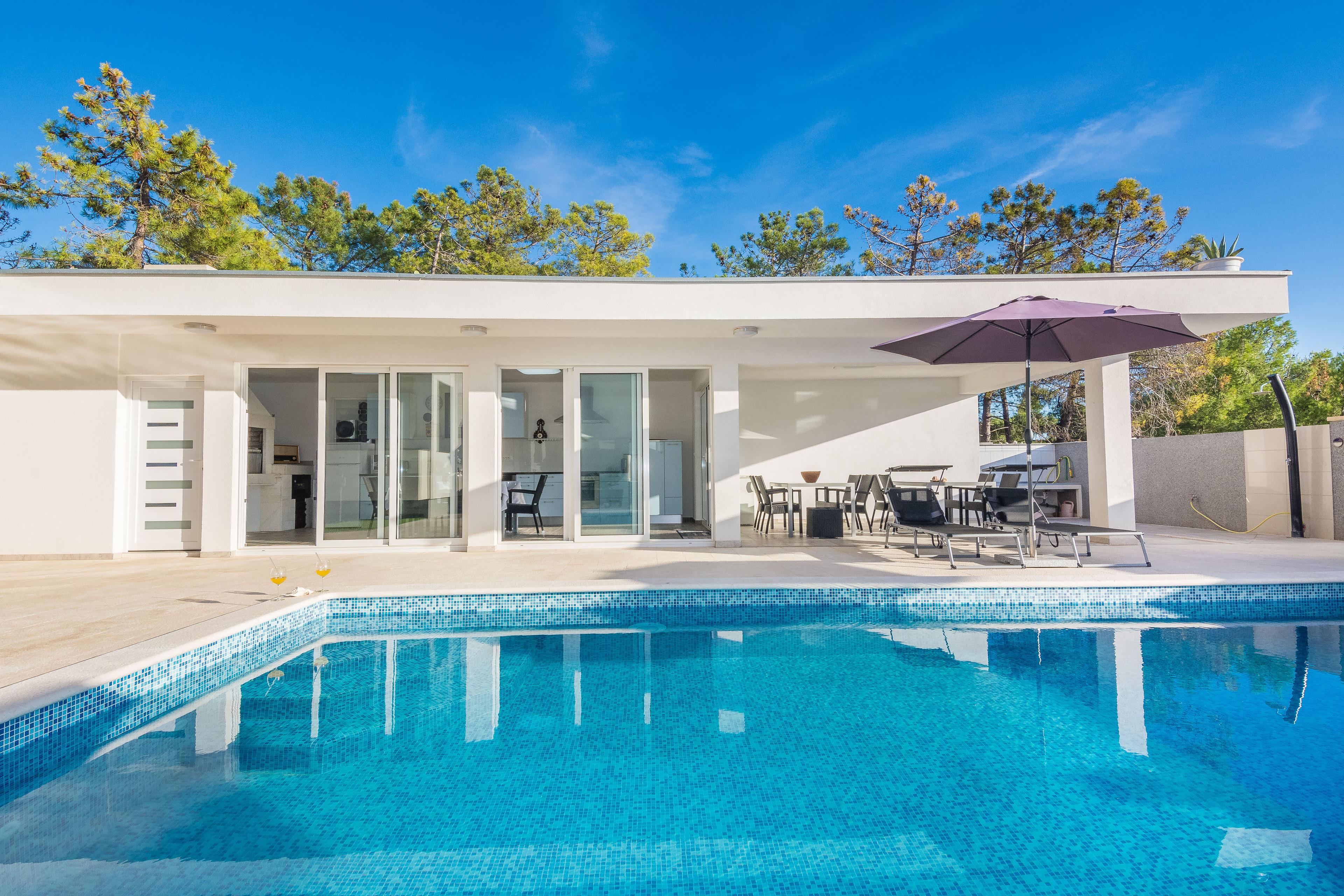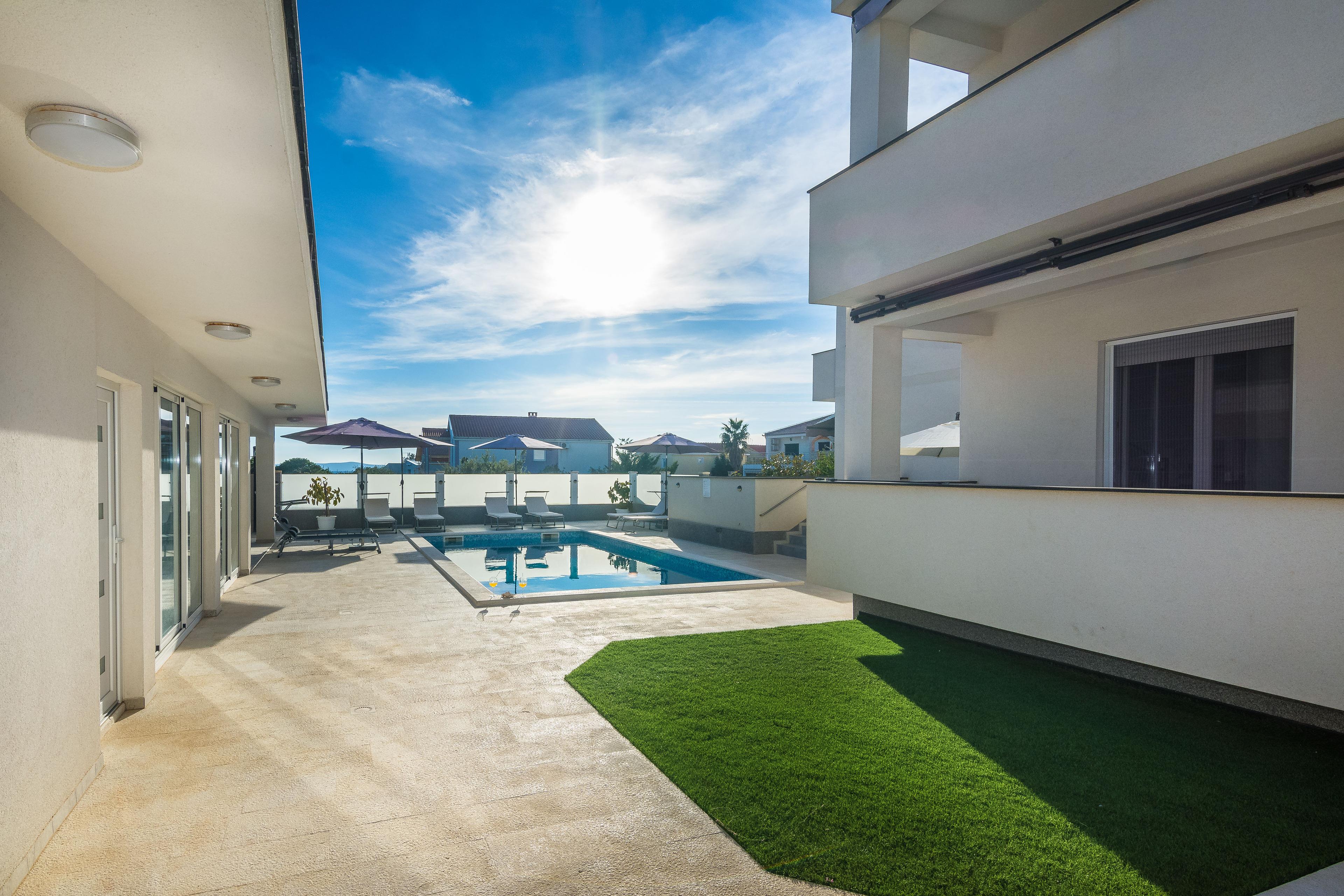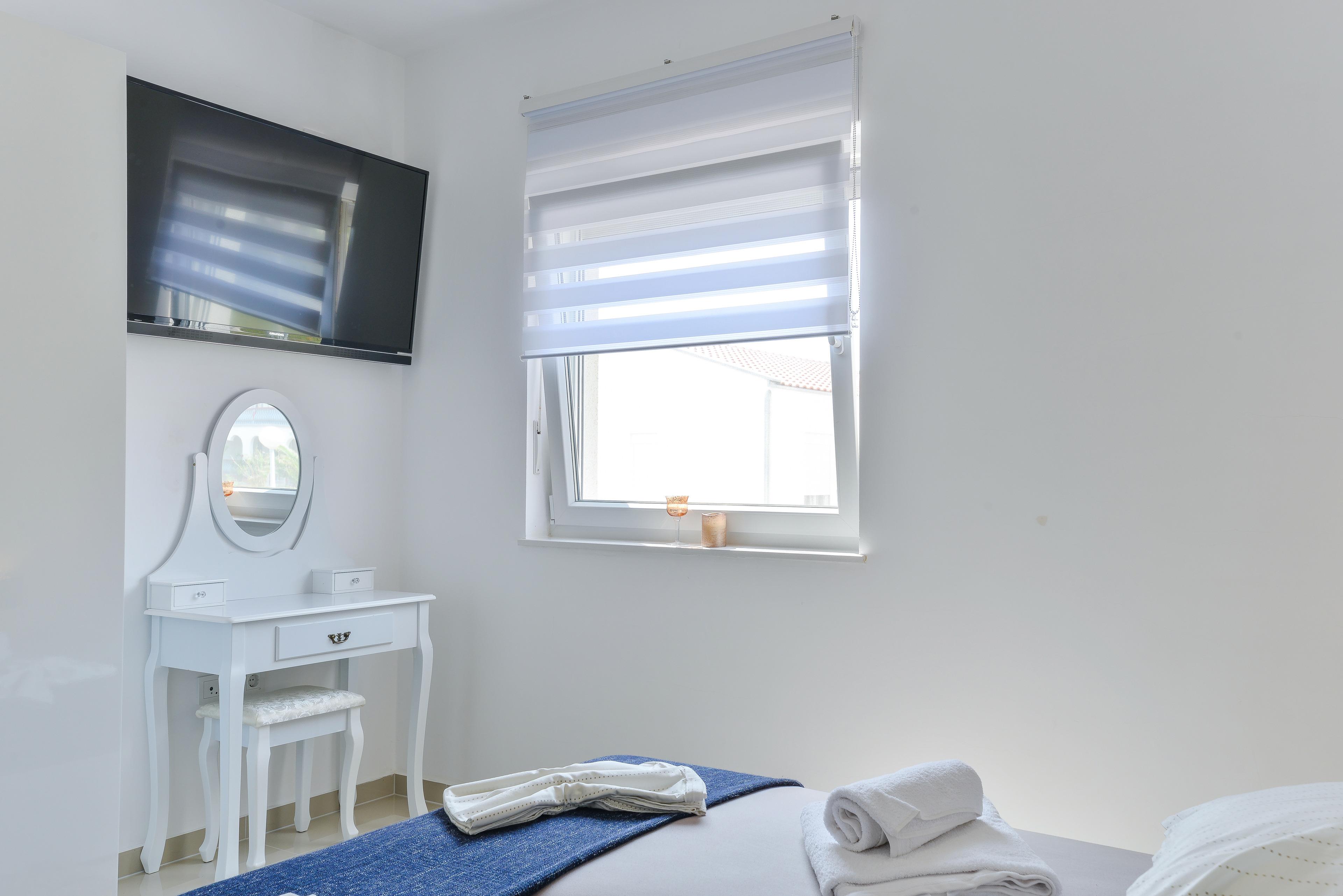 Die 60 m² Wohnung im ersten Stock des Hauses teilt sich auf einen Wohn- und Essbereich mit komplett ausgestatteter Küche, ein Doppelzimmer mit Doppelbett und ein Badezimmer mit Dusche. Im Wohnzimmer befindet sich ein Schlafsofa für zwei weitere Personen. Vom Wohnbereich aus erreichen Sie auf einen möblierten Balkon mit Meerblick und Blick aufs Pool (10 m²). Klimaanlage, WLAN im Appartement und auf dem Anwesen, Geschirrspüler, Espressomaschine und Parkplatz auf dem Grundstück sind nur einige der Annehmlichkeiten dieser Wohnung und im Preis inbegriffen. Kinderbett und Kinderhochstuhl auf Anfrage und ohne Aufpreis. Im geschlossenen Innenhof des Hauses (500 m²) befindet sich ein 32m² Pool (8 m lang, 4 m breit, 1,5 m tief) mit Liegestühlen, Sonnenschirmen, Außendusche und Toilette sowie ein geräumiger überdachter Pavillon mit Grill und Sitzgarnitur. Restaurants und Shops erreichen Sie in wenigen Gehminuten. Das Zentrum der Insel Vir ist 2000 m entfernt.
