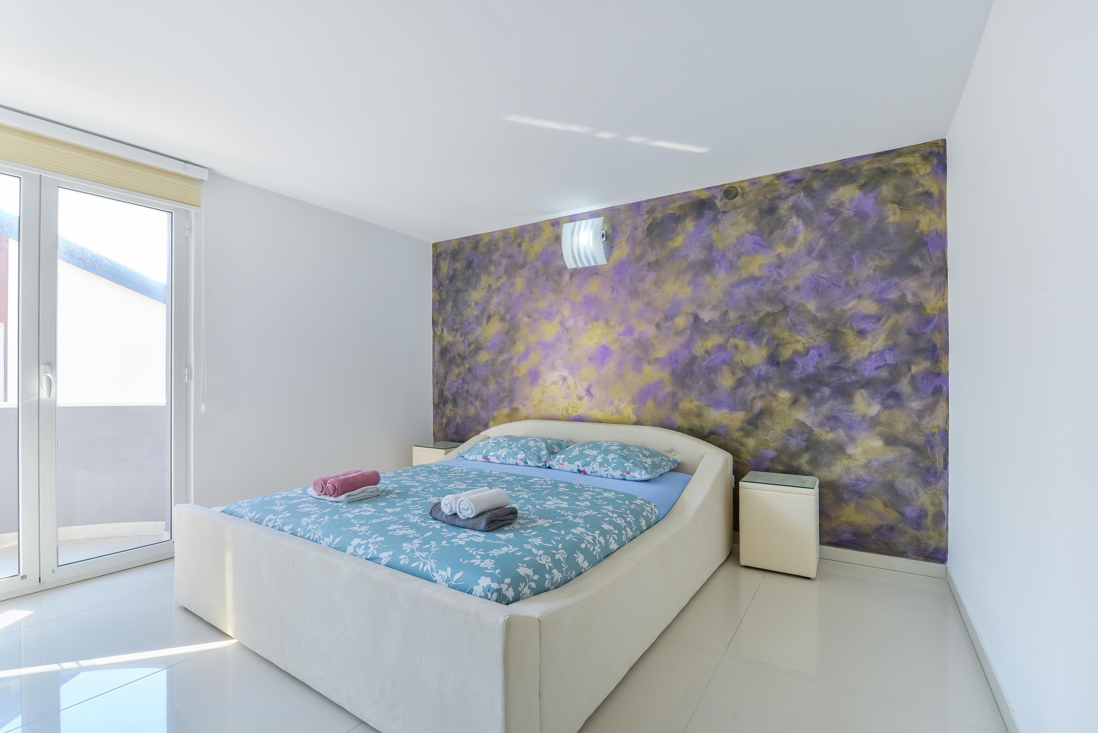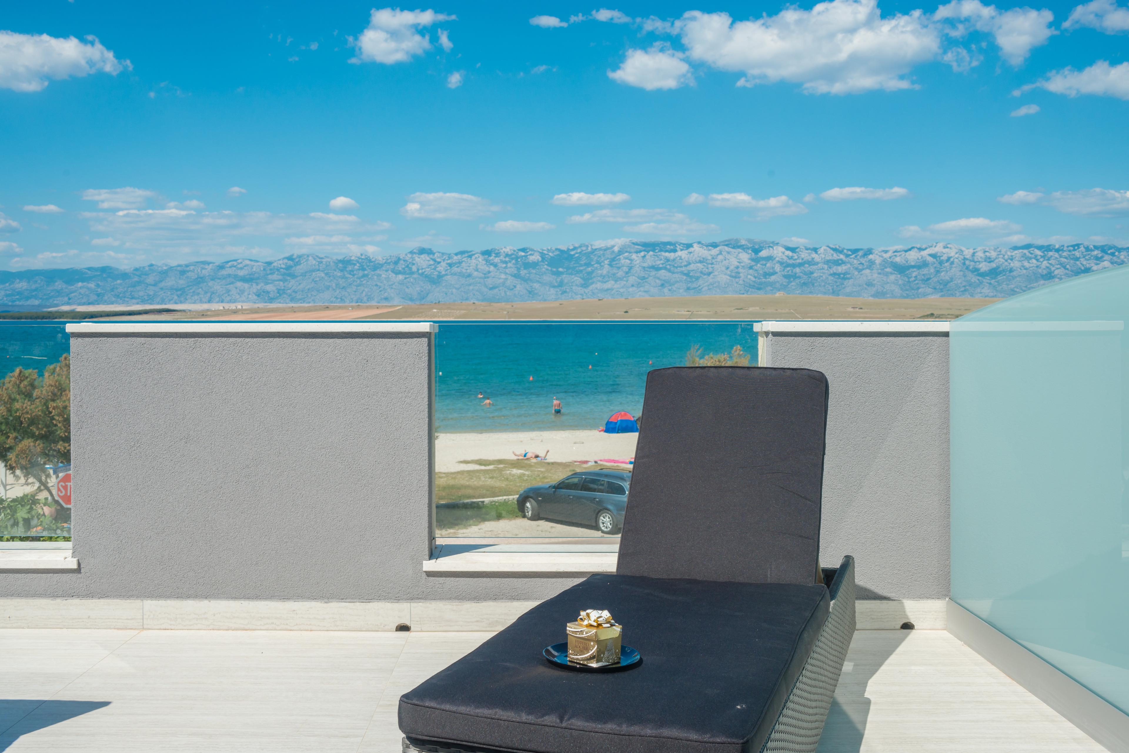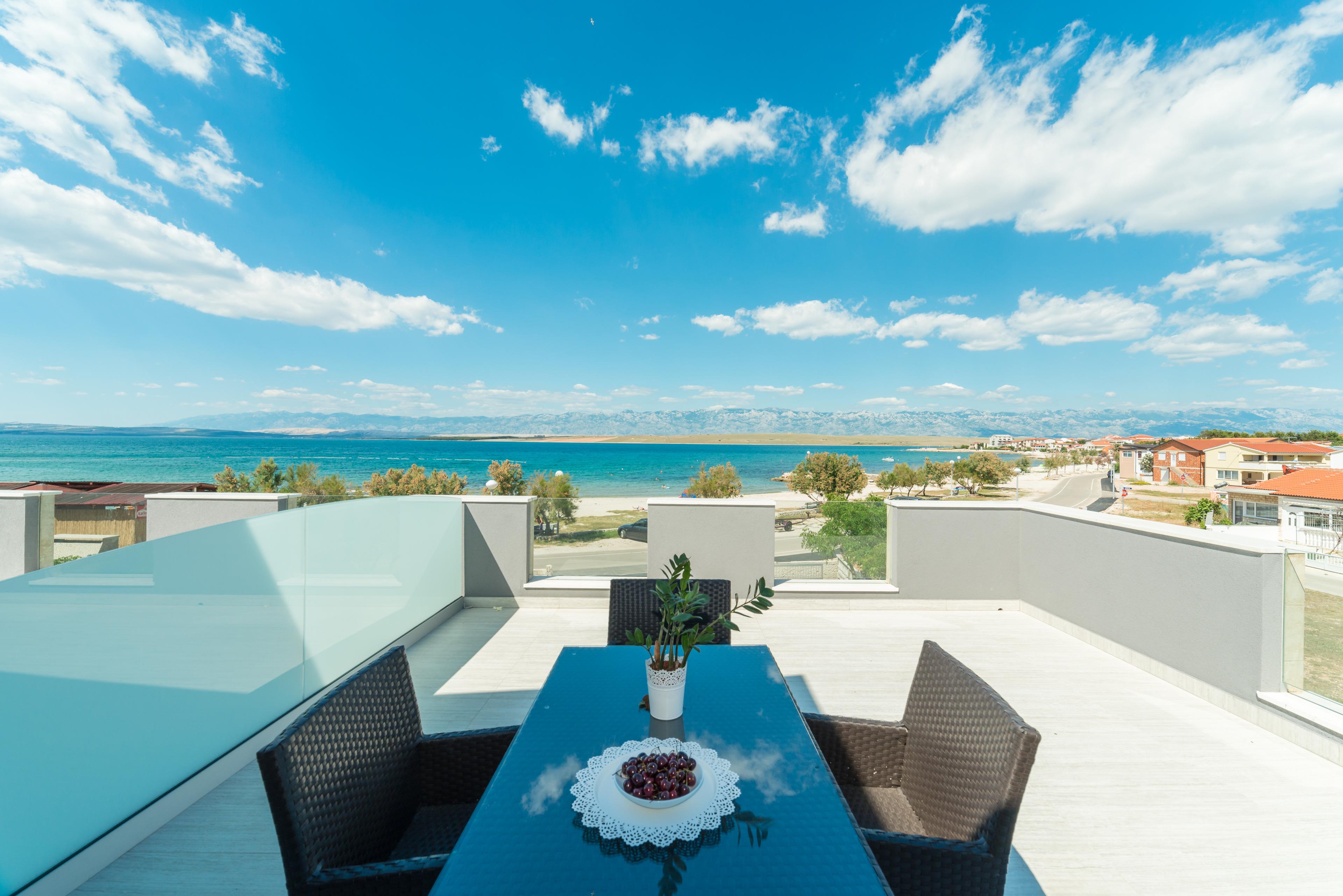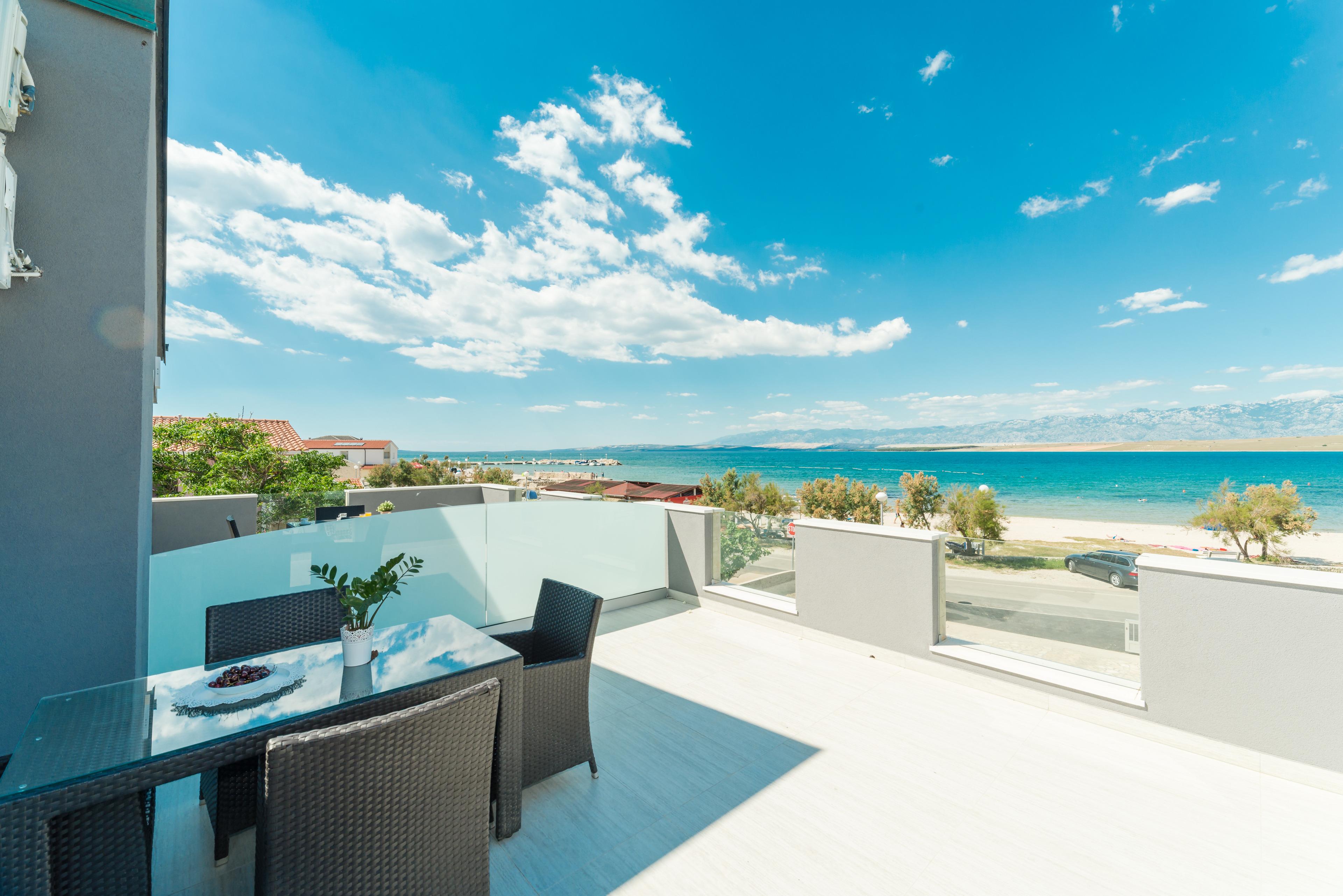 Luxuriöse und modern eingerichtete 70m2 Wohnung im ersten Stock des Hauses teilt sich auf einem Wohnzimmer, Esszimmer, voll ausgestattete Küche, zwei Schlafzimmern mit Doppelbett und ein Badezimmer mit Dusche und Toilette. Im Wohnzimmer befindet sich ein Schlafsofa für zwei weitere Personen. Vom Wohnzimmer aus erreichen Sie eine geräumige 40m2 Balkon mit atemberaubenden Meerblick, ausgestattet mit Tisch, Stühlen und Liegen, wo Sie mit dem Meerblick und frischen Seeluft genießen können. Klimaanlage, Sat-TV, Internetzugang und Parkplätze sind ebenfalls vorhanden und ohne Aufpreis. Der nächste Badestrand ist nur 20 Meter vom Haus entfernt!