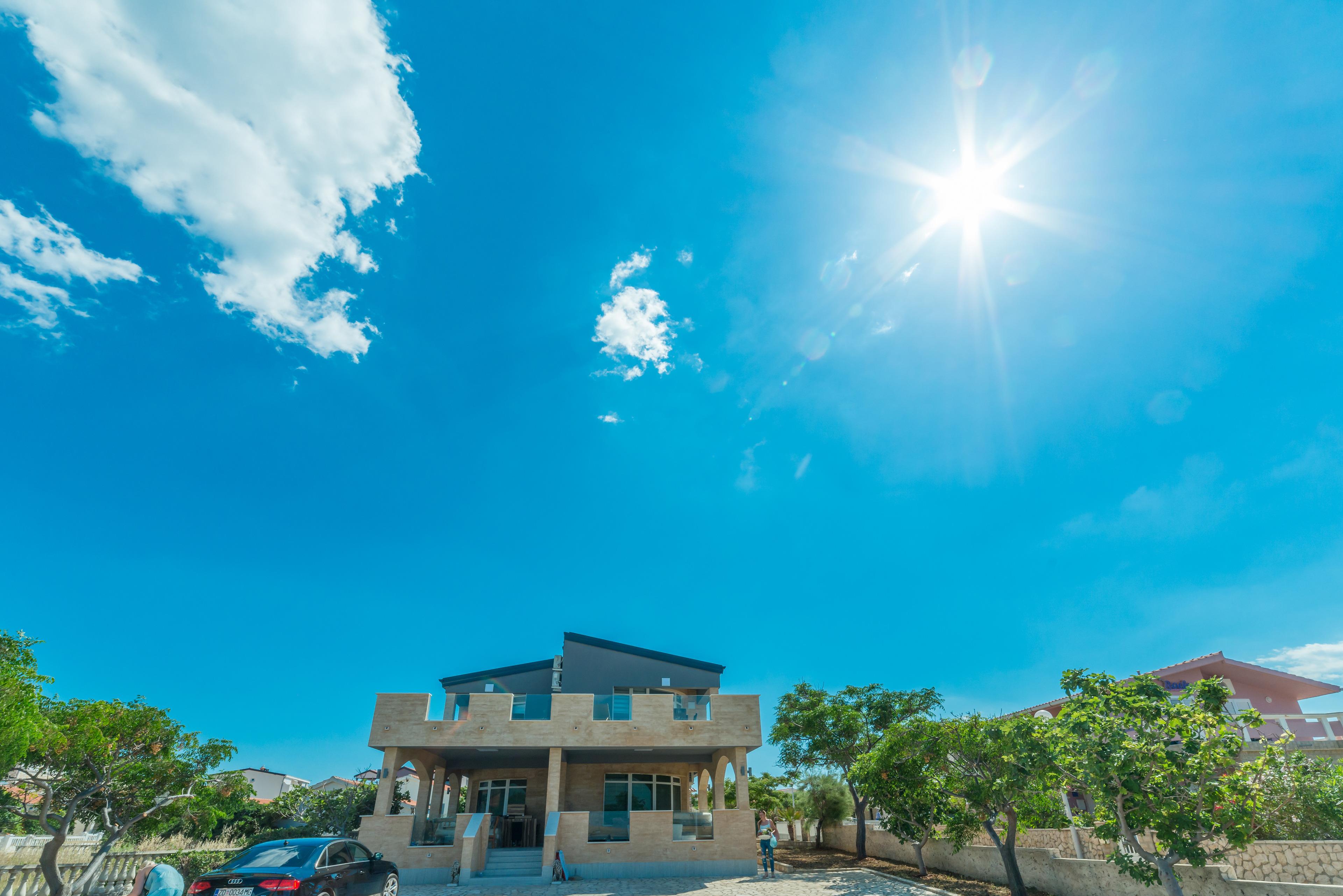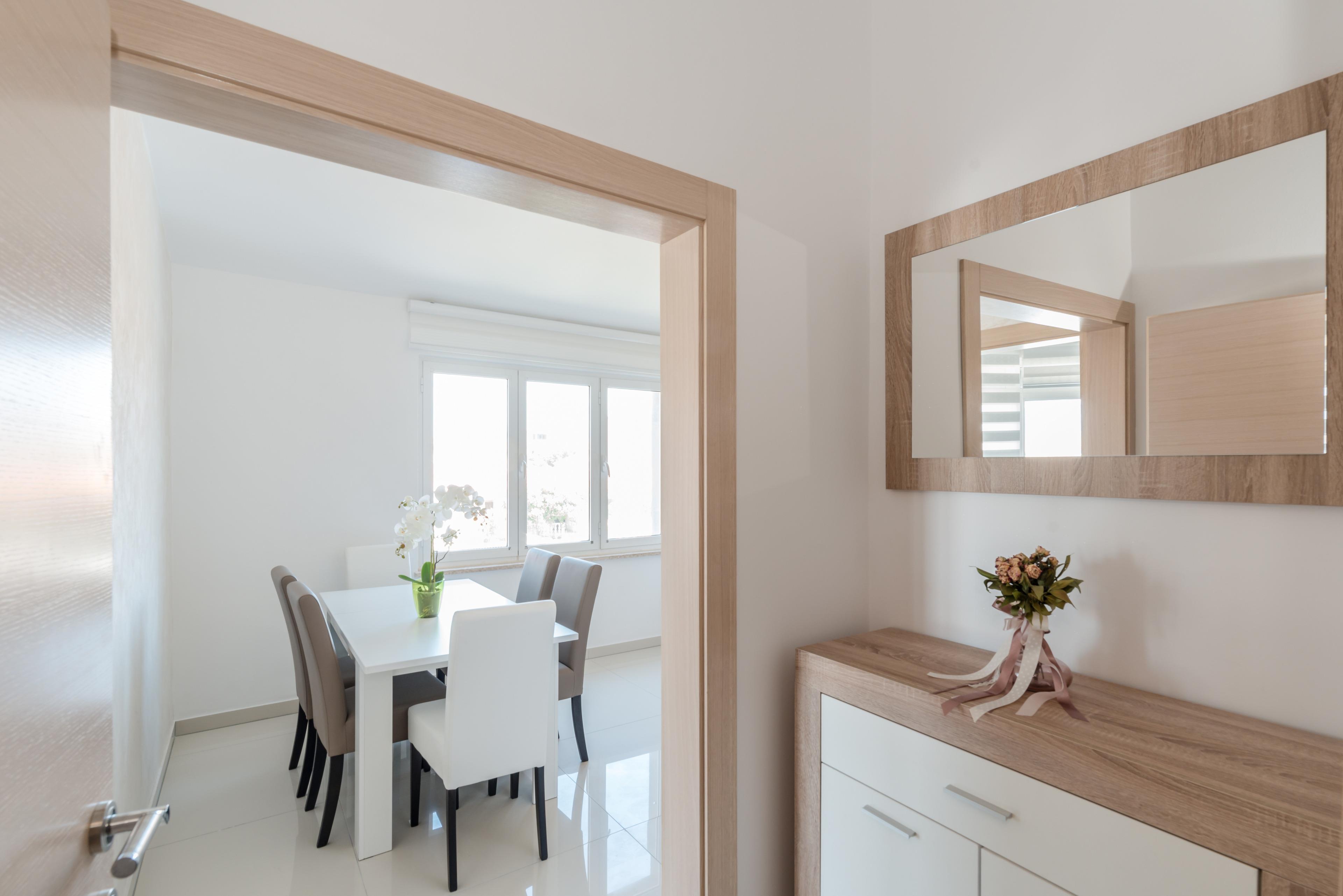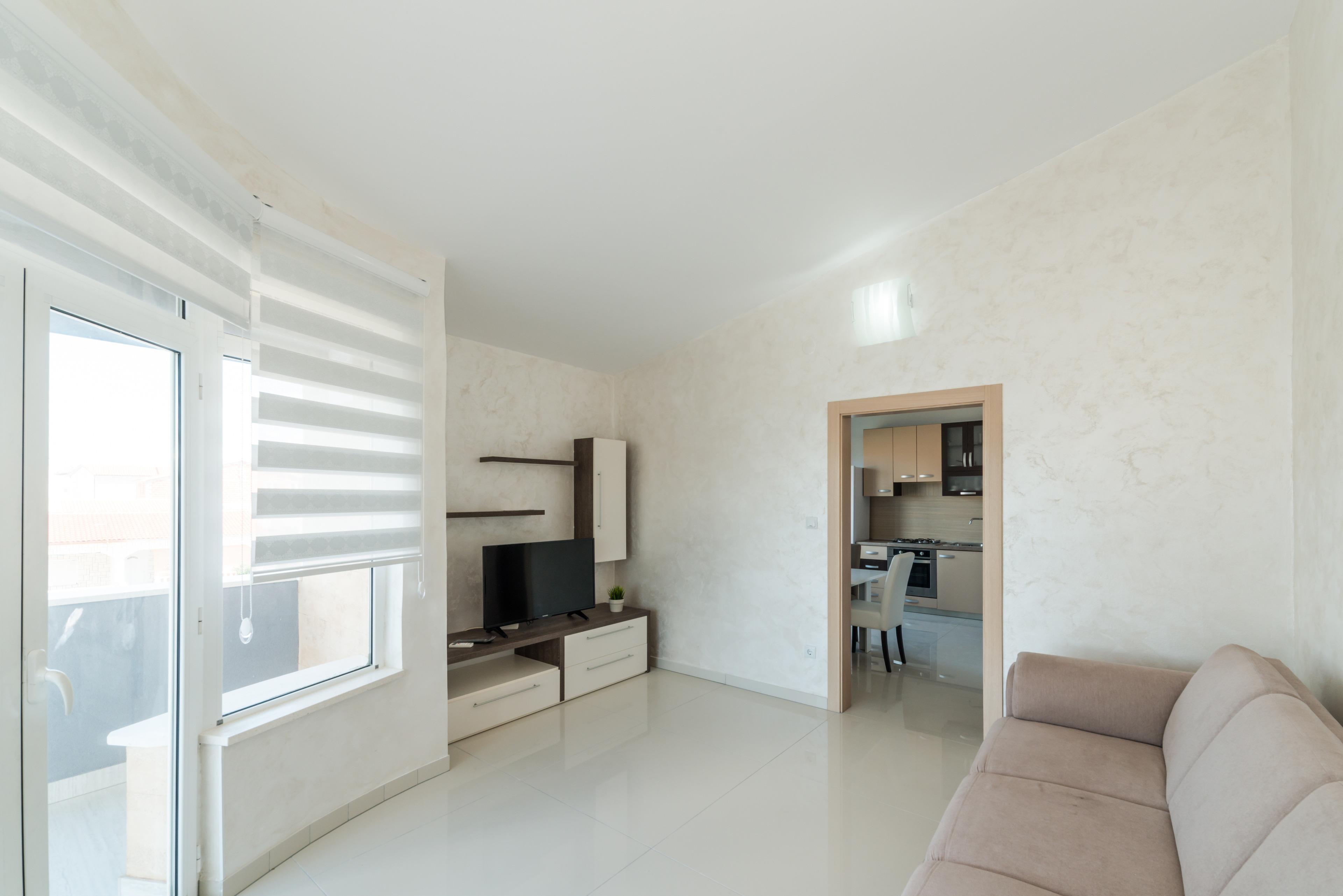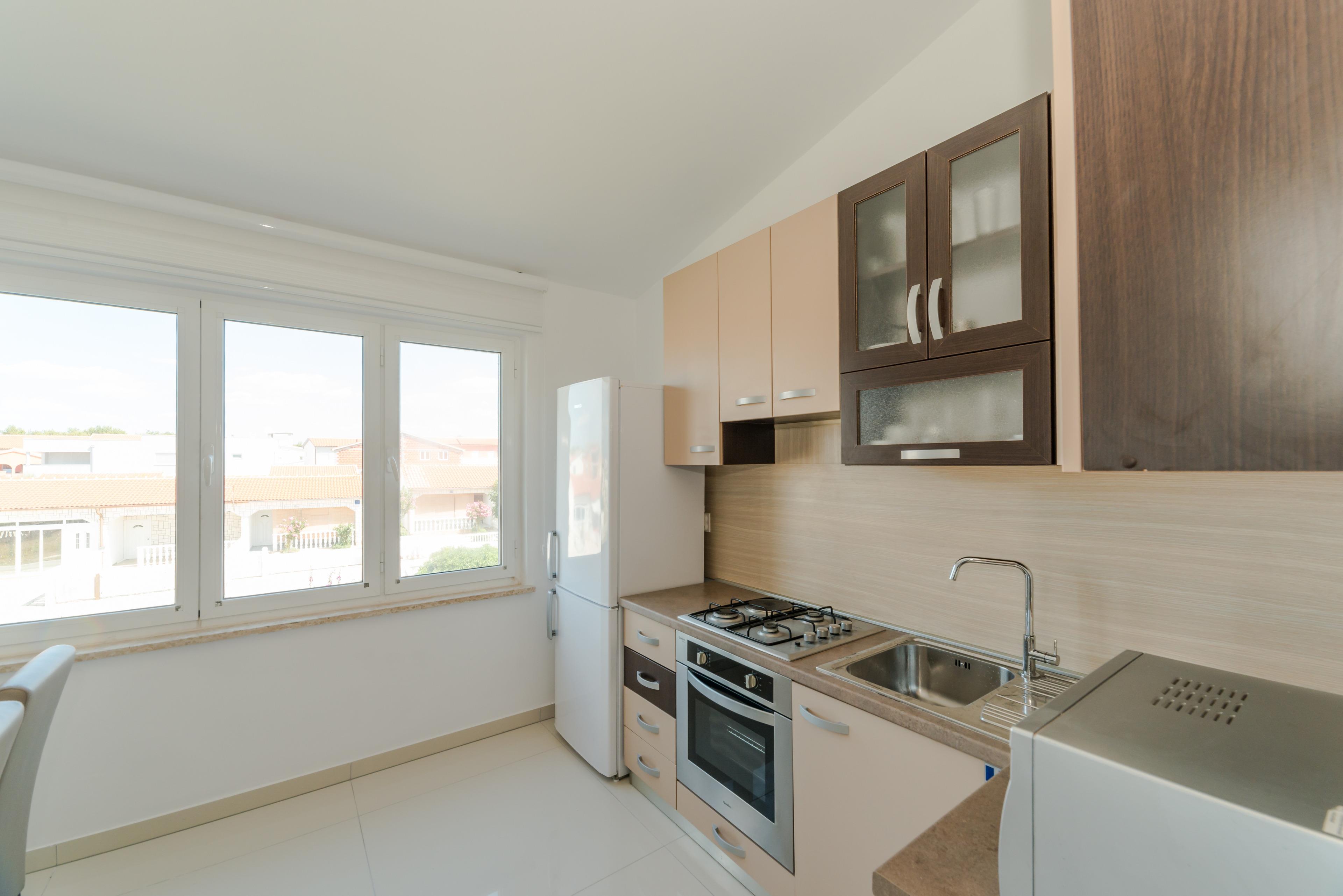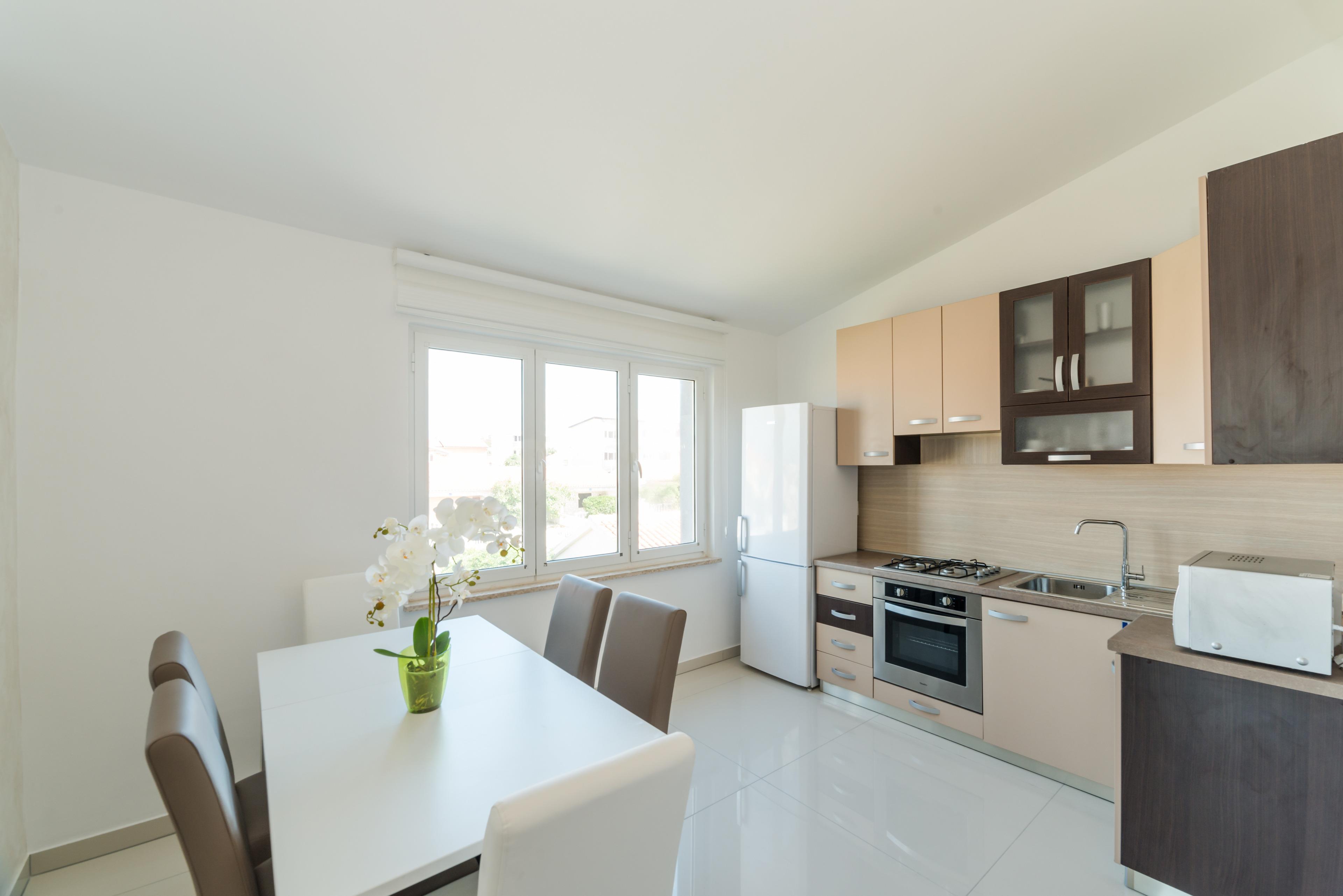 Luxuriöse und modern eingerichtete 70m2 Wohnung im ersten Stock des Hauses teilt sich auf einem Wohnzimmer, Esszimmer, voll ausgestattete Küche, zwei Schlafzimmern mit Doppelbett und ein Badezimmer mit Dusche und Toilette. Im Wohnzimmer befindet sich ein Schlafsofa für zwei weitere Personen. Vom Wohnzimmer aus erreichen Sie eine geräumige 40m2 Balkon mit atemberaubenden Meerblick, ausgestattet mit Tisch, Stühlen und Liegen, wo Sie mit dem Meerblick und frischen Seeluft genießen können. Klimaanlage, Sat-TV, Internetzugang und Parkplätze sind ebenfalls vorhanden und ohne Aufpreis. Der nächste Badestrand ist nur 20 Meter vom Haus entfernt!