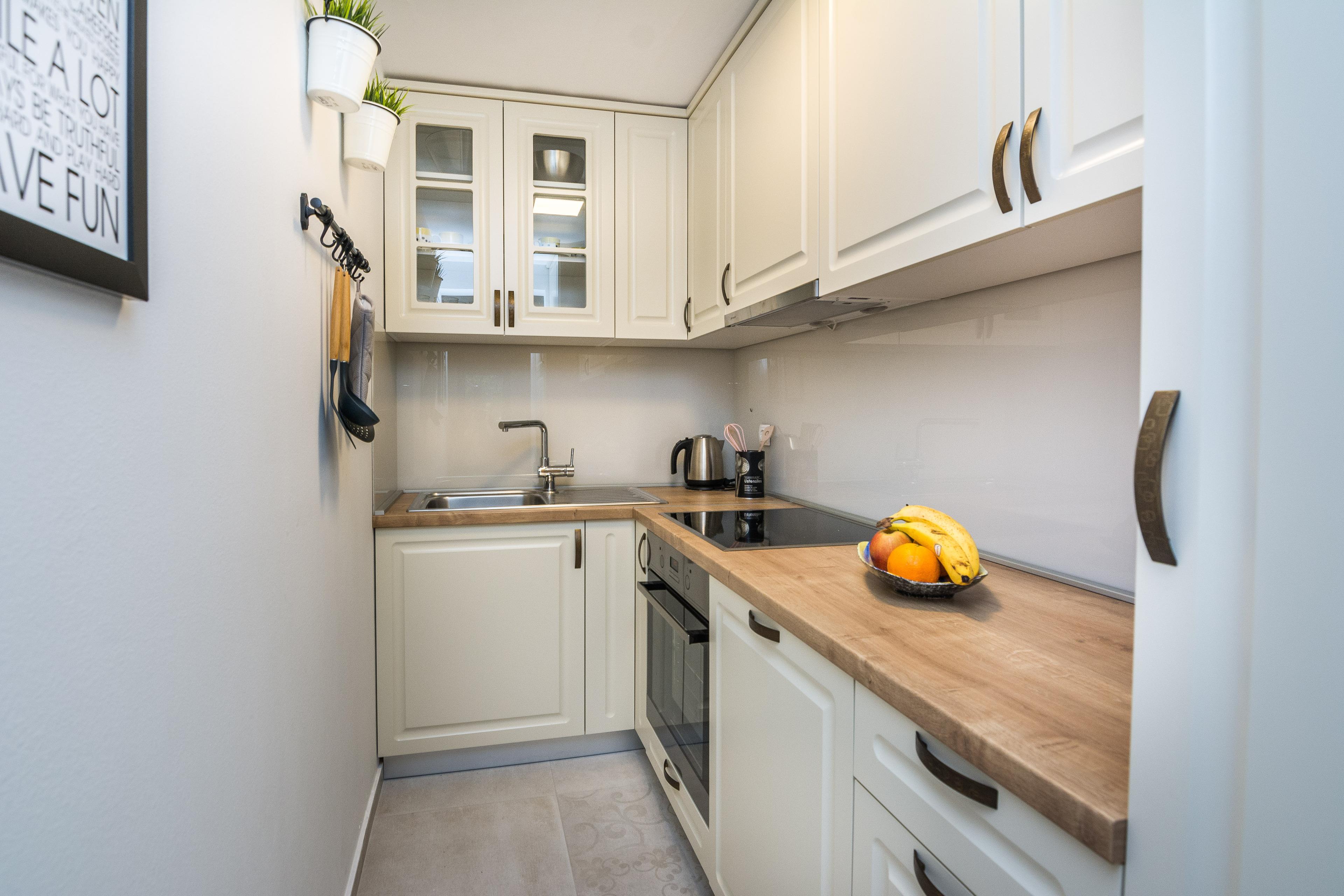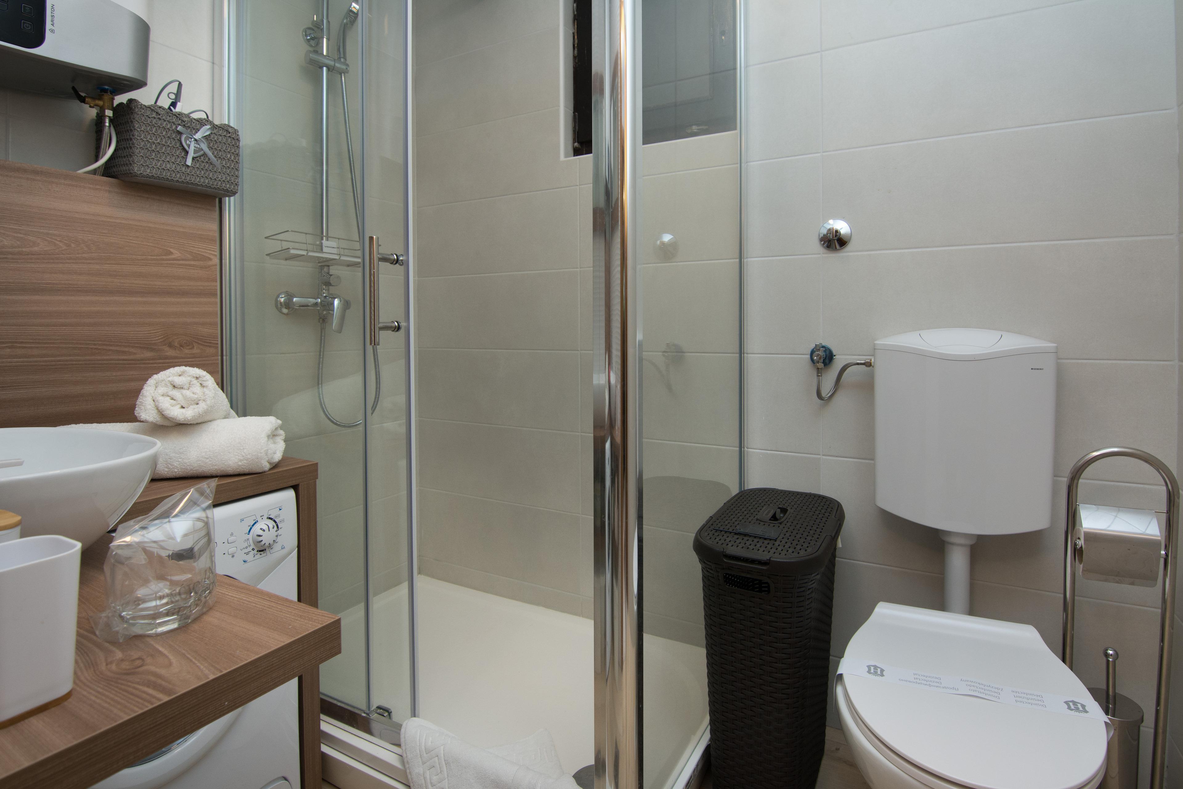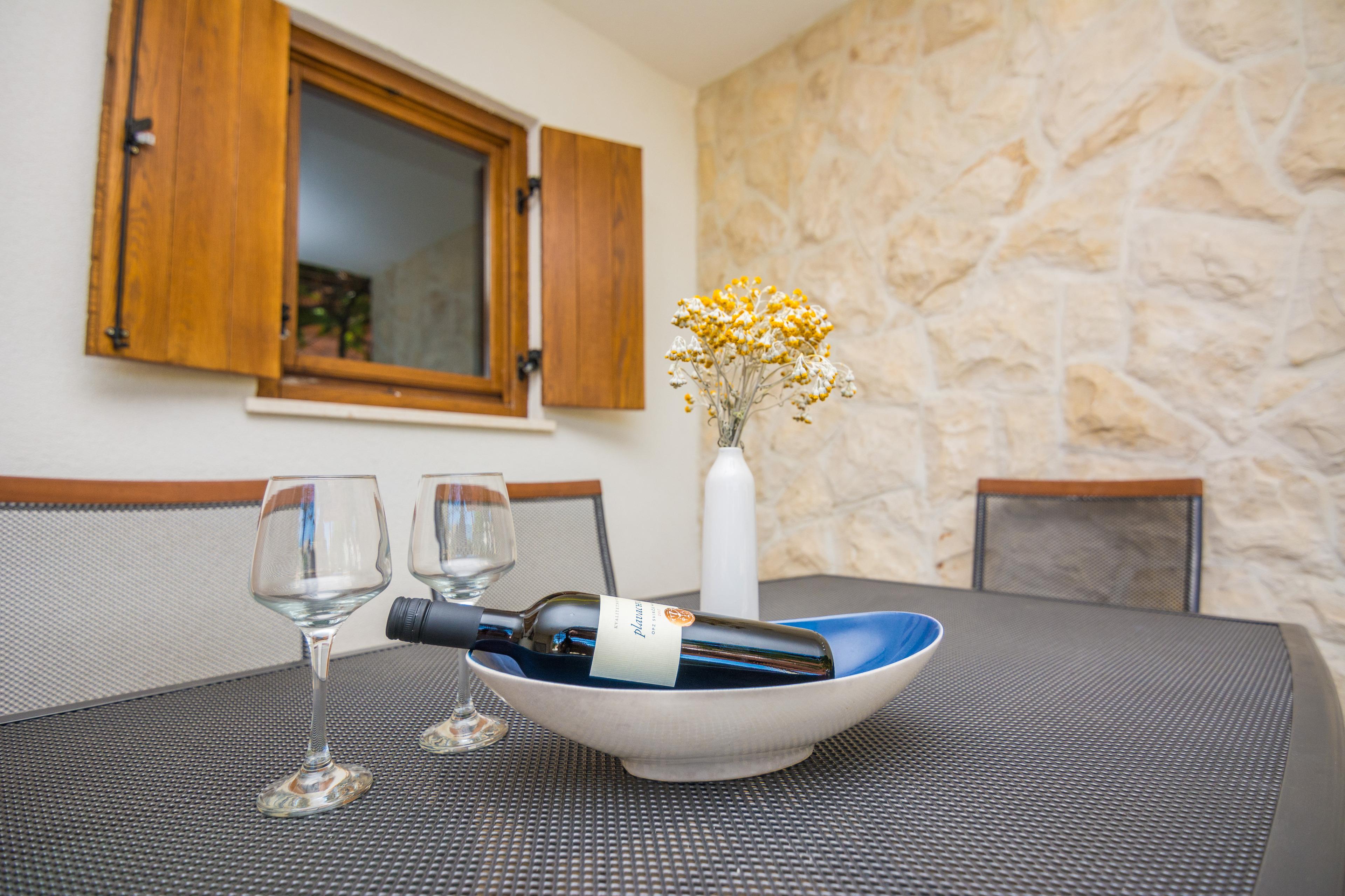 Die 45 m2 FeWo verfügt über ein Wohnzimmer mit Küche und Essbereich, Schlafzimmer mit Doppelbett und Bad mit Dusche. Im Wohnzimmer befindet sich ein Schlafsofa für zwei weitere Personen. Vom Wohnzimmer aus gelangen Sie auf eine möblierte und überdachte Terrasse 15 m2 mit Tisch, Stühlen und Liegestühlen. Weitere Merkmale dieses Apartments sind Klimaanlage, WLAN, Sat-TV, Grill im Innenhof, Parkplatz auf dem Grundstück, Waschmaschine, Geschirrspüler. Kinderbett und Kinderstuhl sind auf Anfrage und ohne Aufpreis erhältlich. Restaurants und Geschäfte erreichen Sie in einen kurzen Spaziergang. In einer Entfernung von 200 m von den Apartments befindet sich einen Kiesstrand und Bucht Brdonja.