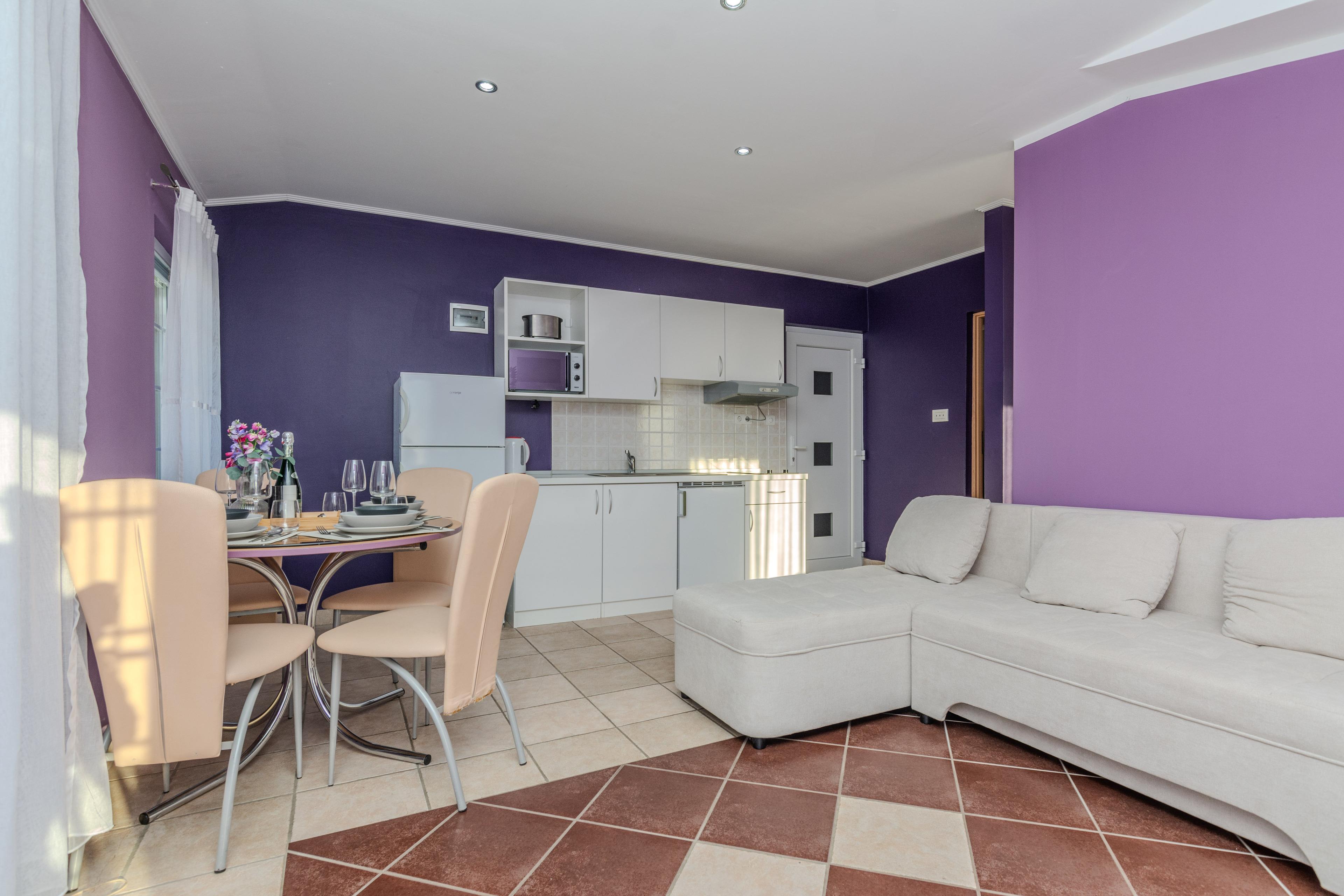 Die 45m2 Wohnung im ersten Stock des Hauses teilt sich auf eine Küche und Ess- Wohnbereich, ein Schlafzimmer mit Doppelbett und ein Badezimmer mit Dusche. Im Wohnzimmer befindet sich ein Schlafsofa für zwei weitere Personen. Zum Apartment gehört eine 8m2 Terrasse mit teilweise Meerblick, Tisch und Stühlen. Klimaanlage, Internetzugang per WLAN, Sat-TV und Grill im Innenhof gehören zu den weiteren Annehmlichkeiten. Nur 200 m entfernt erwartet Euch der schönen Kieselstrand Biskupljaca wo Sie im Schwimmen, Tauchen oder Sonnenbaden genießen können.