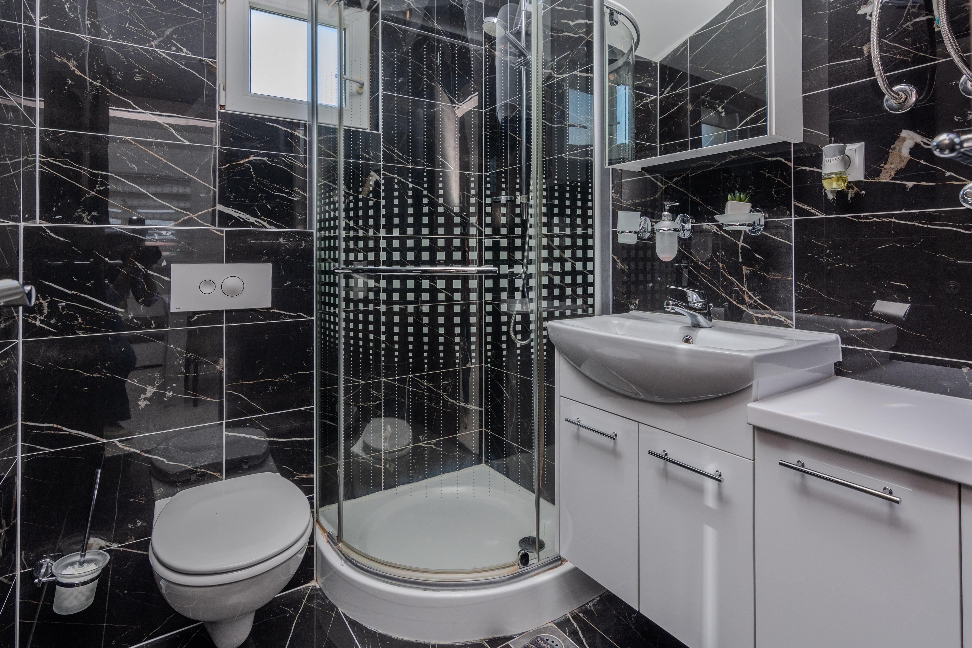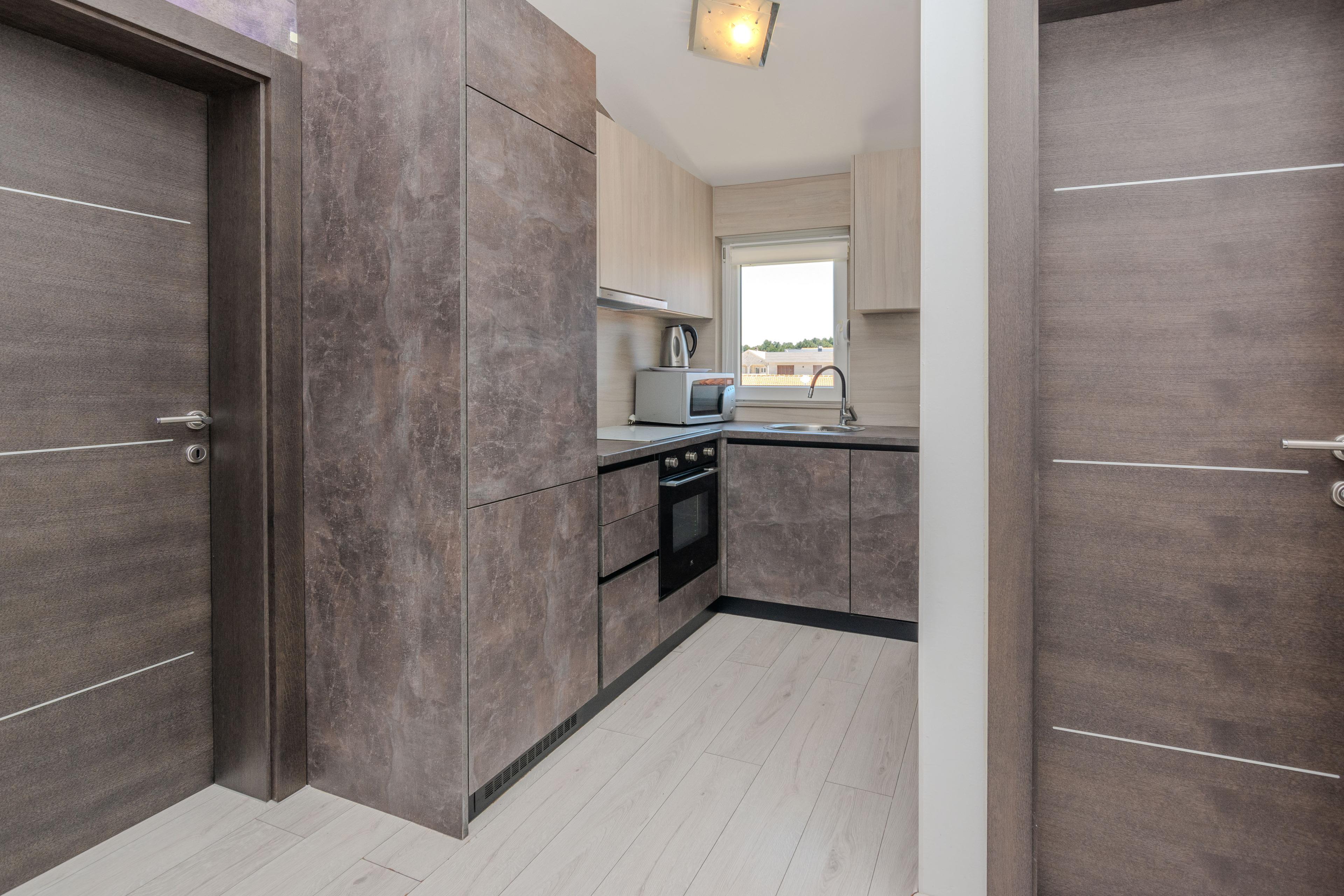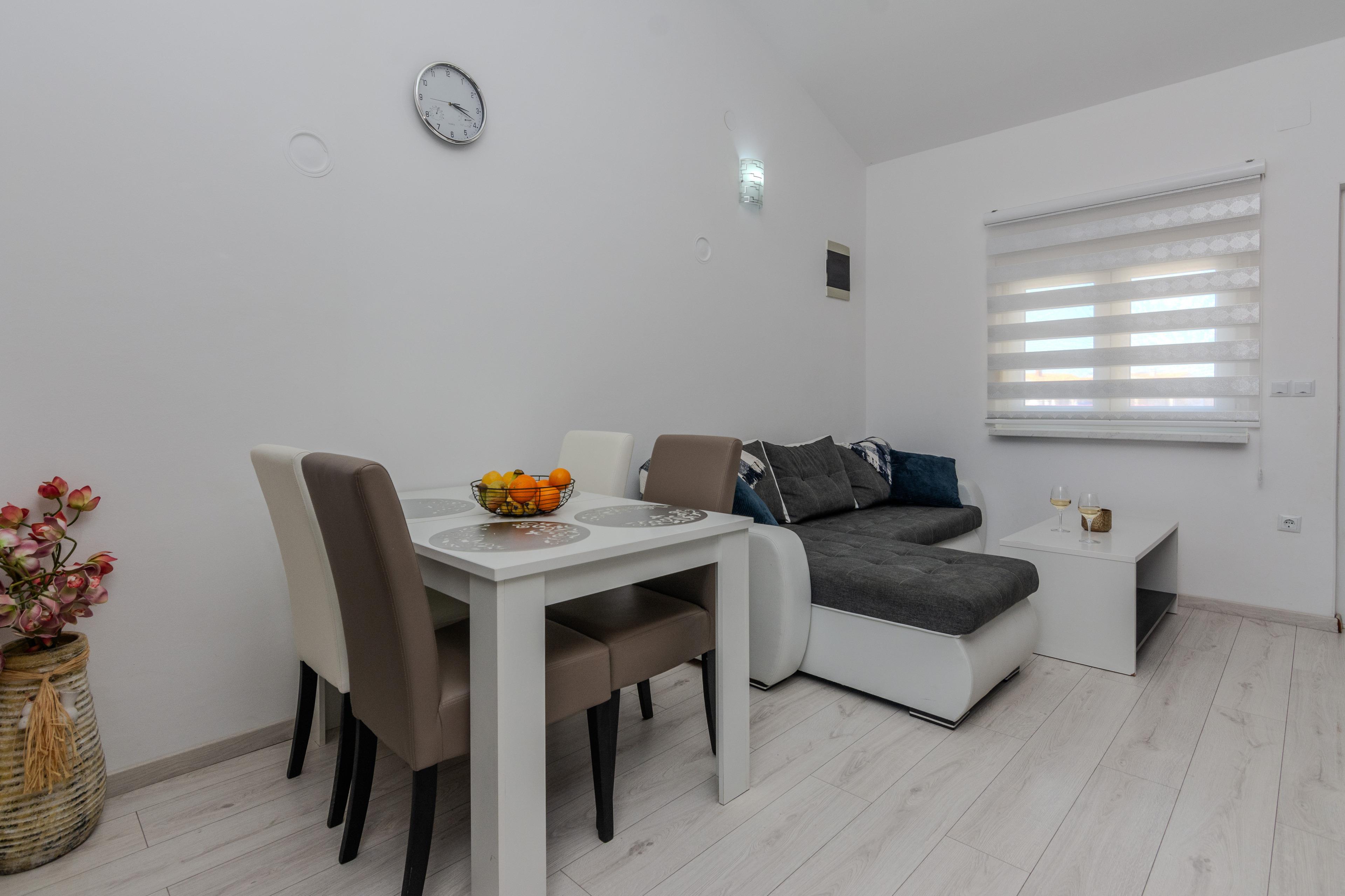 Luxuriöse und modern eingerichtete 52m2 Wohnung im 1. Stock des Hauses teilt sich auf einem Wohnzimmer, Esszimmer, gut ausgestattete Küche, zwei Schlafzimmern mit Doppelbett und ein Badezimmer mit Dusche und Toilette. Im Wohnzimmer befindet sich ein Schlafsofa für zwei weitere Personen. Vom Wohnzimmer aus erreichen Sie einen 13m2 Balkon, ausgestattet mit Tisch und Stühlen, ideal für gemeinsames Frühstück oder Abendessen. Klimaanlage, Sat-TV, Internetzugang und Parkplätze sind ebenfalls vorhanden und ohne Aufpreis. Der nächste Strand ist nur 30 Meter vom Haus entfernt, wo Sie Sonnenbaden, Schwimmen oder Tauchen in den erfrischenden Meer können.