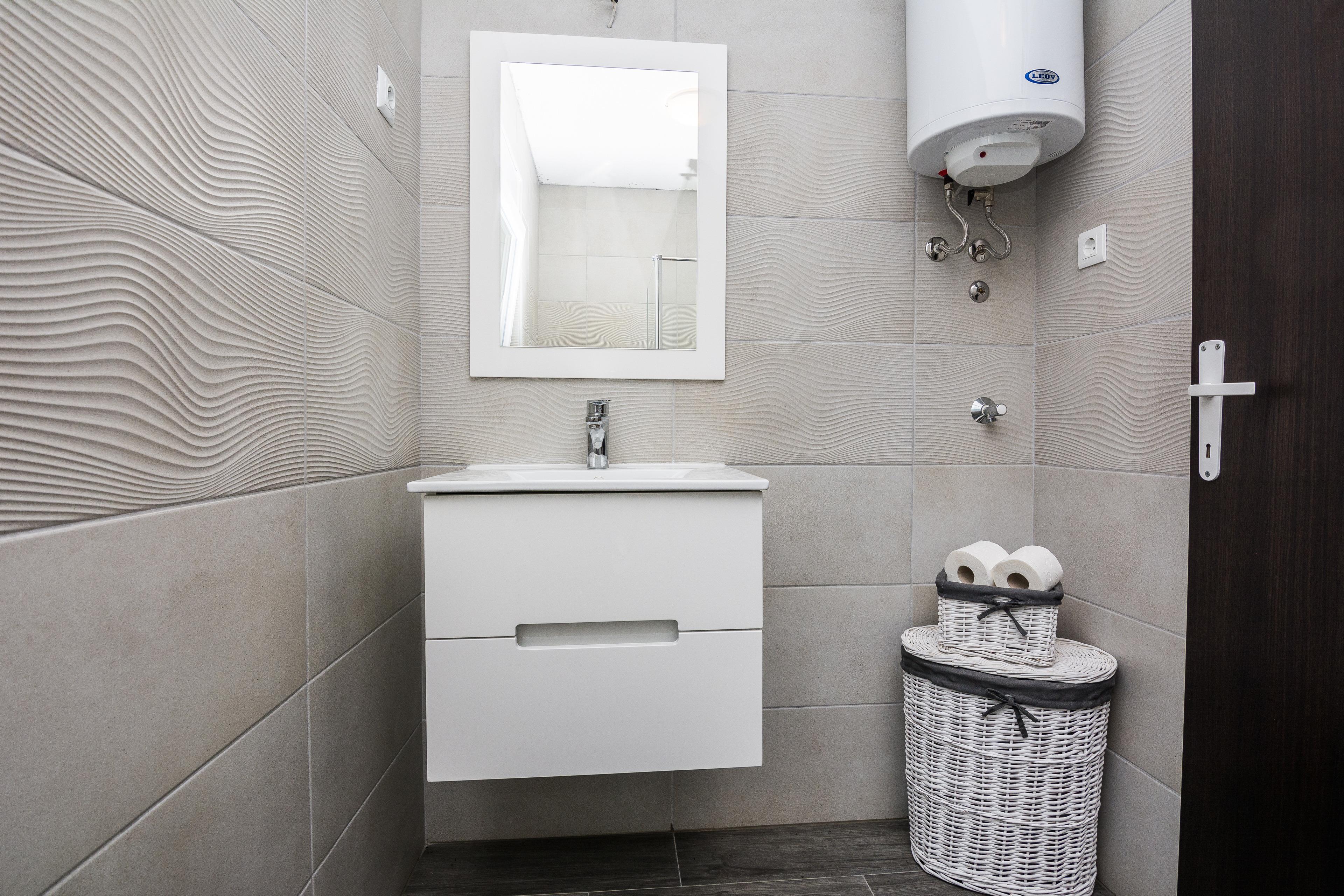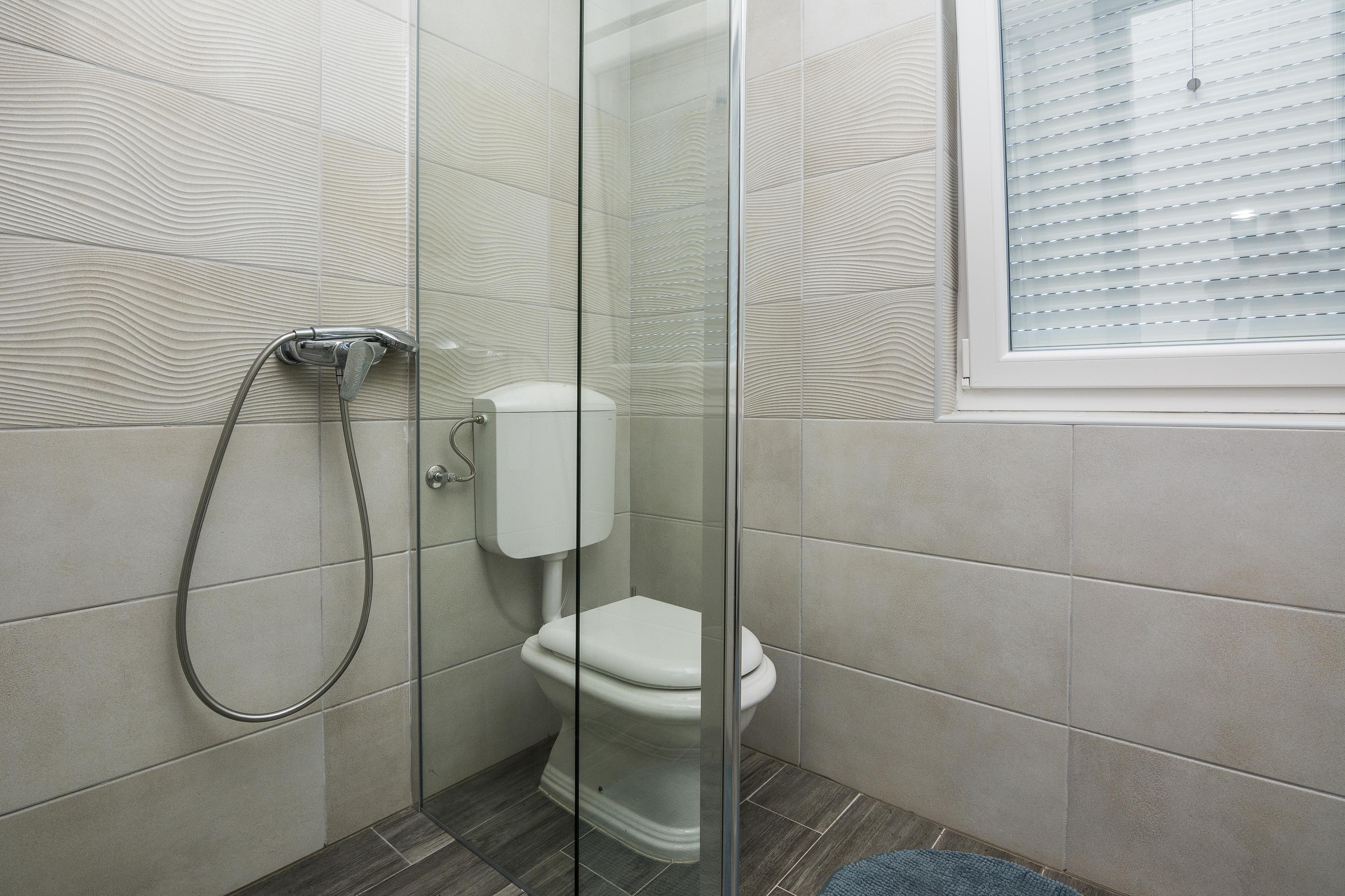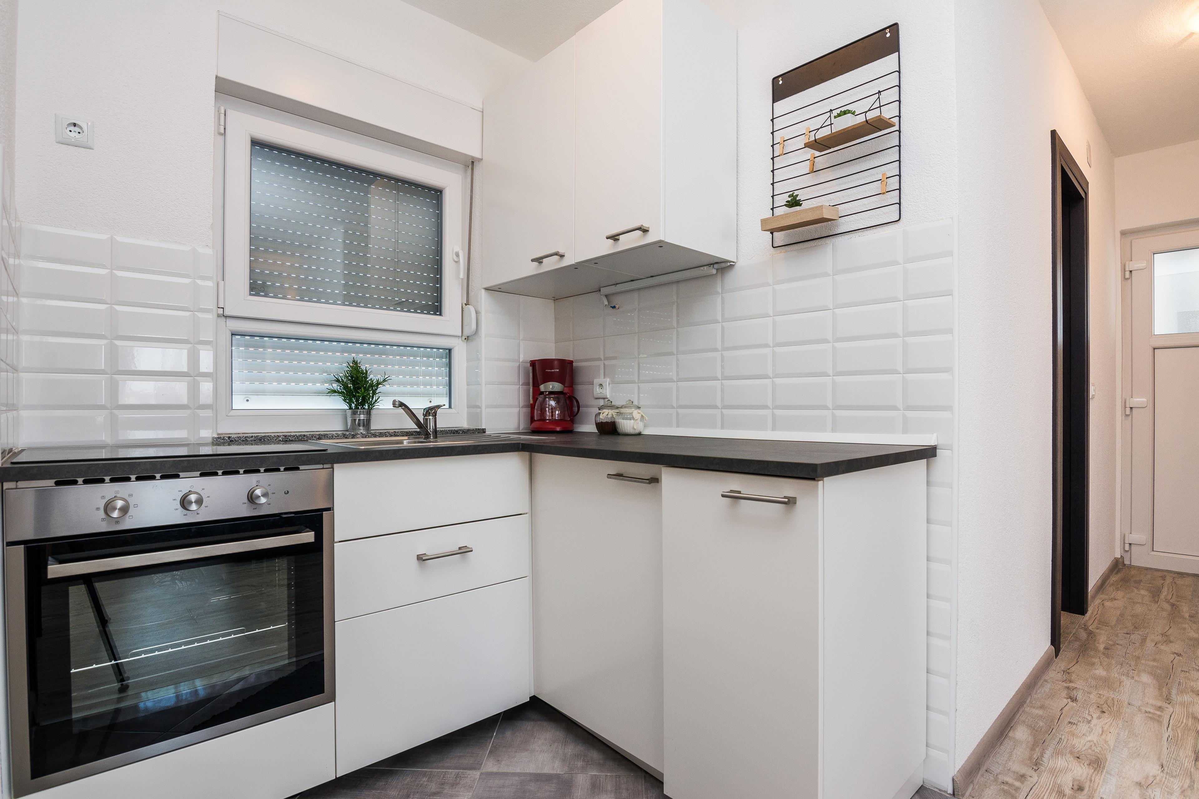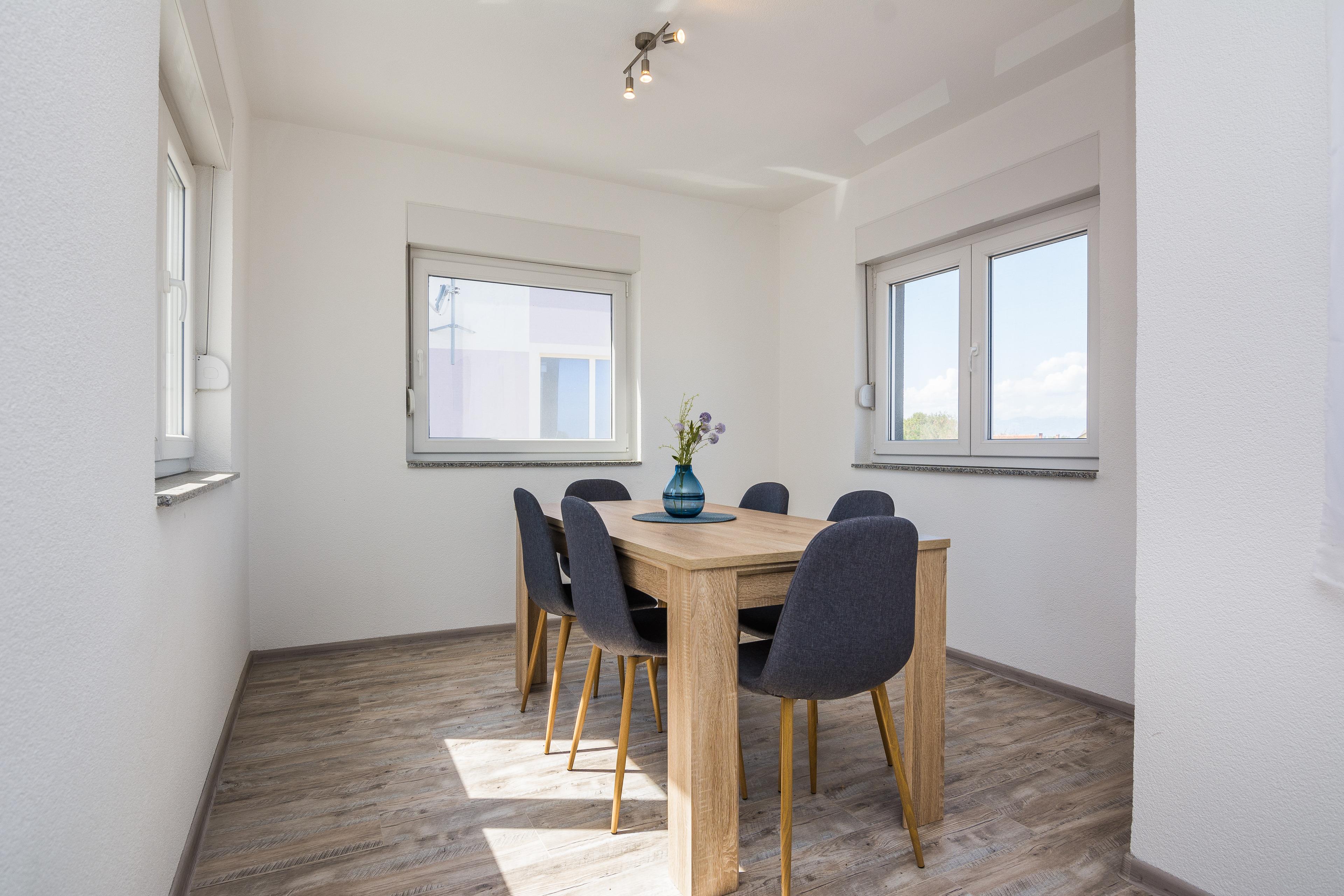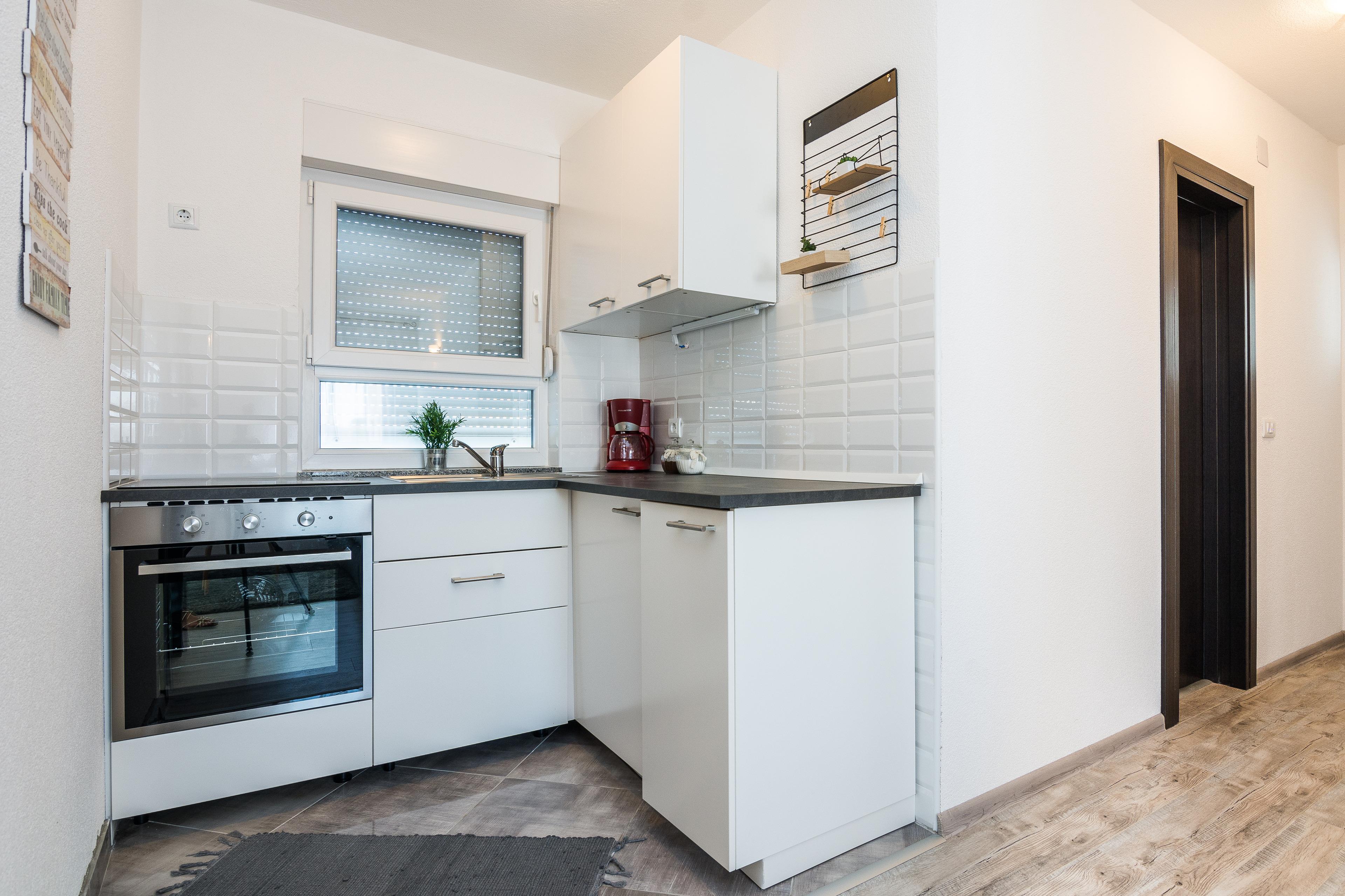 Im Ersten Stock des Hauses und teilt sich auf ein Wohnbereich und Esszimmer mit voll ausgestattet Küche, ein Doppelzimmer mit Doppelbett, ein Badezimmer mit Dusche. Im Wohnzimmer gibt es ein Schlafsofa für zwei weitere Personen. Parkplatz auf dem Grundstück, Klimaanlage, SAT-TV, Internet per WLAN und Waschmaschine zählen zu den weiteren Ausstattungsmerkmalen. Babybett und Hochstuhl auf Anfrage erhältlich ohne Gebühr. Haustiere sind gegen einen Aufpreis von 15 EUR pro Tier und Nacht willkommen. Nur 100 m vom Haus entfernt befinden sich das Zentrum der Insel Vir und mehrere Restaurants, ein Einkaufsladen ist nur 50 m Vom entfernt.