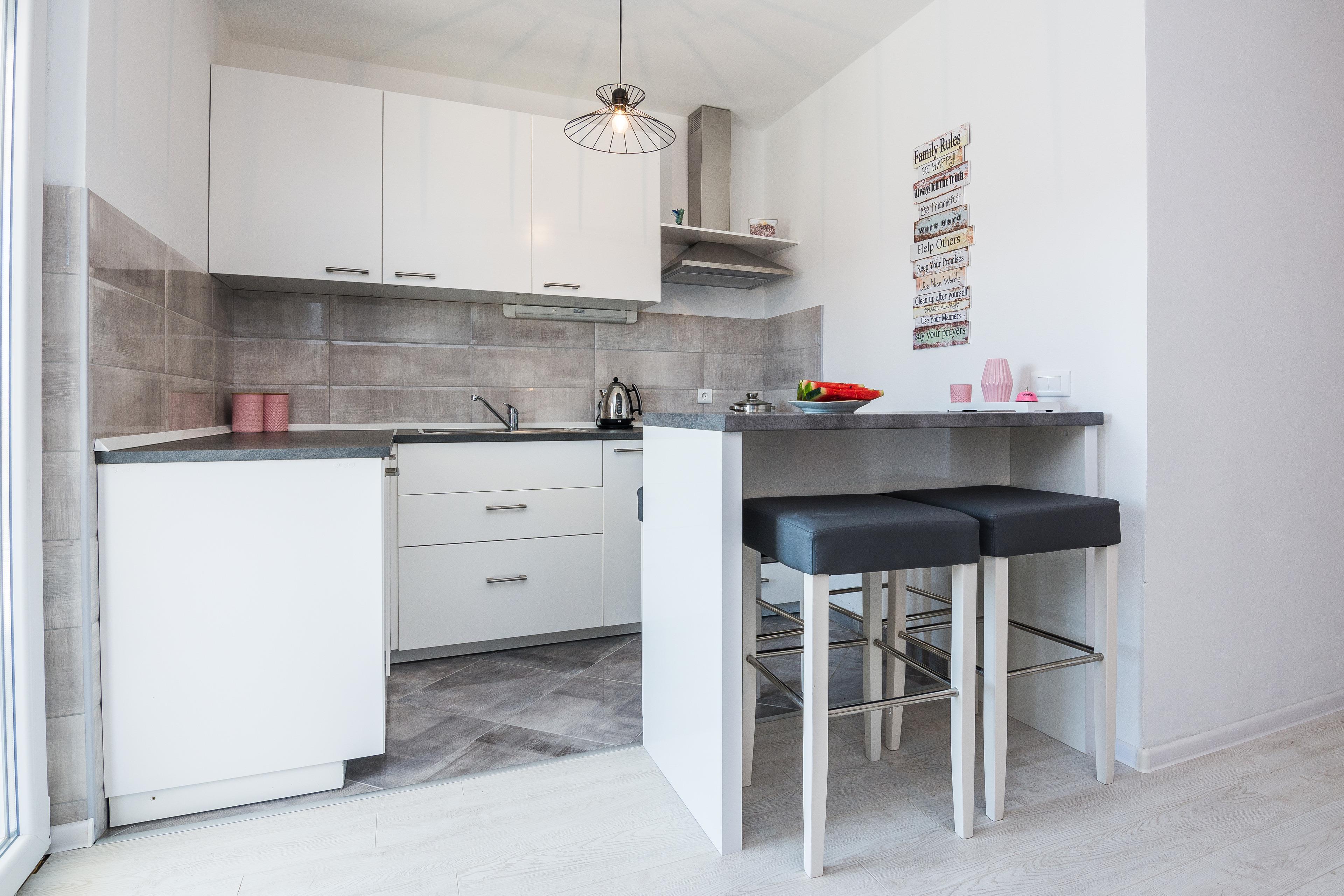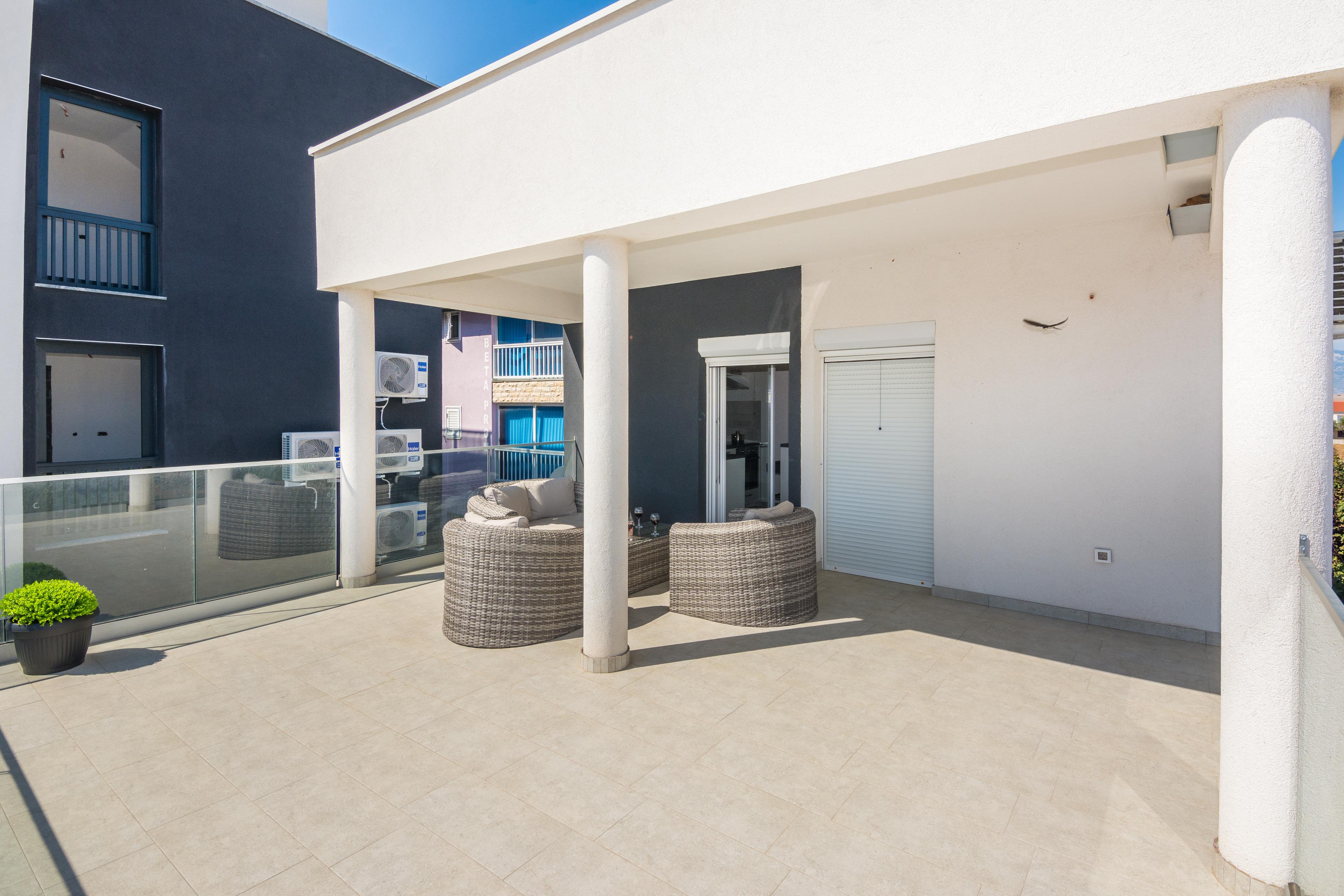 Im Ersten Stock des Hauses und teilt sich auf ein Wohnbereich und Esszimmer mit voll ausgestattet Küche, ein Doppelzimmer mit Doppelbett, ein Schlafzimmer mit einen Bett für eine Person, ein Badezimmer mit Dusche und 30 m² überdachter und möblierterBalkon. Im Wohnzimmer gibt es ein Schlafsofa für zwei weitere Personen. Parkplatz auf dem Grundstück, Klimaanlage, SAT-TV, Internet per WLAN und Waschmaschine zählen zu den weiteren Ausstattungsmerkmalen. Babybett und Hochstuhl auf Anfrage erhältlich ohne Gebühr. Haustiere sind gegen einen Aufpreis von 15 EUR pro Tier und Nacht willkommen. Nur 100 m vom Haus entfernt befinden sich das Zentrum der Insel Vir und mehrere Restaurants, ein Einkaufsladen ist nur 50 m Vom entfernt.
