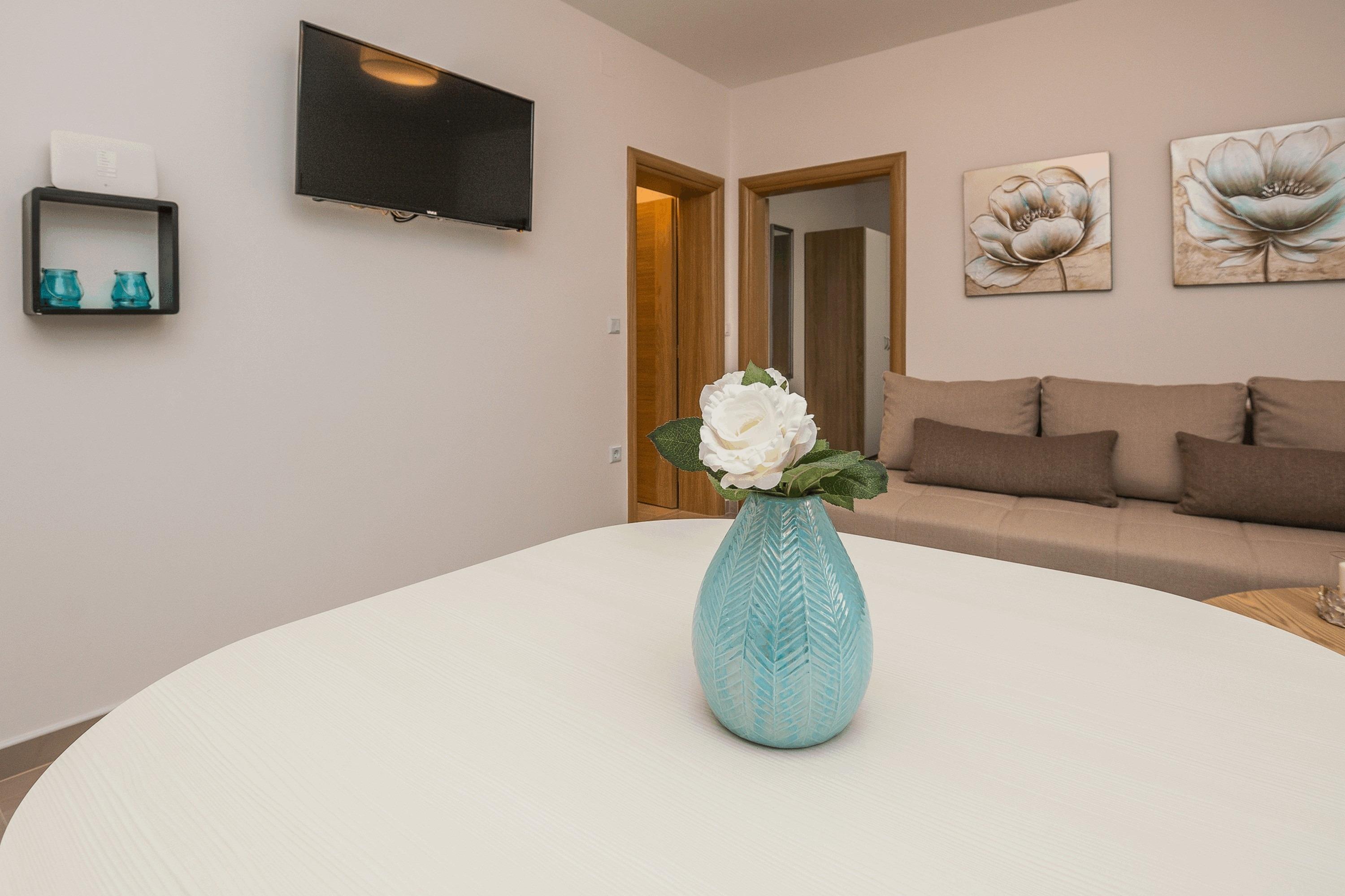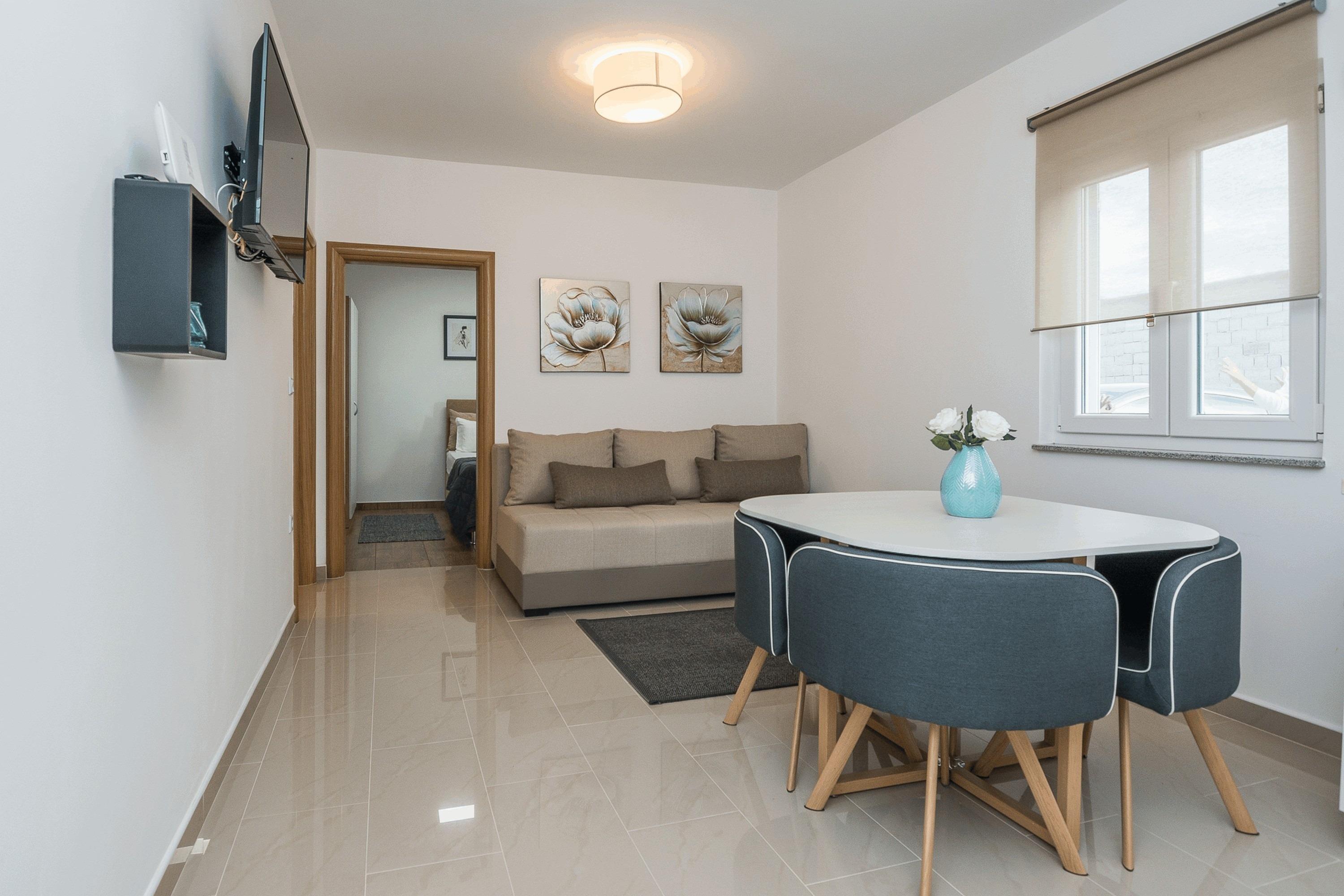 Moderne Wohnung für 2-4 Personen befindet sich im Erdgeschoss des Hauses und teilt sich auf ein Wohnzimmer und Esszimmer mit Küche, ein Schlafzimmer mit Doppelbett und Badezimmer mit Dusche. Im Wohnzimmer gibt es ein Schlafsofa für zwei weitere Personen. Die Wohnung verfügt über eine überdachte und möblierte Terrasse, die ideal zum Genießen mit Familie und Freunde ist. Voll ausgestattete Küche mit Geschirrspüler, Klimaanlage, WLAN Internet Zugang, Grill und Parkplatz im Innenhof zählen zu den weiteren Merkmalen dieser Wohnung. Nur 70m entfernt befindet einen Kiesstrand mit Betonierte Liegenflächen Soldatica.