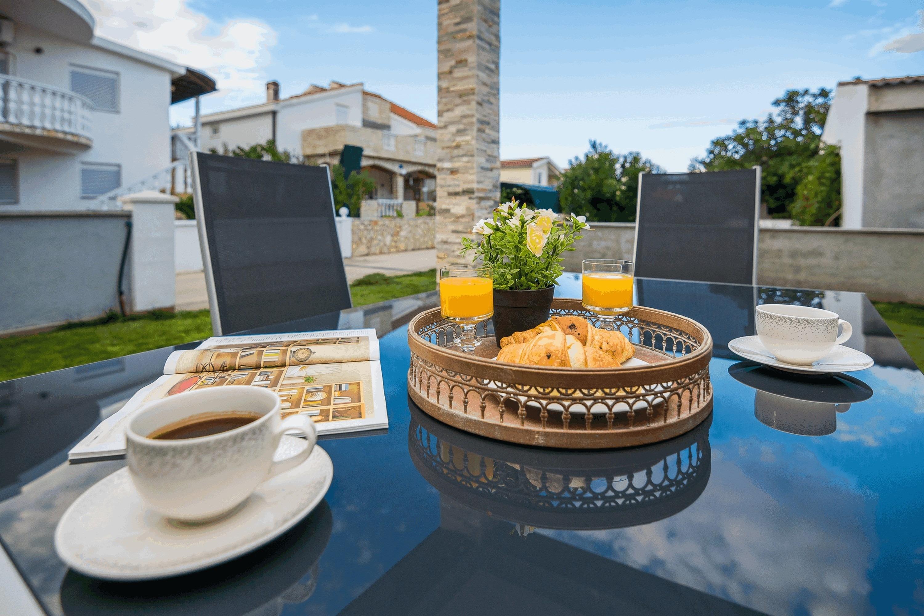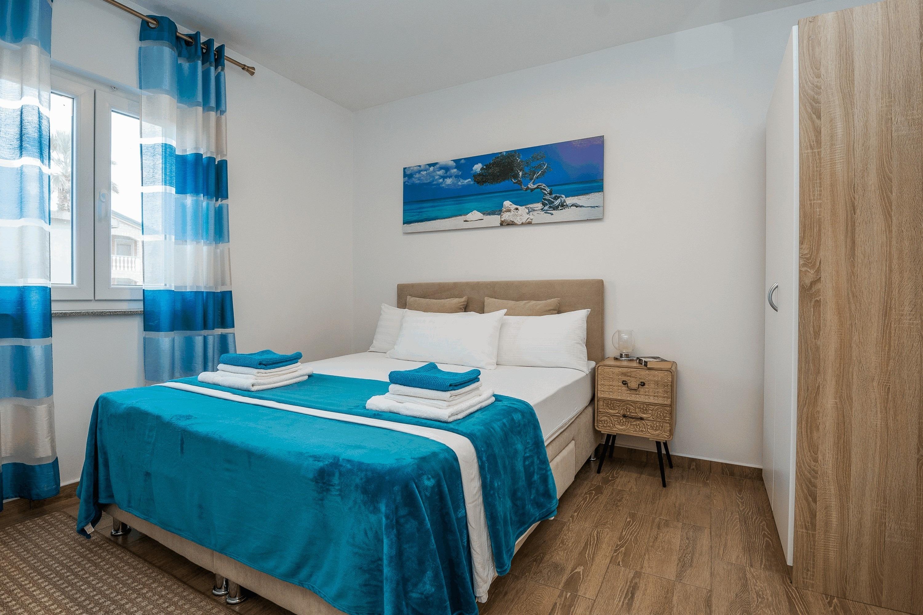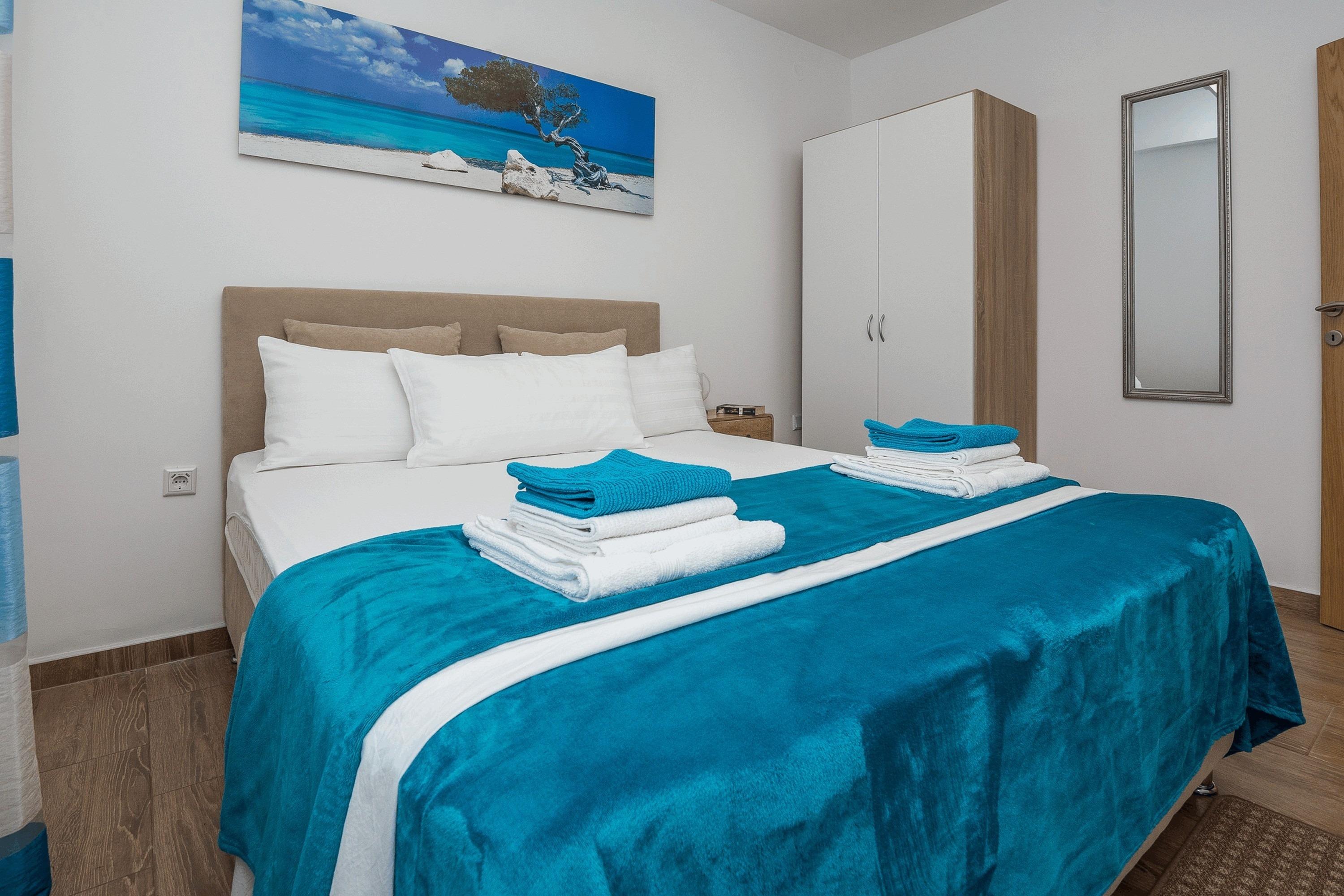 Moderne Wohnung für 2-4 Personen befindet sich im Erdgeschoss des Hauses und teilt sich auf ein Wohnzimmer und Esszimmer mit Küche, ein Schlafzimmer mit Doppelbett und Badezimmer mit Dusche. Im Wohnzimmer gibt es ein Schlafsofa für zwei weitere Personen. Die Wohnung verfügt über eine überdachte und möblierte Terrasse, die ideal zum Genießen mit Familie und Freunde ist. Voll ausgestattete Küche mit Geschirrspüler, Klimaanlage, WLAN Internet Zugang, Grill und Parkplatz im Innenhof zählen zu den weiteren Merkmalen dieser Wohnung. Nur 70m entfernt befindet einen Kiesstrand mit Betonierte Liegenflächen Soldatica.