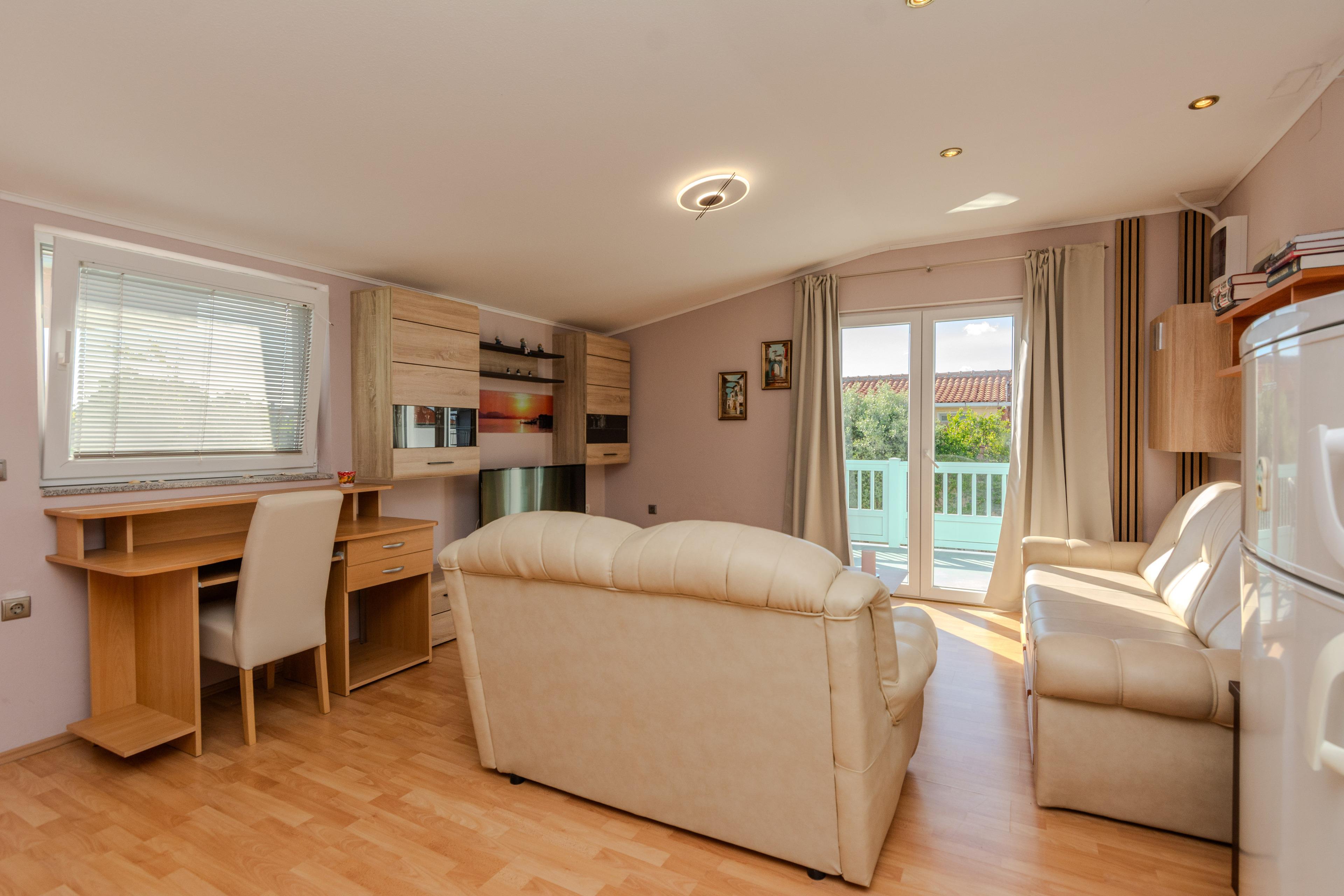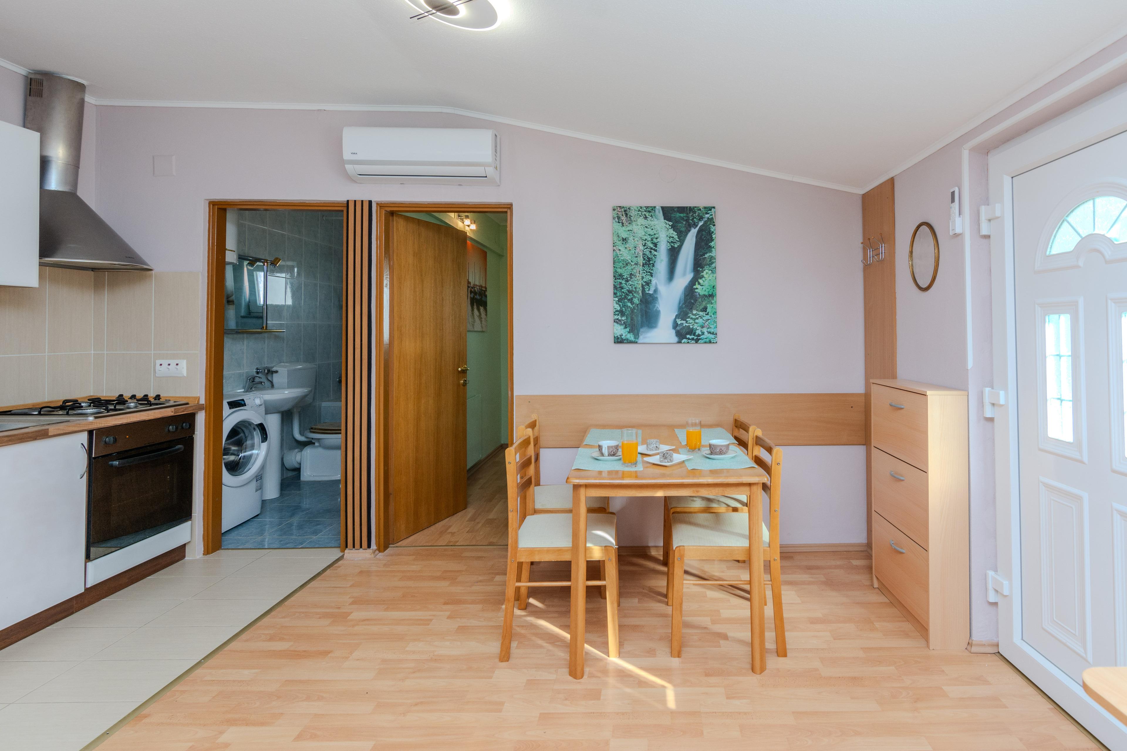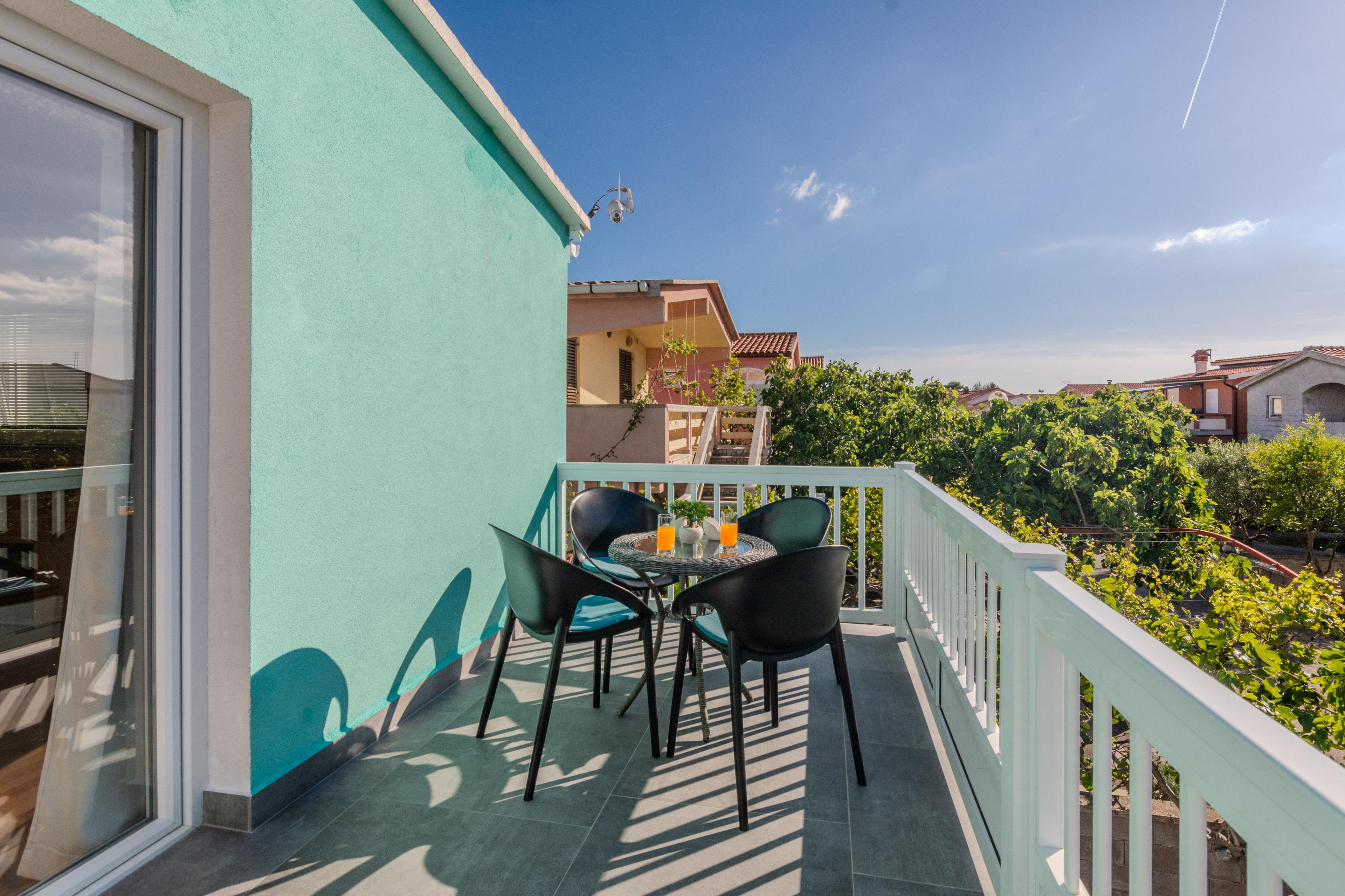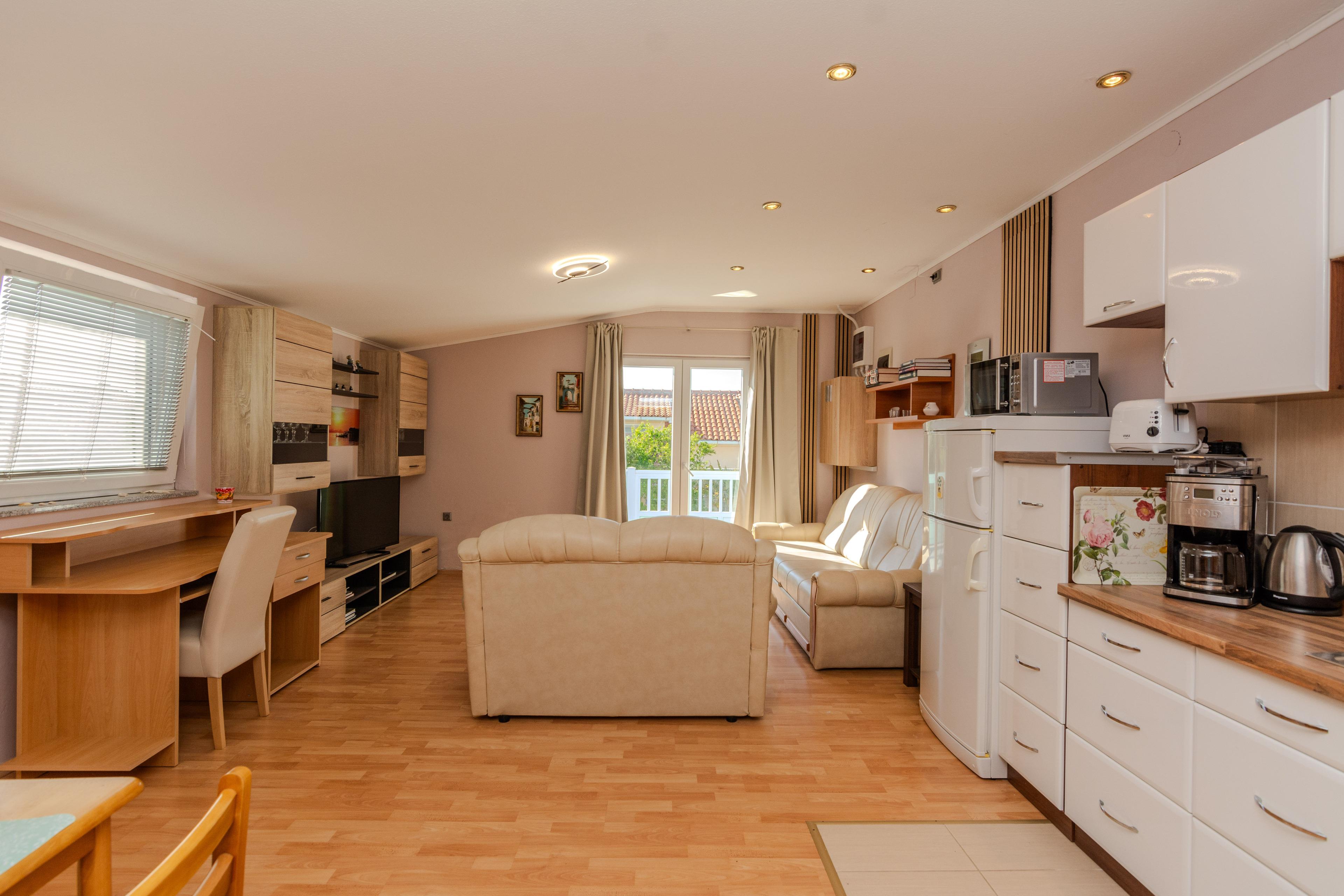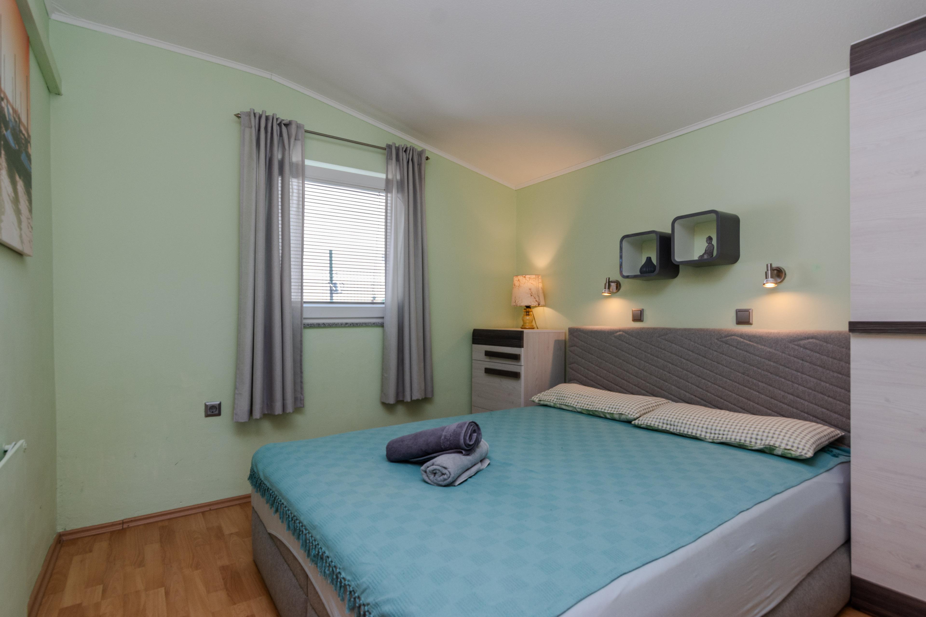 Die 40 m² FeWo befindet sich im ersten Stock des Hauses und ist unterteilt in ein Wohnzimmer mit Essbereich und voll ausgestattete Küche, ein Schlafzimmer mit einen Doppelbett, ein Badezimmer mit Badewanne und einen 6 m2 Balkon die ist mit Tisch und Stühlen eingerichtet. Im Wohnzimmer gibt es eine Schlafsofa für zwei weitere Personen. Klimaanlage, WLAN-Internetzugang, Sat-TV sowie Parkplatz und Grill im Innenhof zählen zu den weiteren Merkmalen dieses Apartments. In 250 m Entfernung befindet sich den Kieselstrand Bobovik. Geschäfte, Restaurants und das Zentrum von Vir sind nur wenige Gehminuten entfernt.