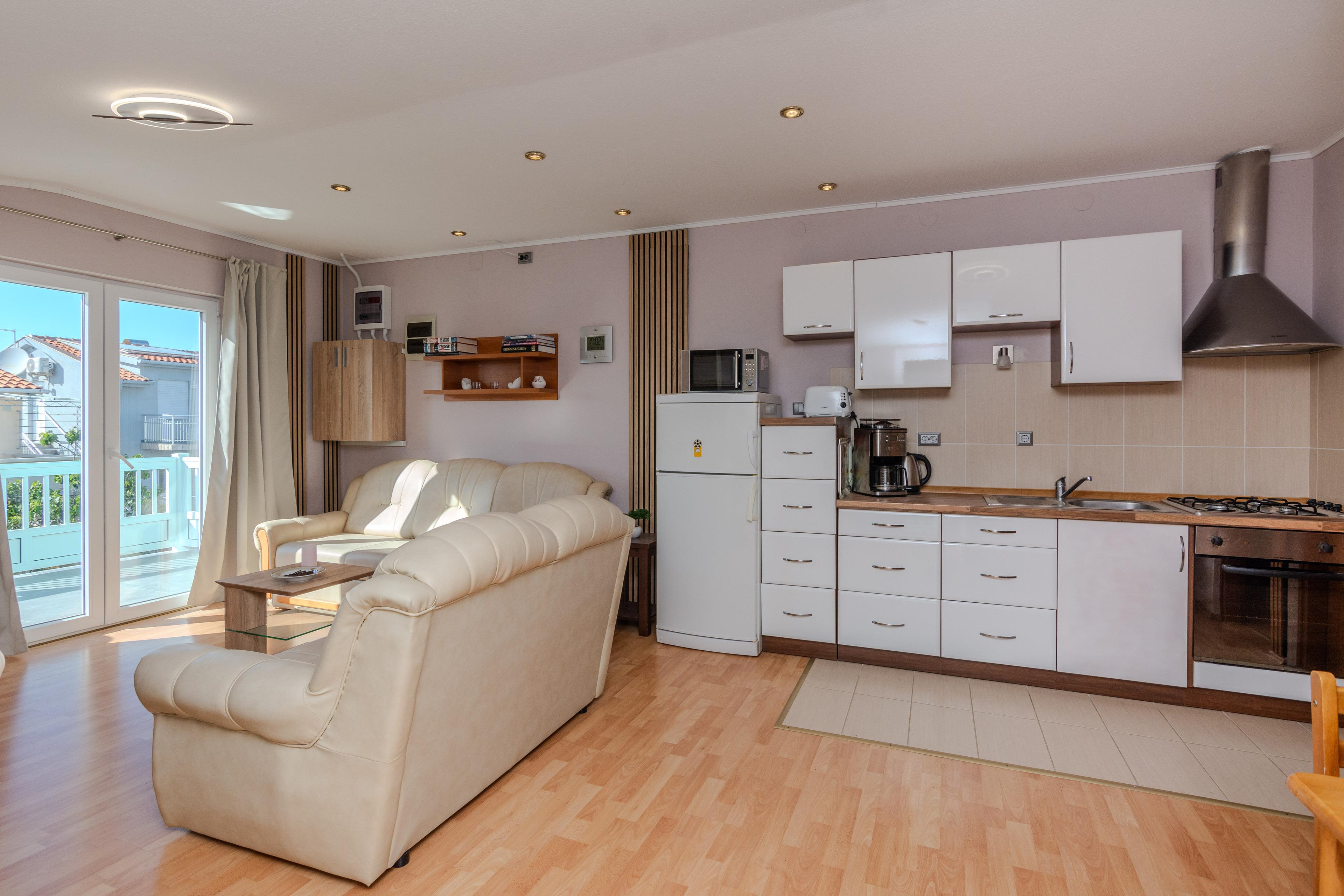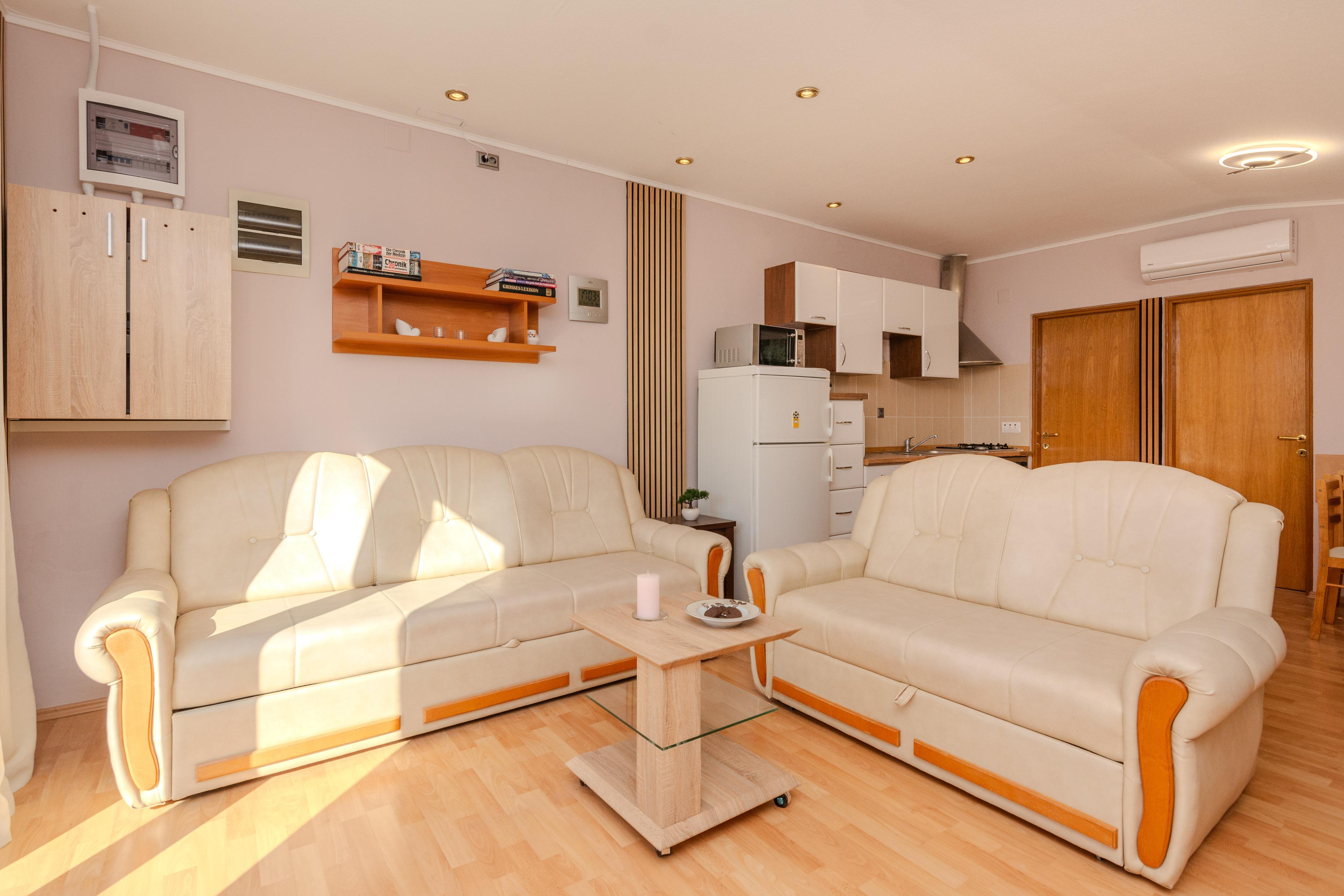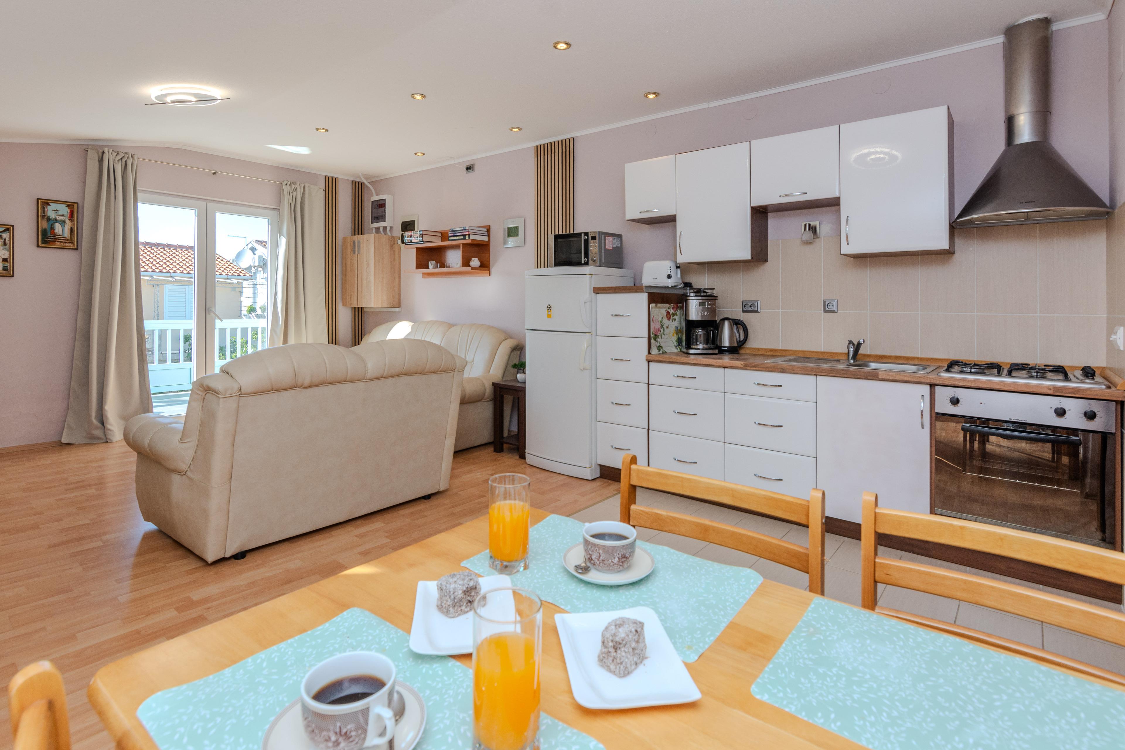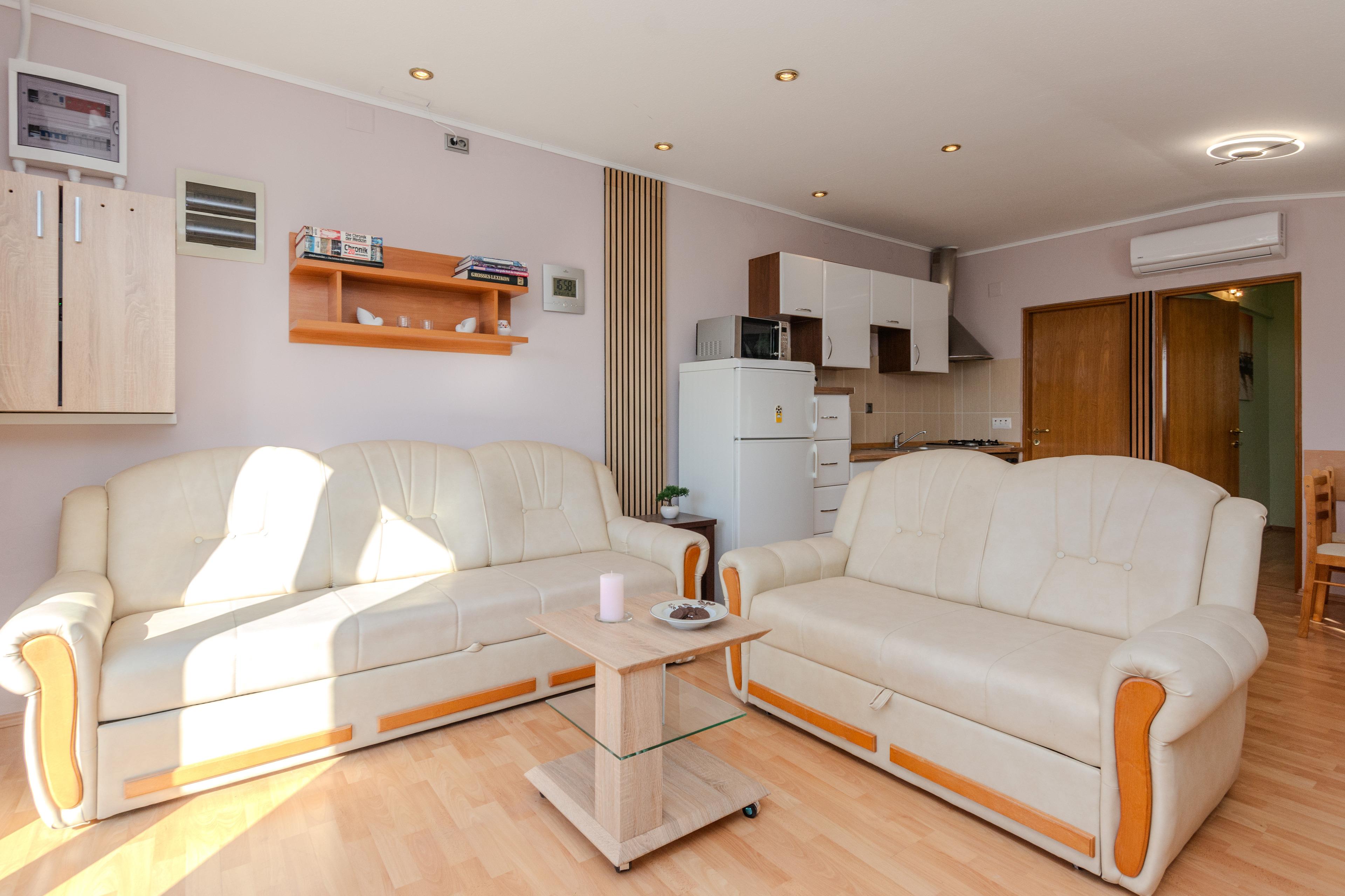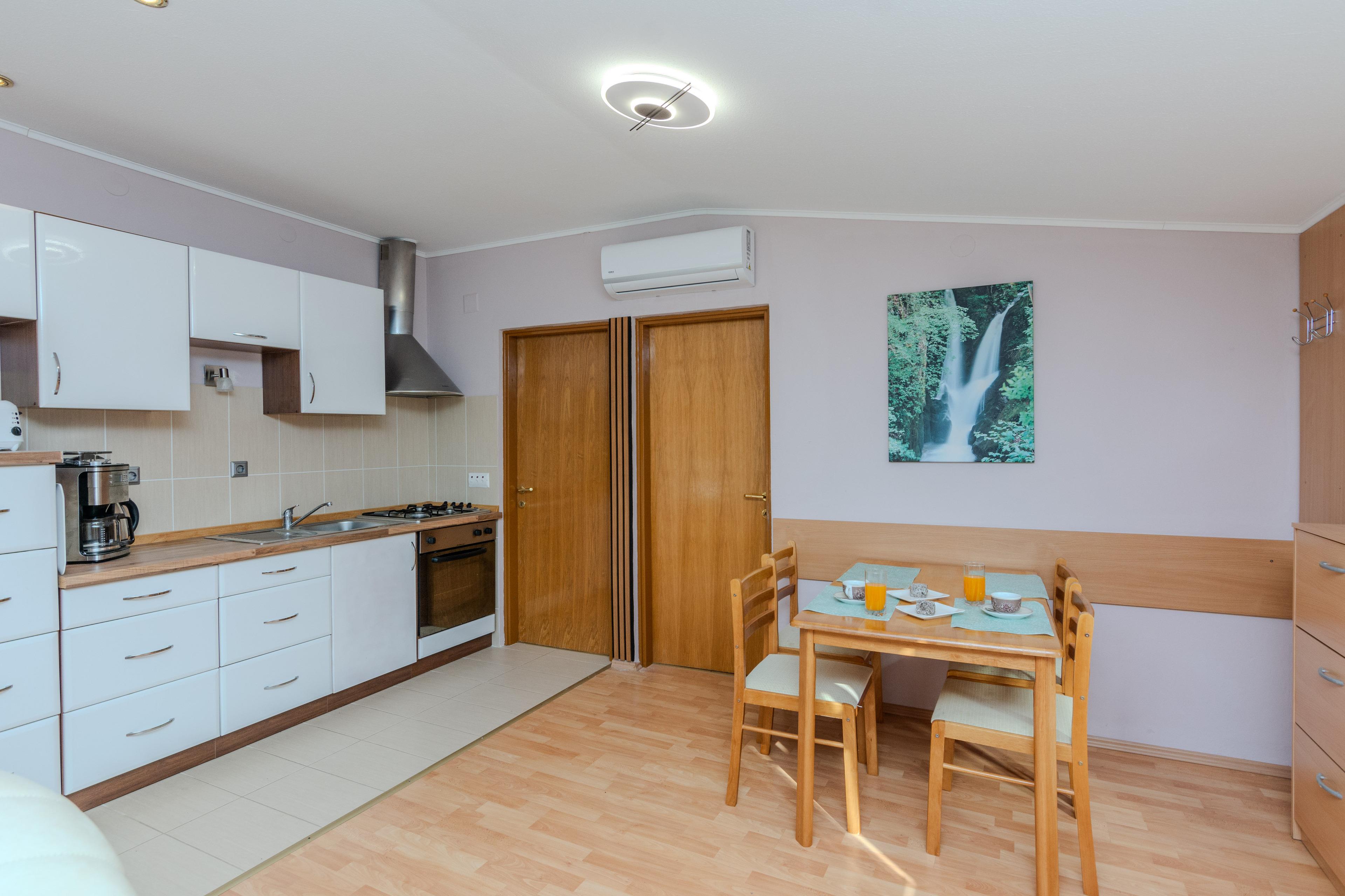 Die 40 m² FeWo befindet sich im ersten Stock des Hauses und ist unterteilt in ein Wohnzimmer mit Essbereich und voll ausgestattete Küche, ein Schlafzimmer mit einen Doppelbett, ein Badezimmer mit Badewanne und einen 6 m2 Balkon die ist mit Tisch und Stühlen eingerichtet. Im Wohnzimmer gibt es eine Schlafsofa für zwei weitere Personen. Klimaanlage, WLAN-Internetzugang, Sat-TV sowie Parkplatz und Grill im Innenhof zählen zu den weiteren Merkmalen dieses Apartments. In 250 m Entfernung befindet sich den Kieselstrand Bobovik. Geschäfte, Restaurants und das Zentrum von Vir sind nur wenige Gehminuten entfernt.