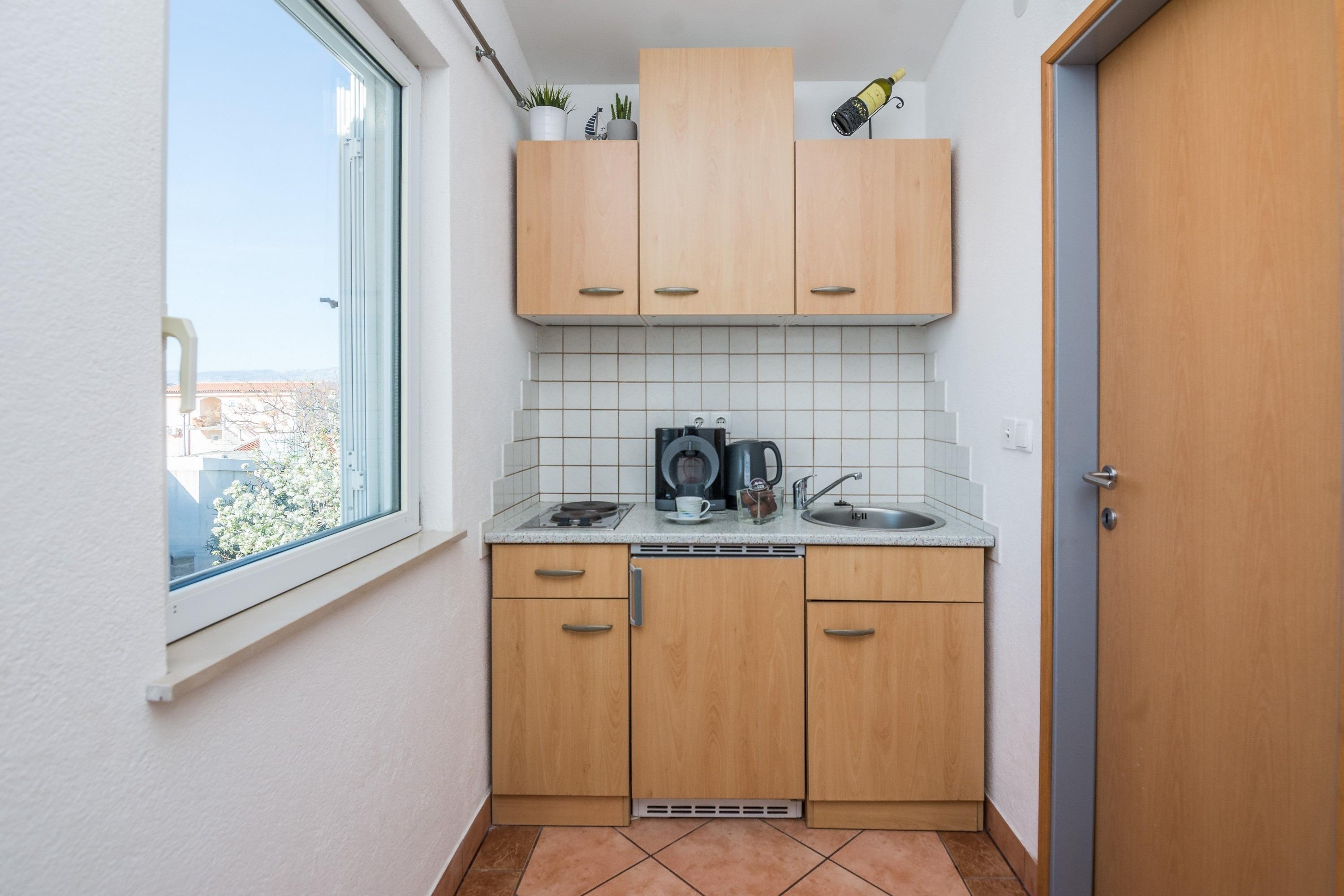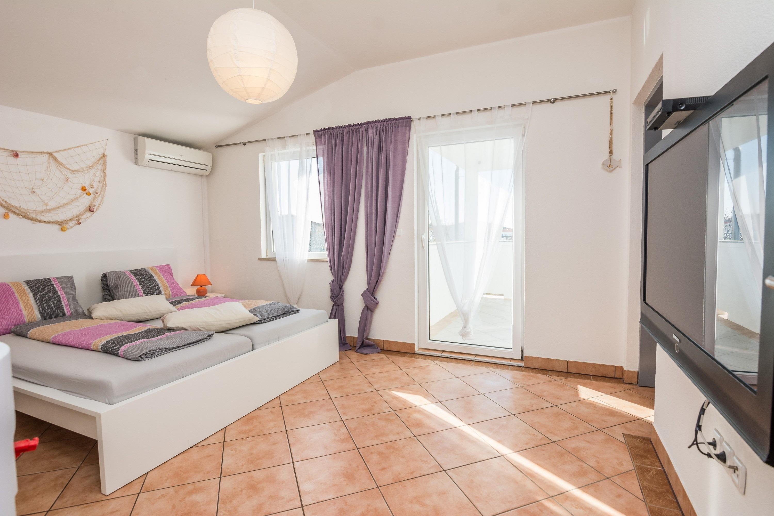 Die 25m2 Wohnung im ersten Stock des Hauses besteht aus einem Wohn- und Schlafbereich mit einem Doppelbett und ein Schlafsofa für eine weitere Person, Küche und Badezimmer mit Dusche und Toilette. Das Wohnzimmer öffnet sich auf einen 10m2 Balkon mit Tisch und Stühlen, der perfekte Ort zum Entspannen, Frühstück oder Abendessen. Klimaanlage, Sat-TV, Parkplatz auf dem Grundstück und ein Grill im Innenhof stehen Ihnen zur Verfügung und ohne Aufpreis. Geschäfte, Restaurants und das Zentrum von Vir sind nur wenige Gehminuten entfernt. Der Kieselstrand ist nur 100 Meter vom Haus entfernt.