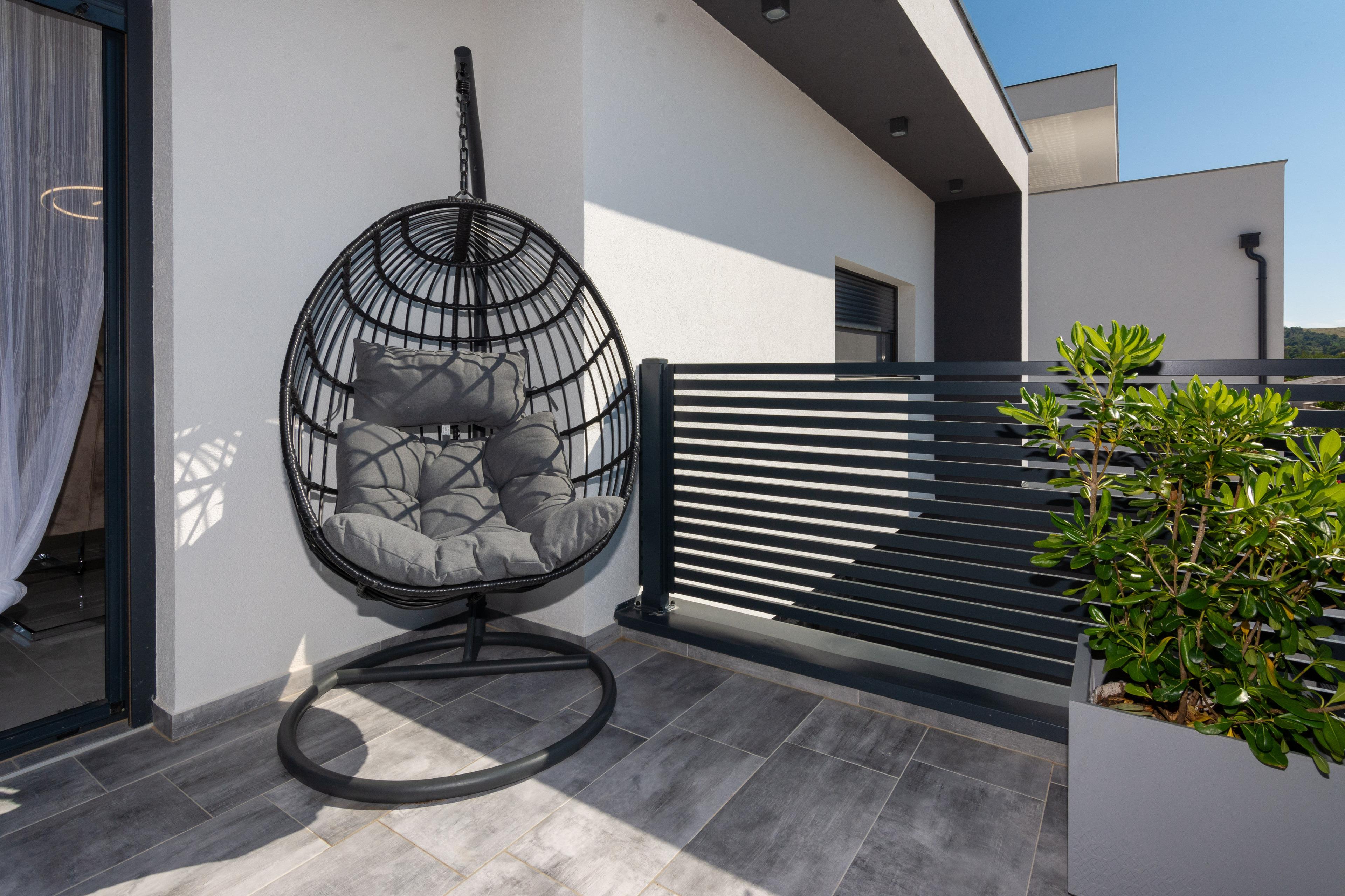 Das Apartment (80 m²) ist aufgeteilt in ein Wohnzimmer mit Essbereich, eine voll ausgestattete Küche, zwei Schlafzimmern mit Doppelbetten und ein Badezimmer mit Dusche. Das Wohnzimmer hat ein Schlafsofa für ein weitere Person. Zur Wohnung gehört ein 20 m² großer Balkon mit Tisch und Stühlen. Im Innenhof (200 m²) des Grundstücks befindet sich ein Grill.