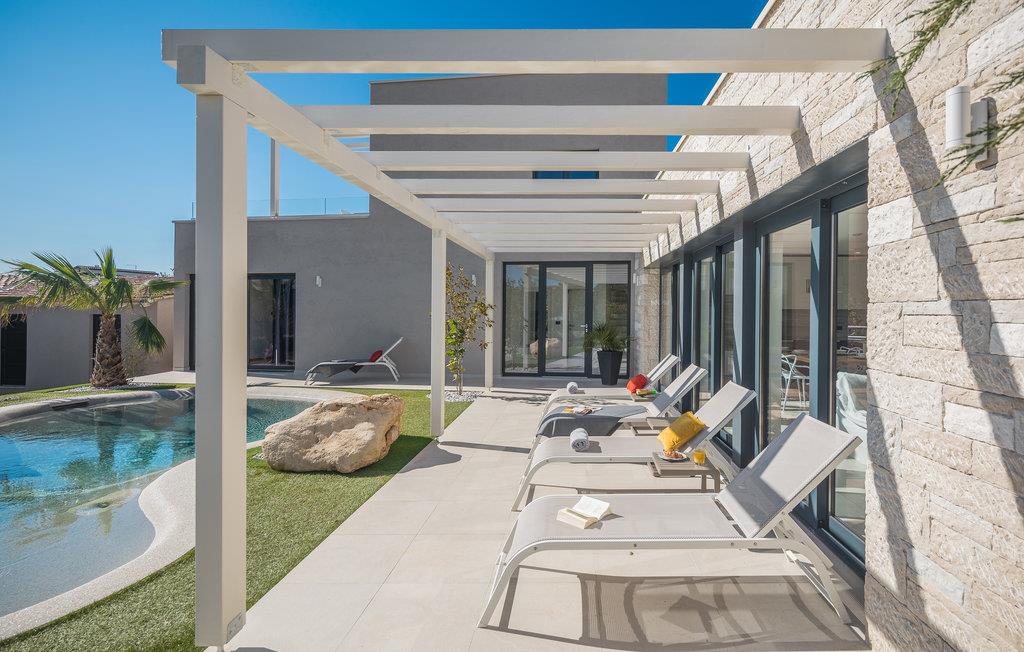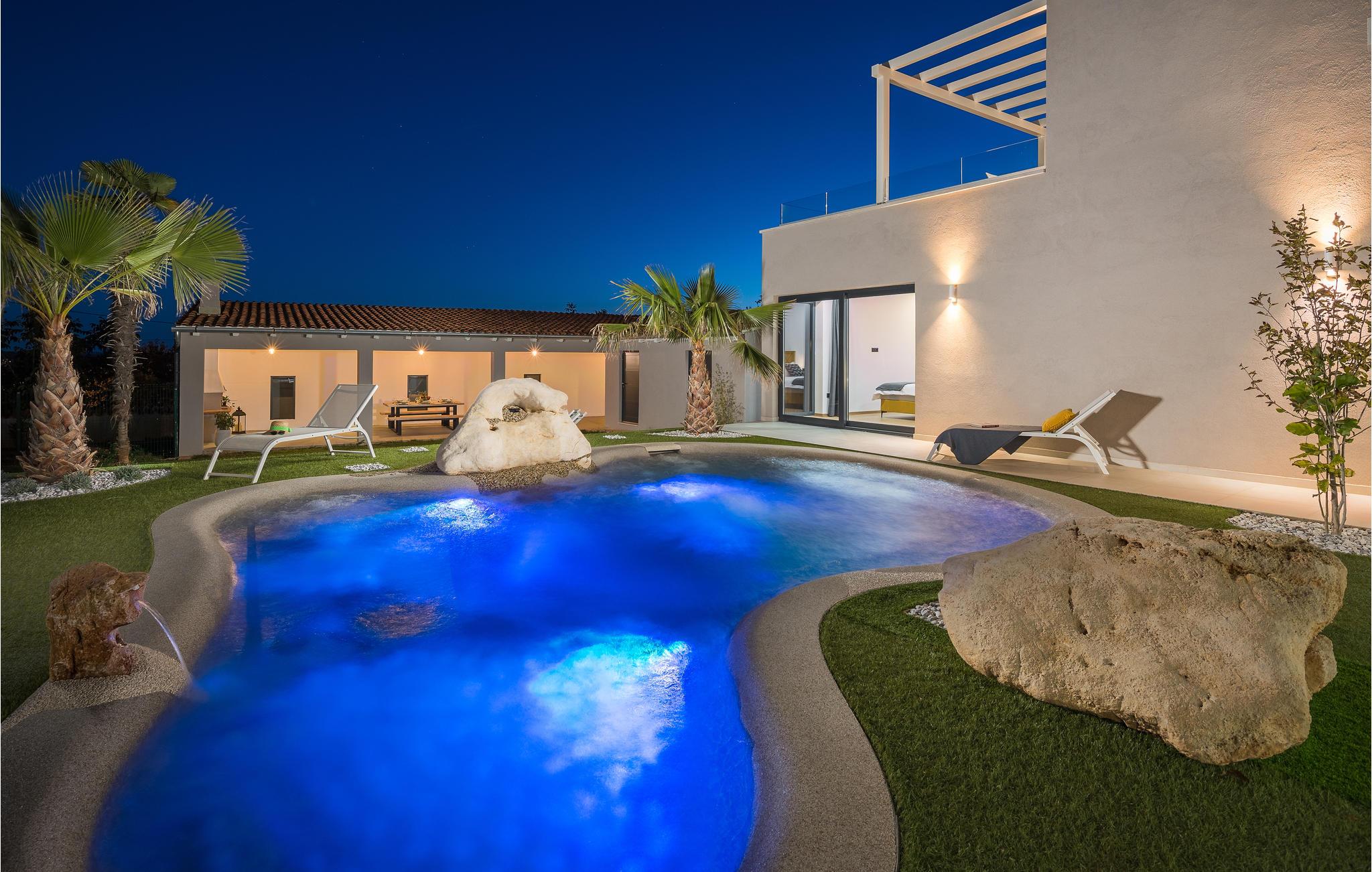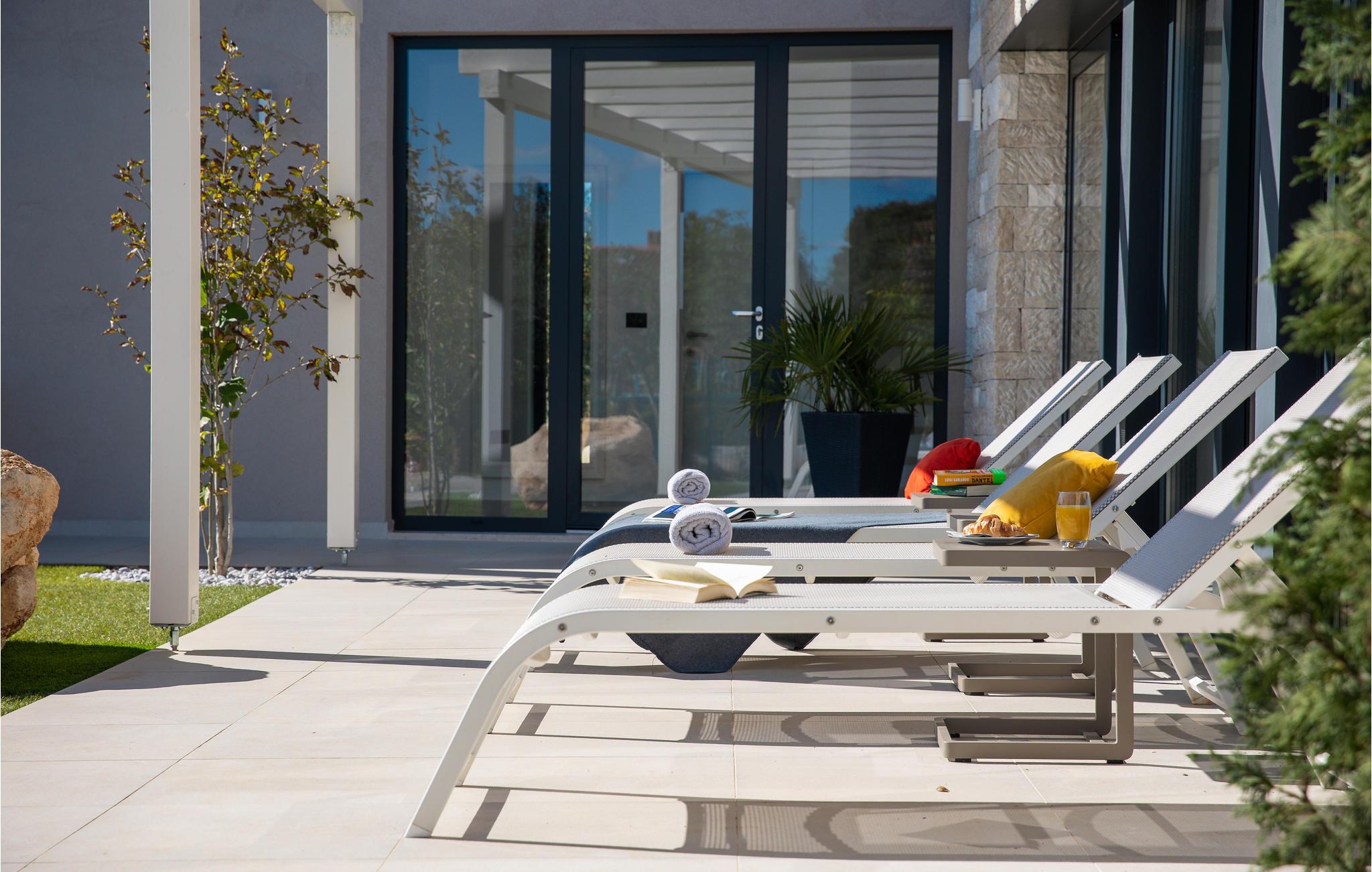 Udenfor tilbyder den private pool med hydromassage afkøling og afslapning på varme dage. Om aftenen kan I grille sammen på en af terasserne i det behagelige klima og nyde den rendyrkede feriestemning.