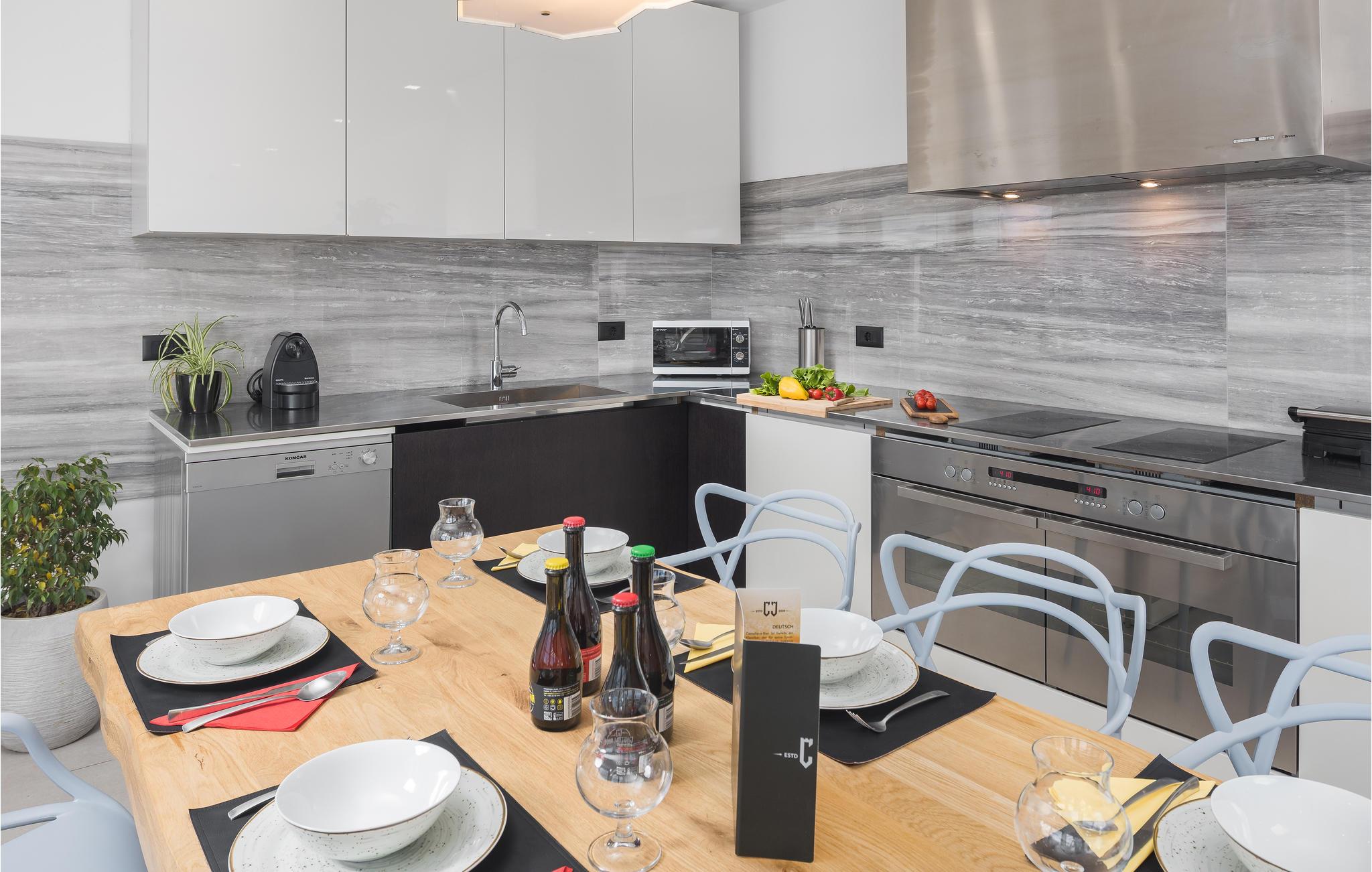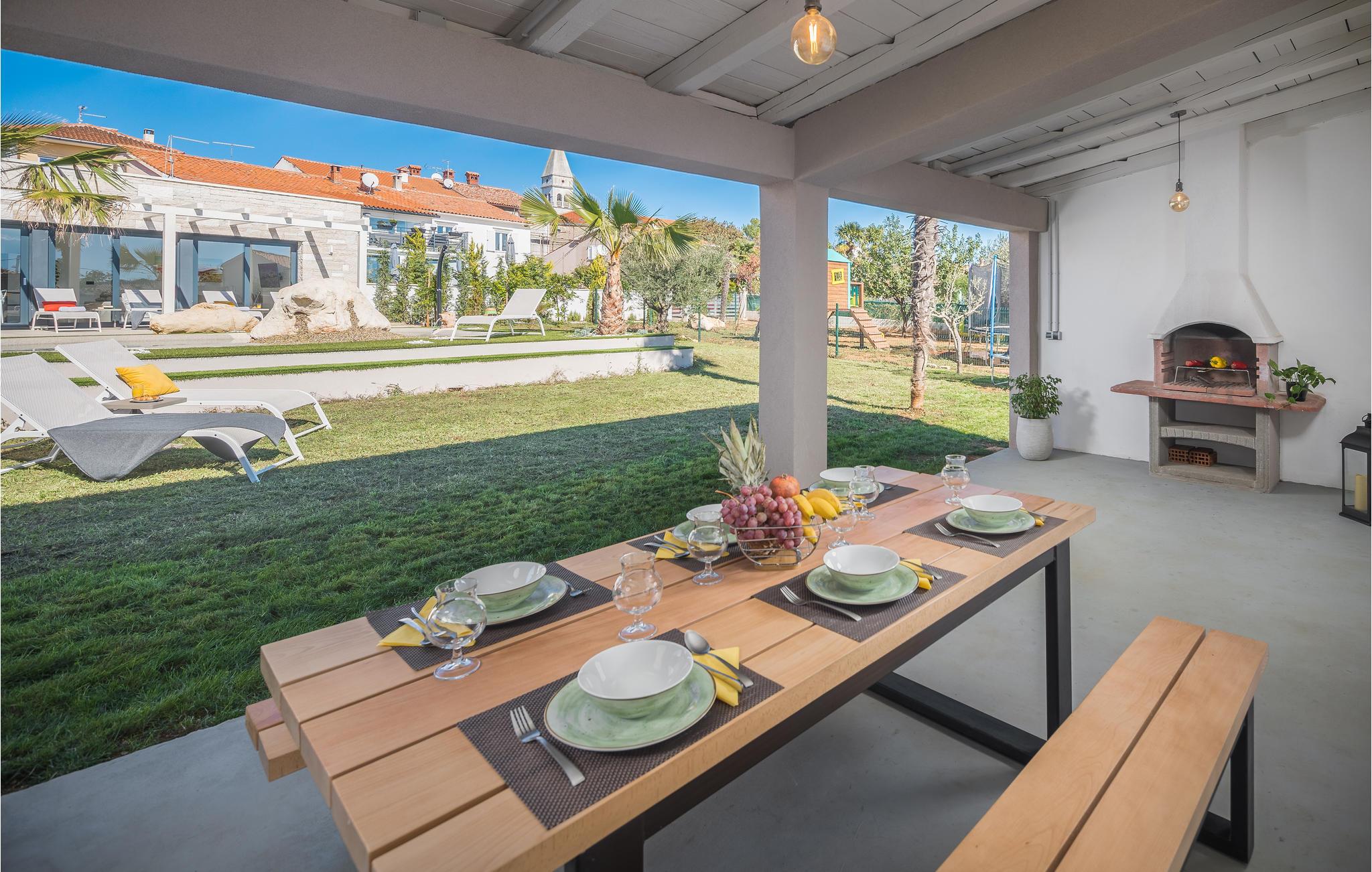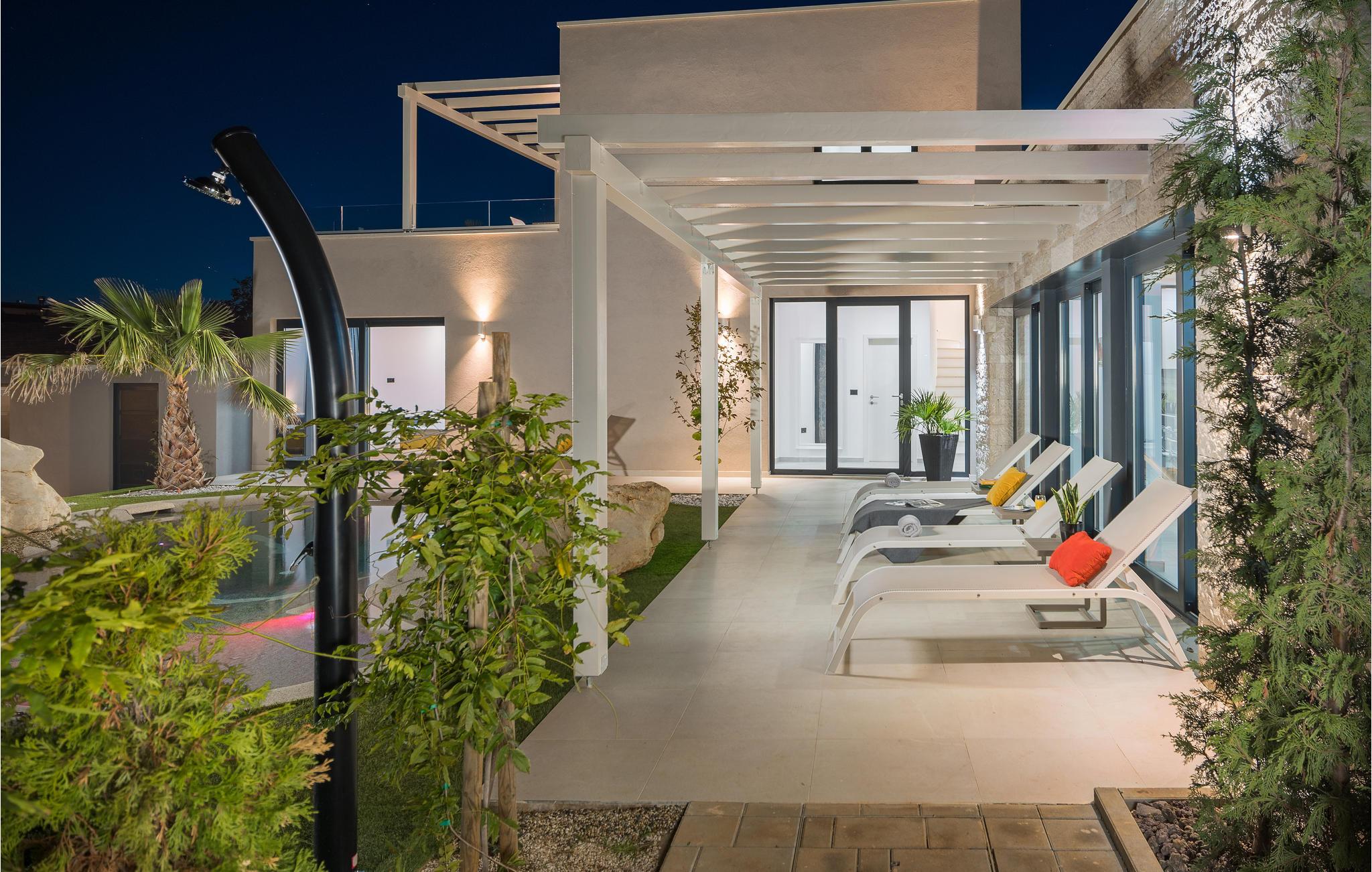 Udenfor tilbyder den private pool med hydromassage afkøling og afslapning på varme dage. Om aftenen kan I grille sammen på en af terasserne i det behagelige klima og nyde den rendyrkede feriestemning.