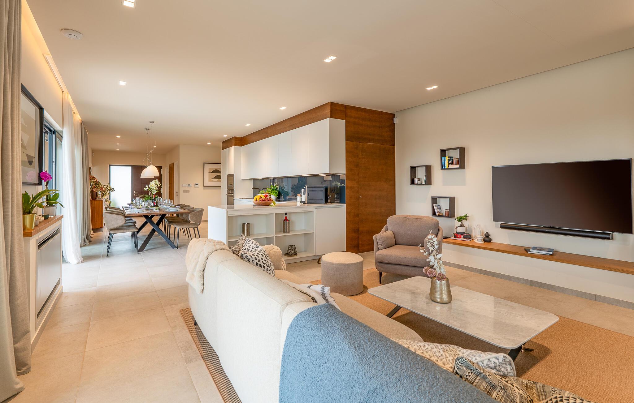 Interiøret er lyst og hjemligt og har et åbent design. Den fuldt klimatiserede opholdsstue med pejs, tv og komfortabel sofa flyder ind i den smarte spiseplads og det moderne, veludstyrede køkken. På samme niveau er der gæstetoilet og vaskeri. Et komfortabelt soveværelse med dobbeltseng og eget badeværelse fuldender dette niveau.