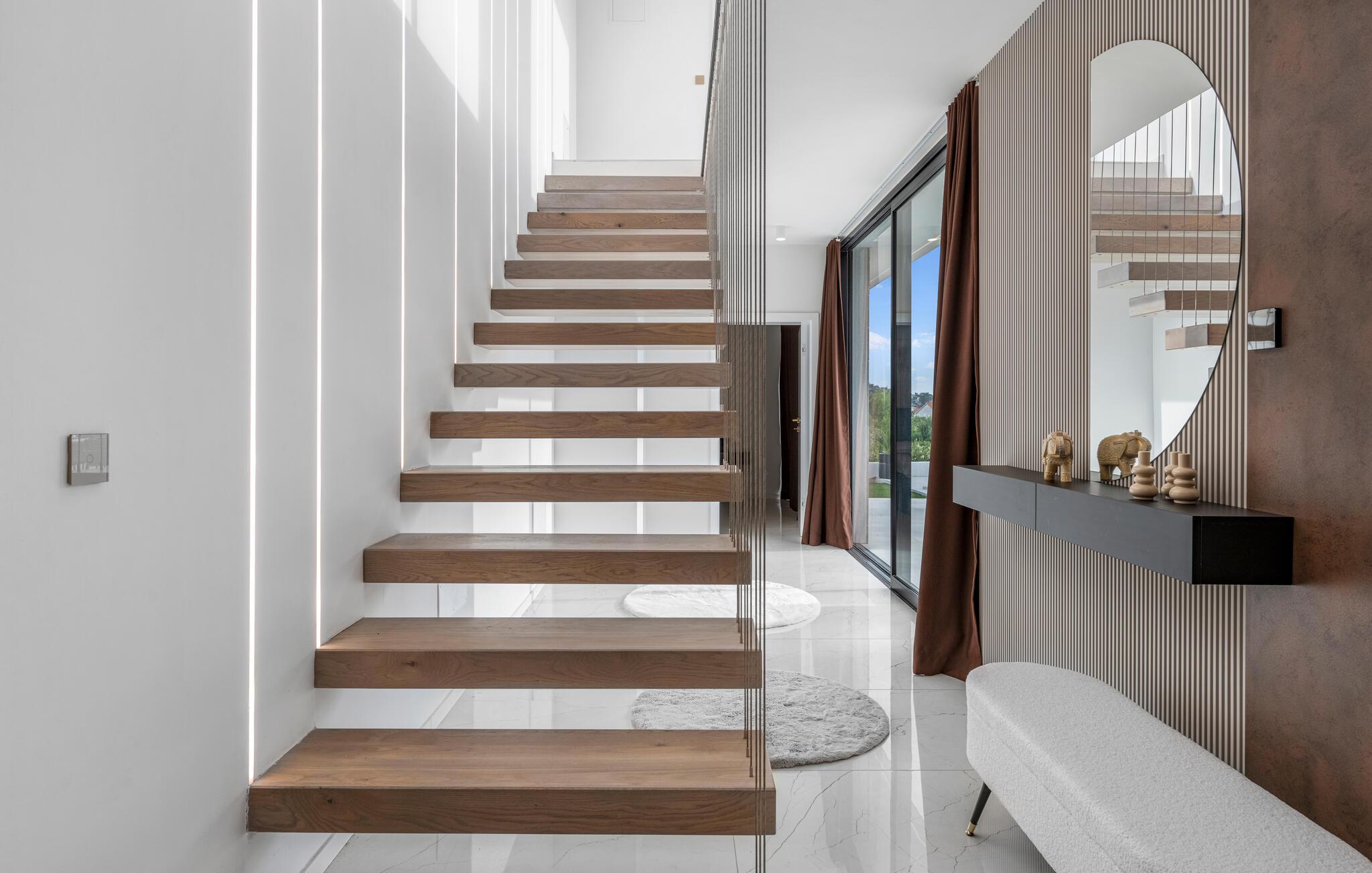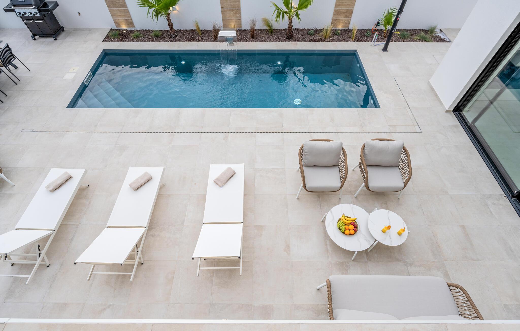 Udenfor finder I en smuk have med en rummelig swimmingpool, hvor I kan køle jer af lige fra morgenstunden på de varme sommerdage. På terrassen kan I nyde solen og tilbringe afslappende aftener med et godt glas vin, og på tagterrassen kan I nyde alle døgnets timer med en fortryllende havudsigt.