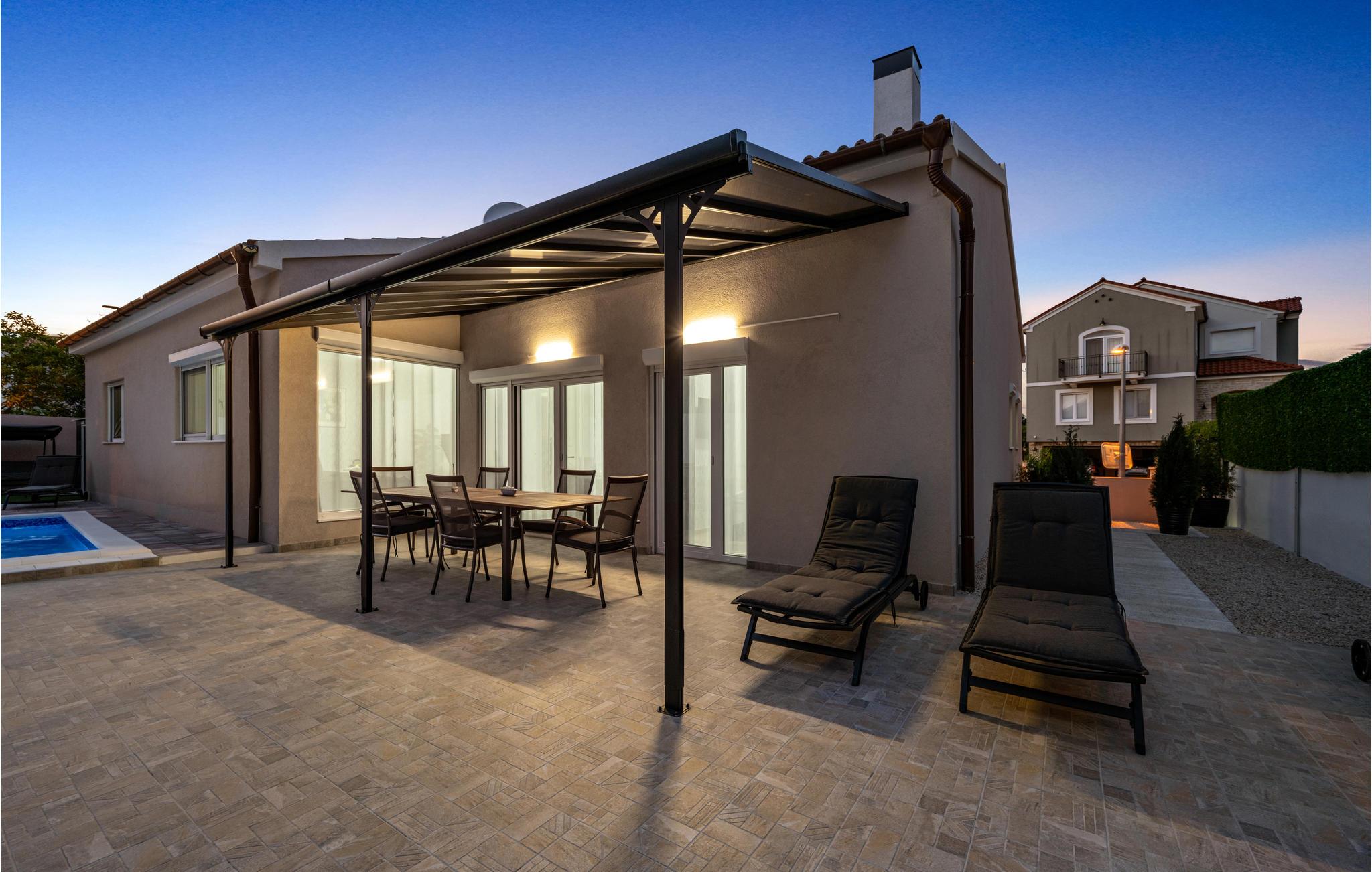 Det komfortable hus venter på jer med en god beliggenhed ikke langt fra havet. Den attraktive og moderne indretning gør det til et behageligt sted for en afslappende ferie. Tilbring mange afslappende timer i de lyse lokaler, som byder på både privatliv og plads til hyggelige aftener. Gulv til loft vinduerne giver en smuk udsigt udefra. Nyd skønne timer udendørs på husets terrasse. Tag en forfriskende dukkert i poolen og slap derefter af i en loungestol med en kold drink og jeres yndlingsbog. Glæd hele familien med lækkerier fra grillen og afslut en skøn dag med en middag i det fri.