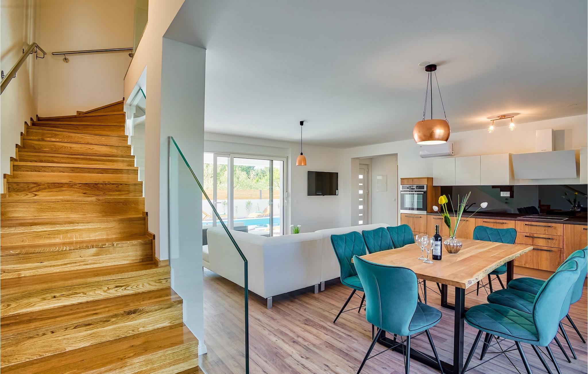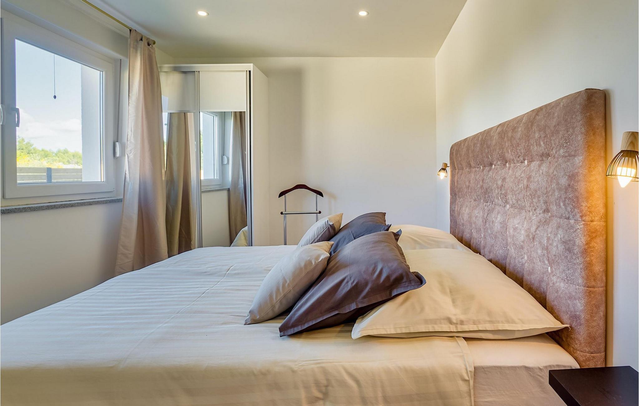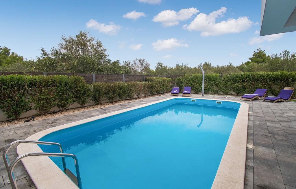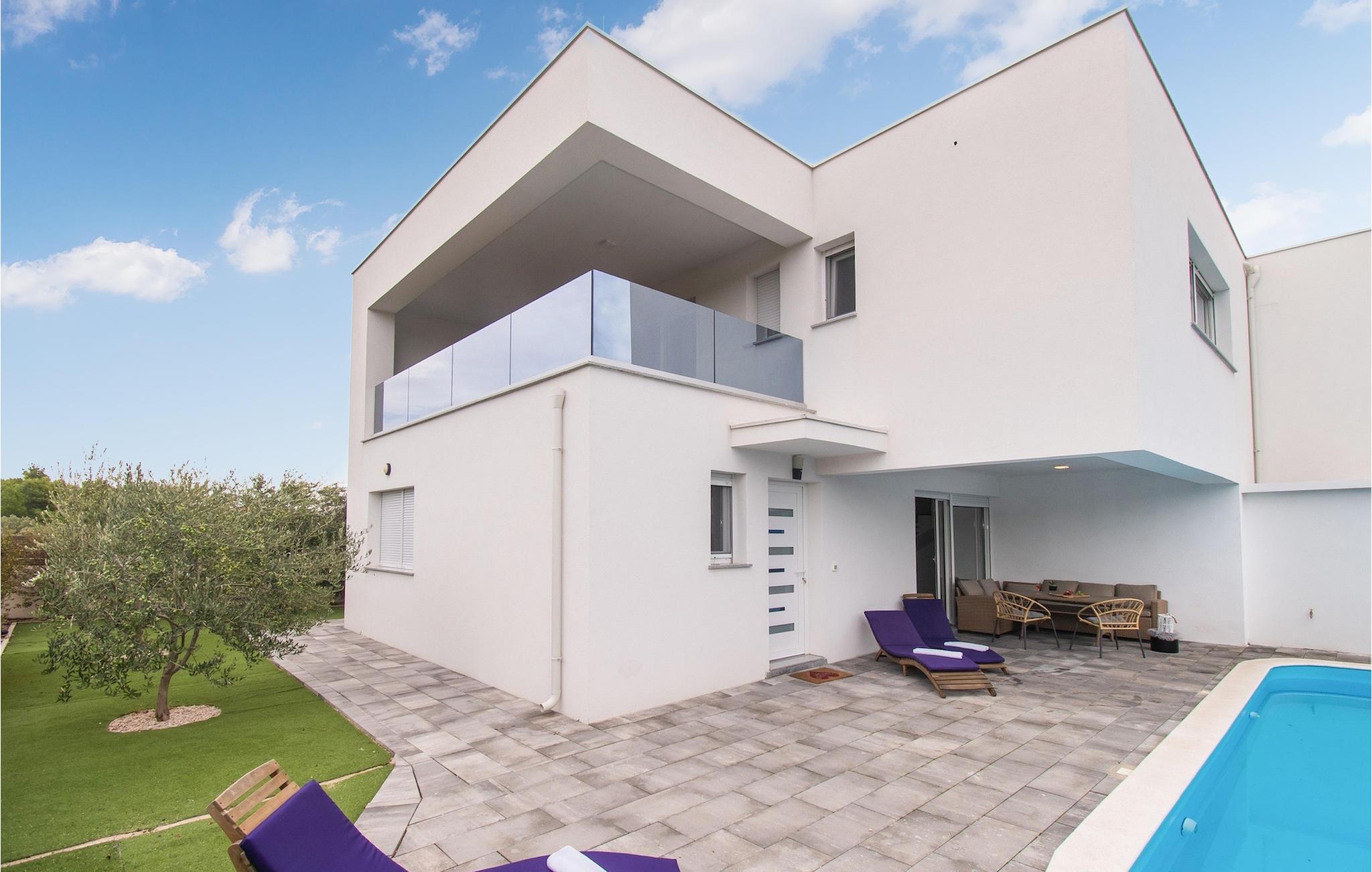 Denne elegante villa med 4 soveværelser og 4 badeværelser ligger kun 200 m fra den første strand i en mindre bygd, lige uden for byen Vodice. Det er designet og indrettet med en masse smag og vil tilbyde dig et behageligt ophold under din ferie. Villaen har en indbydende privat pool med liggestole, et behageligt opholdsområde og en rummelig balkon. Stueetagen har en åben plads, elegant opholdsstue med et fuldt udstyret køkken og spiseplads, som giver direkte adgang til den private pool og udendørsområdet. Et soveværelse i stueetagen med dobbeltseng har også direkte adgang til poolen, hvilket kan være meget praktisk for alle, der rejser med et kæledyr. Det ene badeværelse er også i stueetagen, mens de tre andre badeværelser alle er ensuite og er placeret på første sal sammen med de tre andre soveværelser med hver en dobbeltseng.