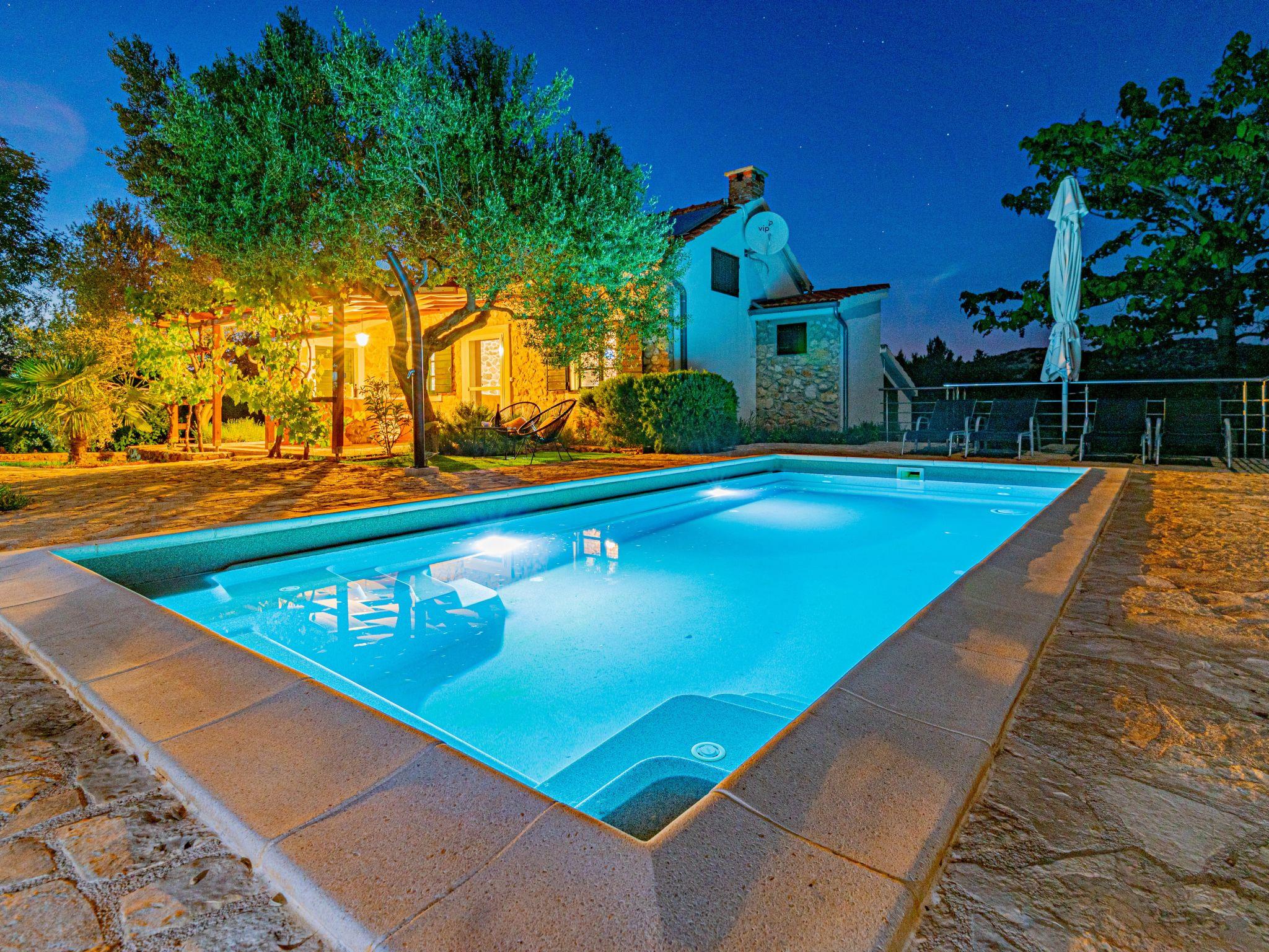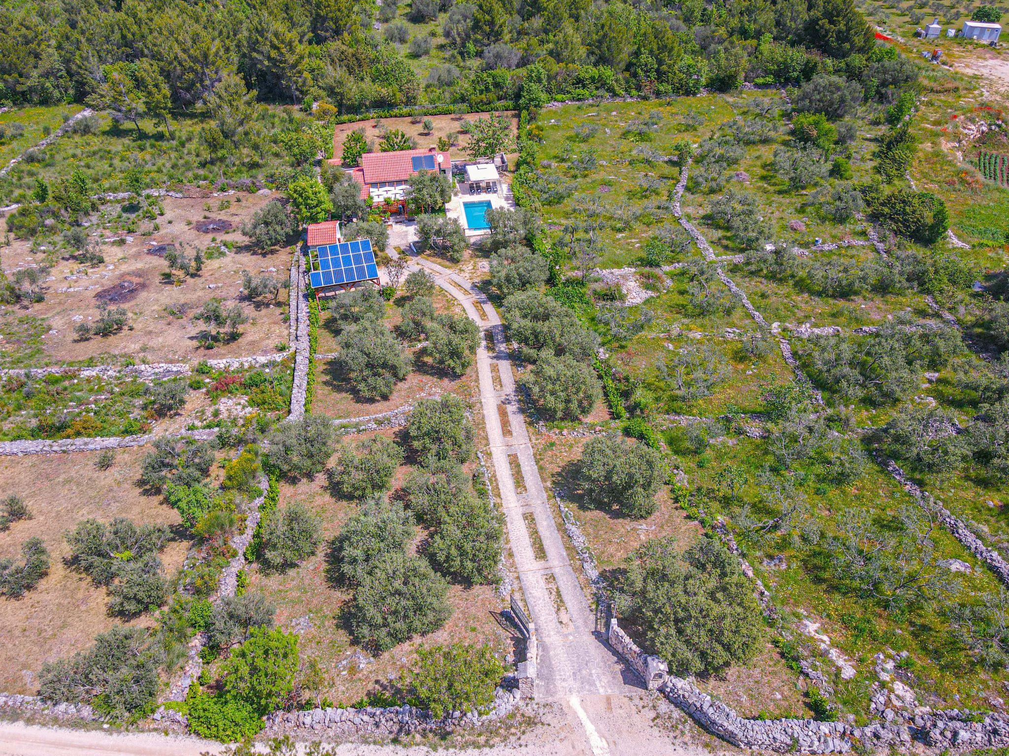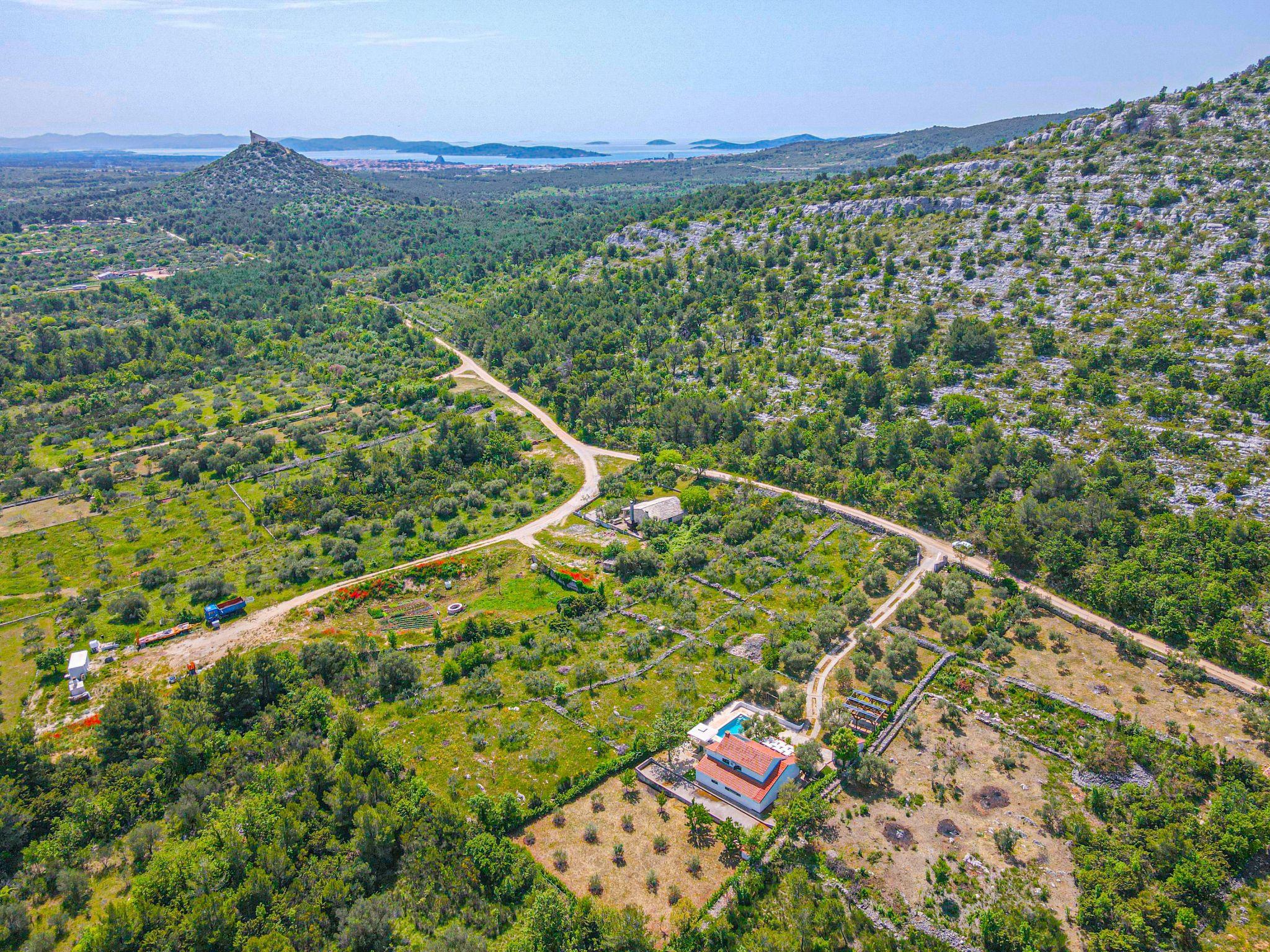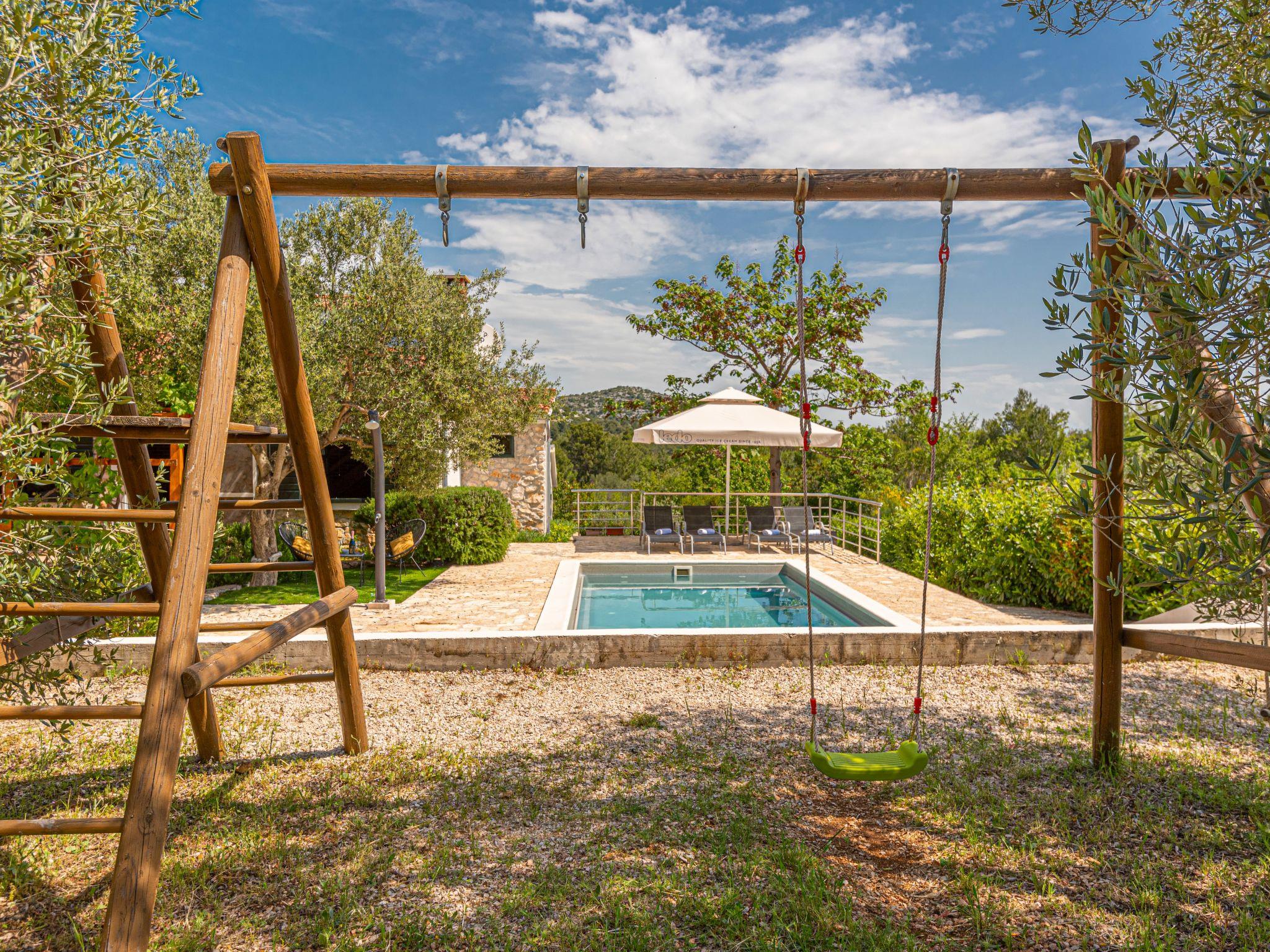 Single-family house "Okit", 2 storeys. 5 km from the centre of Vodice, in a quiet, sunny position, 6 km from the sea. Private: property 3'000 m2 with trees, swimming pool angular (32 m2, depth 150 cm, seasonal availability: 01.May. - 30.Sep.) with internal staircase. Outdoor shower, terrace (20 m2), garden furniture, barbecue, children's playground (swing). In the house: internet access, washing machine. Parking (for 3 cars) at the house on the premises. Shop 4 km, restaurant 5 km, bus stop 4 km, pebble beach 6 km, public bathing area 6 km. Marina 5 km, cycle lane 6 km. Nearby attractions: NP Krka 25 km, Aquapark 27 km. Well-known lakes can easily be reached: Vransko jezero 20 km.