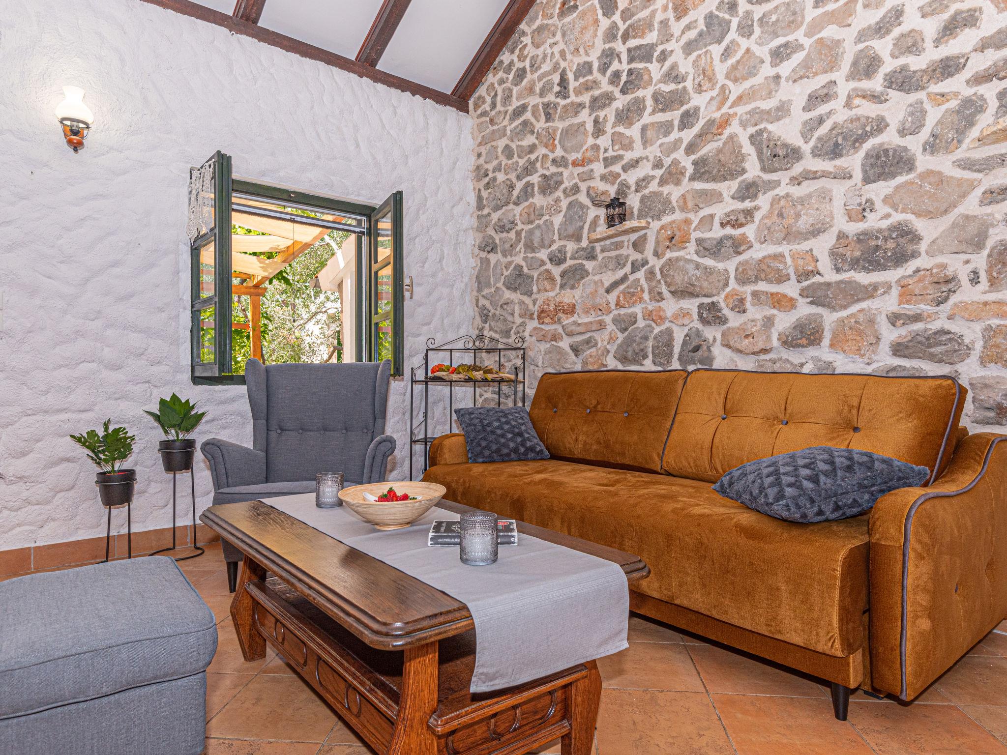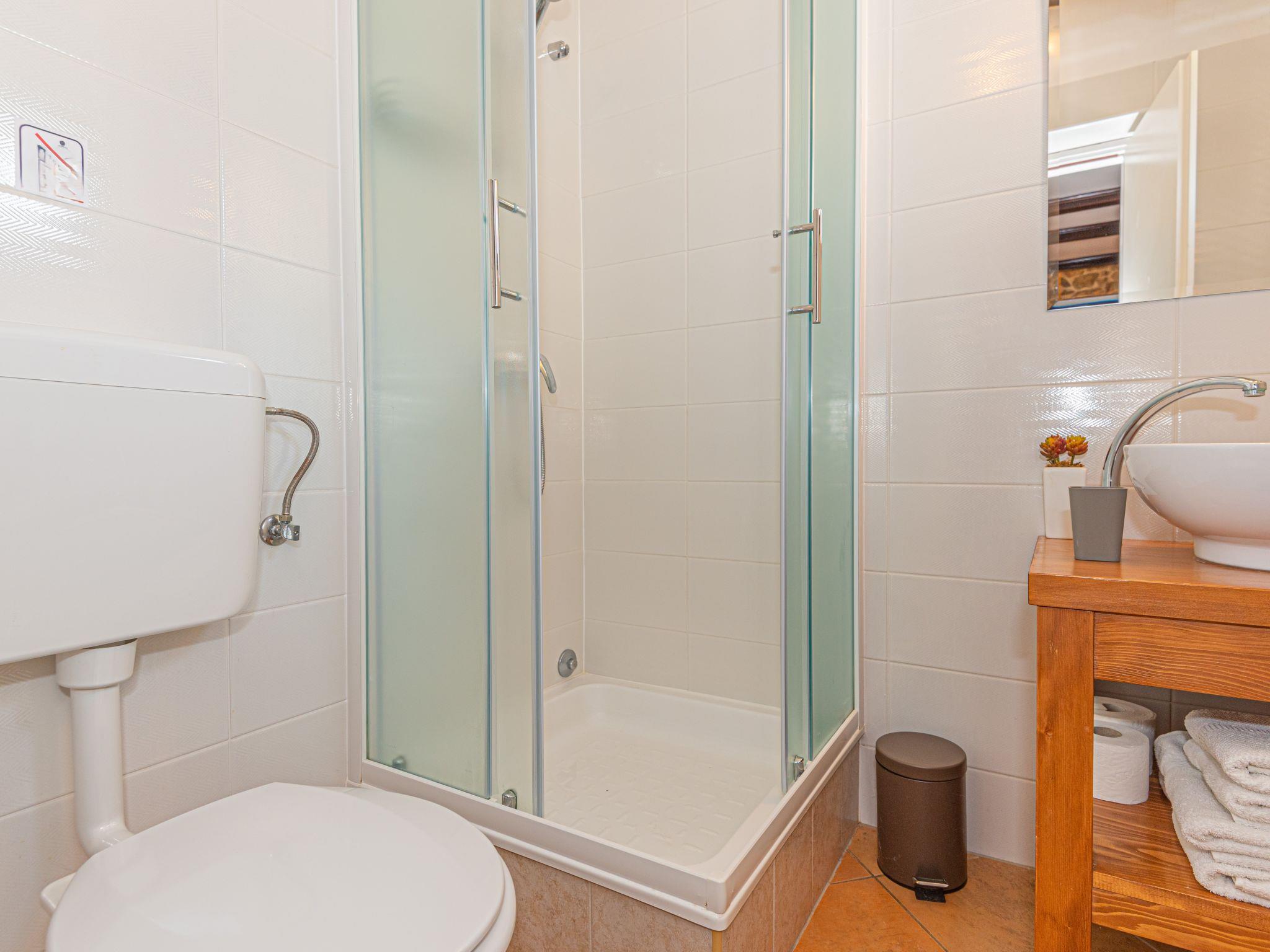 2-room house 94 m2 on 2 levels. Living/dining room with satellite TV (flat screen), air conditioning. Exit to the terrace. 1 room with 2 beds (90 cm, length 200 cm), shower/WC. Open kitchen (oven, dishwasher, 4 gas rings, kettle, microwave, electric coffee machine). Shower/WC. Upper floor: open gallery with sloping ceilings, ceiling height 80 - 230 cm with 1 french bed (160 cm, length 200 cm). No heating option. Deck chairs. View of the swimming pool. Facilities: hair dryer. Internet (WiFi, free). Maximum 1 small pet/ dog allowed. Solar-powered energy. Electricity through solar energy system and therefore subject to fluctuations due to weather conditions. Limited use of electrical appliances (air conditioning, washing machine, dishwasher).